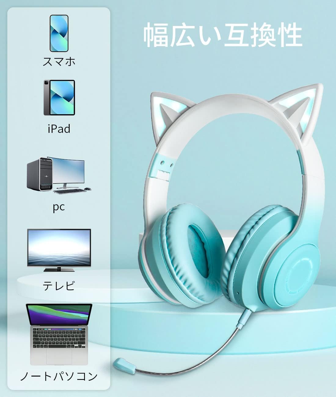 [Cute Cat Ears, LED Lights & Higher Sound Quality Experience] The cat ear design is cute, and the Bluetooth compatible headphones with LED lights flash and change color according to the rhythm, dance to the music, and play games. Sometimes the atmosphere gets lively. It's sparkly and looks very cute. With a 40 mm speaker, you can enjoy a wide range of sounds from powerful bass to natural mids and smooth treble. The music is more textured and richer in levels, and you can get good sound quality whether it's a powerful song or a slow light music. It has a wide range of applications, including movies, music, voice chat, radio, etc. [Comfortable to wear & Foldable & Easy to carry] Made of soft and comfortable high-grade PU protein leather, it dissipates heat and kisses your skin, eliminating discomfort such as pressure and stickiness. There are very few. Adopts a telescopic bracket design, the size of the bracket can be adjusted according to the head size. Lightweight design allows you to wear it for a long time without getting tired. The ear pads are designed to fold inward, providing a comfortable fit that wraps around your ears and a high degree of airtightness. Foldable design not only saves space but also makes it convenient to carry. Suitable for commuting to work or school outdoors.