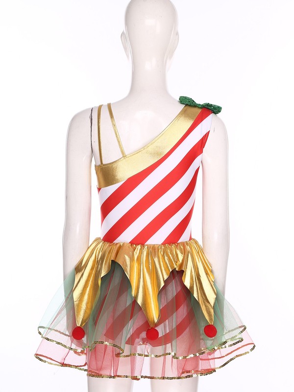 The asymmetrical shoulders design is a trendy element, adding a touch of uniqueness and modernity to the classic Christmas-themed dress.