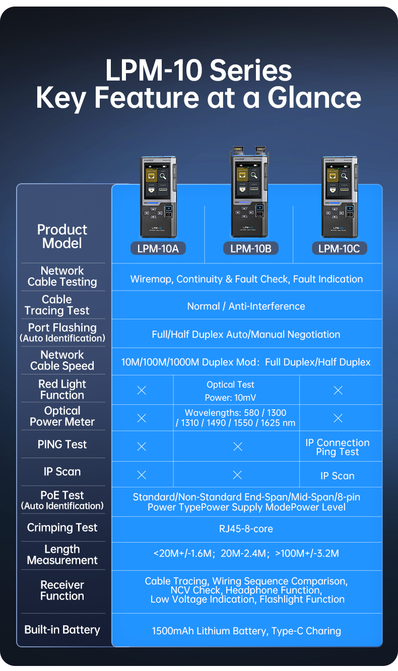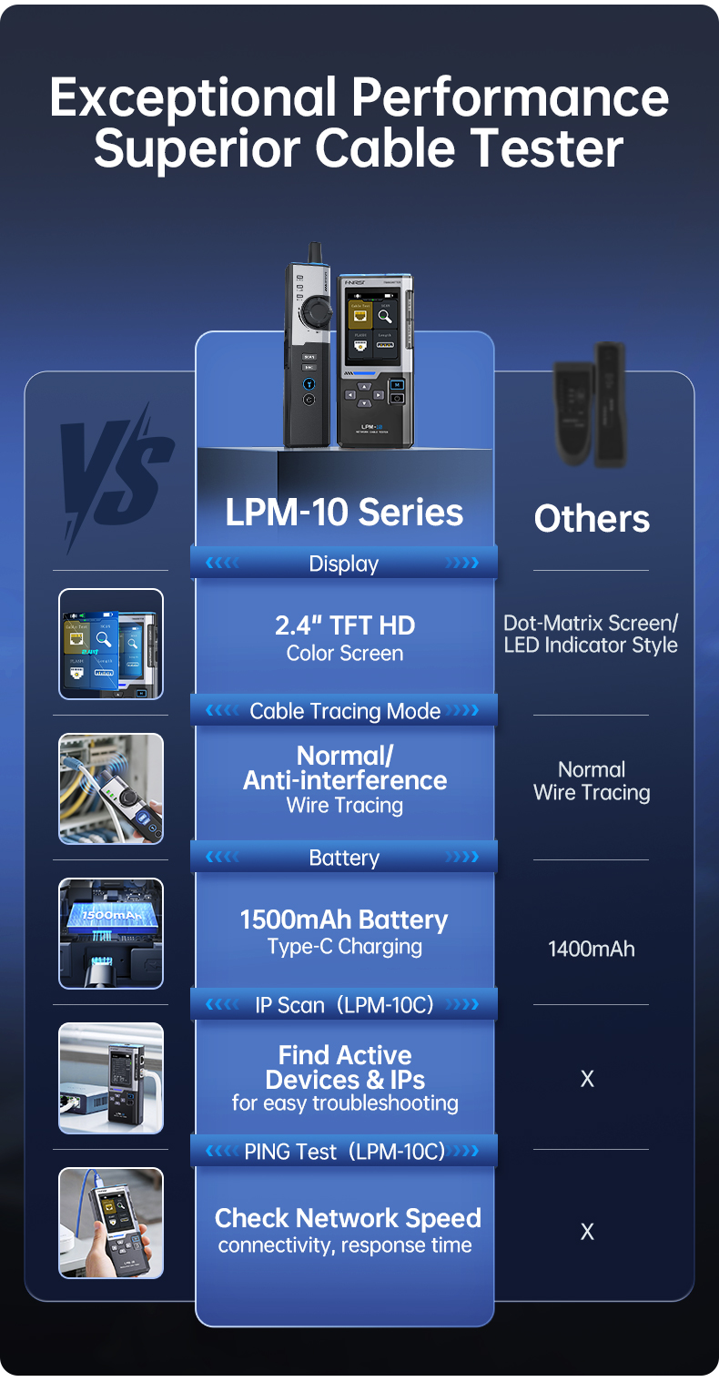 LPM-10 is a multifunctional intelligent line finder, a professional instrument for measuring and locating network lines, and plays an important role in network cabling, troubleshooting, etc. It has the characteristics of easy operation, powerful functions, high precision, and wide applicability, and can meet various needs in network cabling, detection and maintenance work. Whether it is a network technician or a network manager, you can use the multifunctional intelligent line finder to greatly improve work efficiency, reduce work difficulty, and ensure the normal operation of the network.