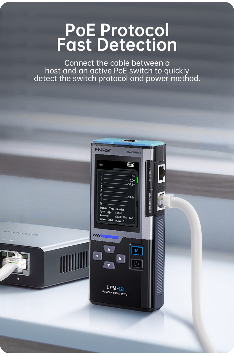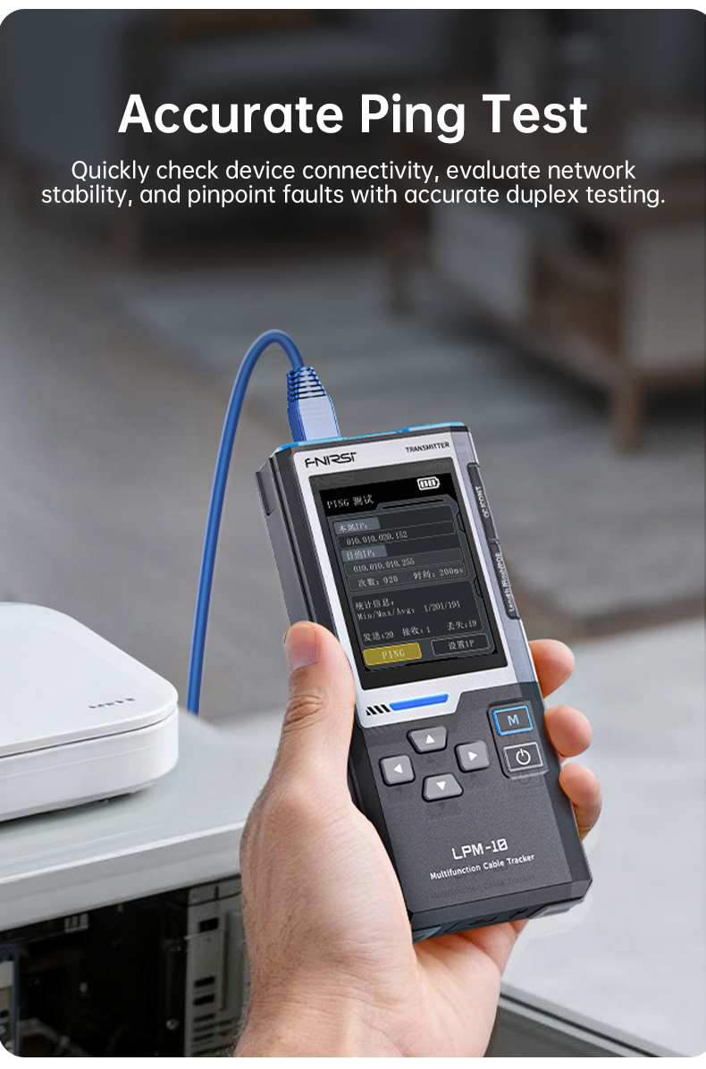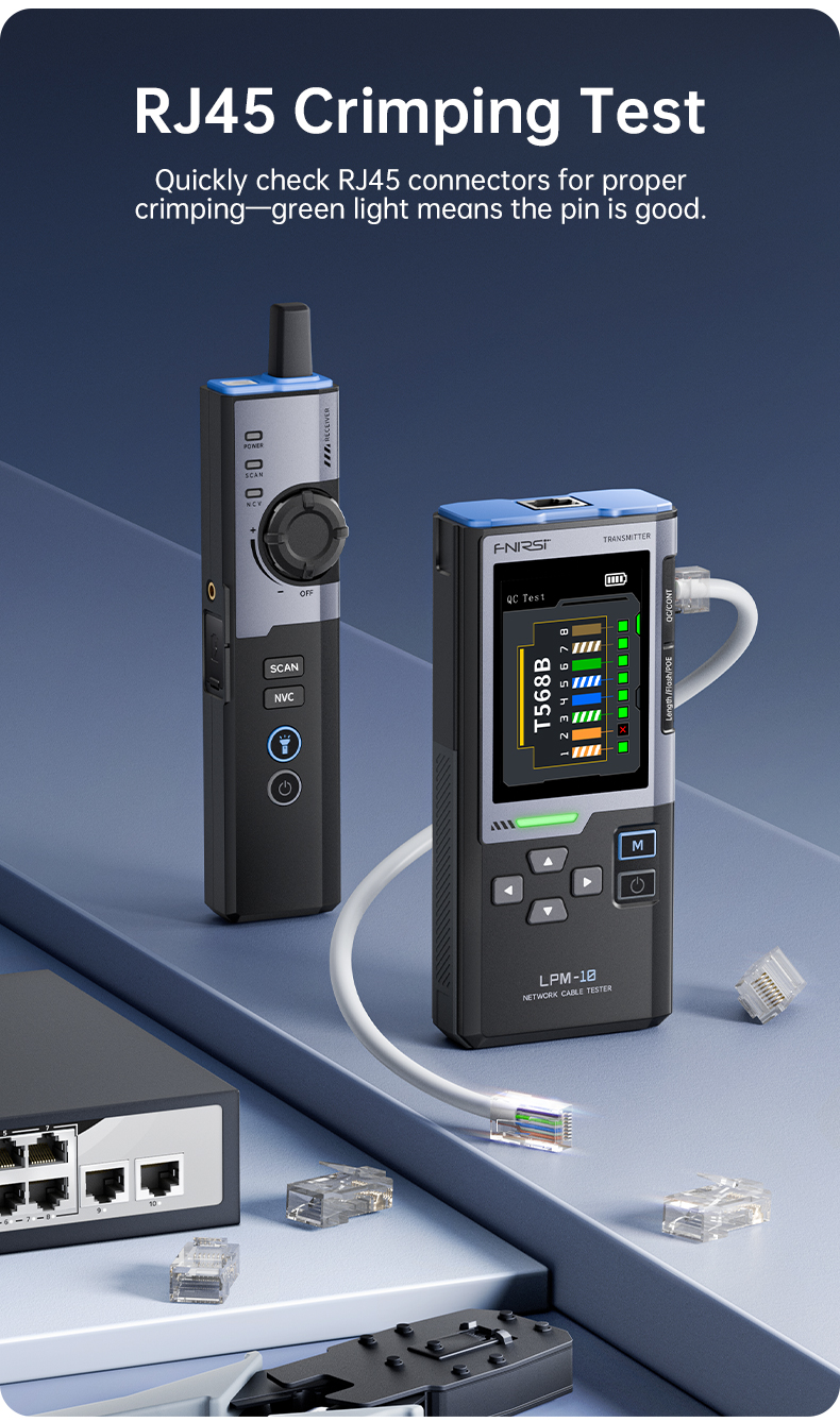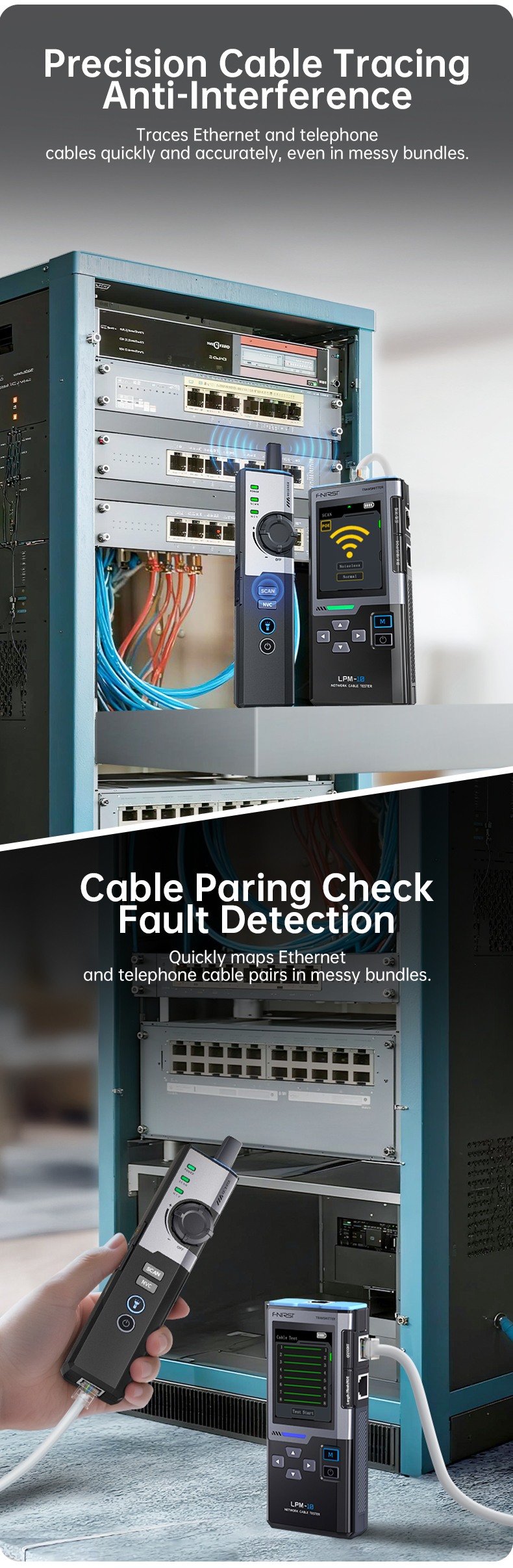 Professional line search: LPM-10 multi-function intelligent line search instrument integrates line search, length test, crimping test, network cable speed test, anti-interference and noise-free, port flashing and other functions, and is a powerful assistant for network cabling and troubleshooting.