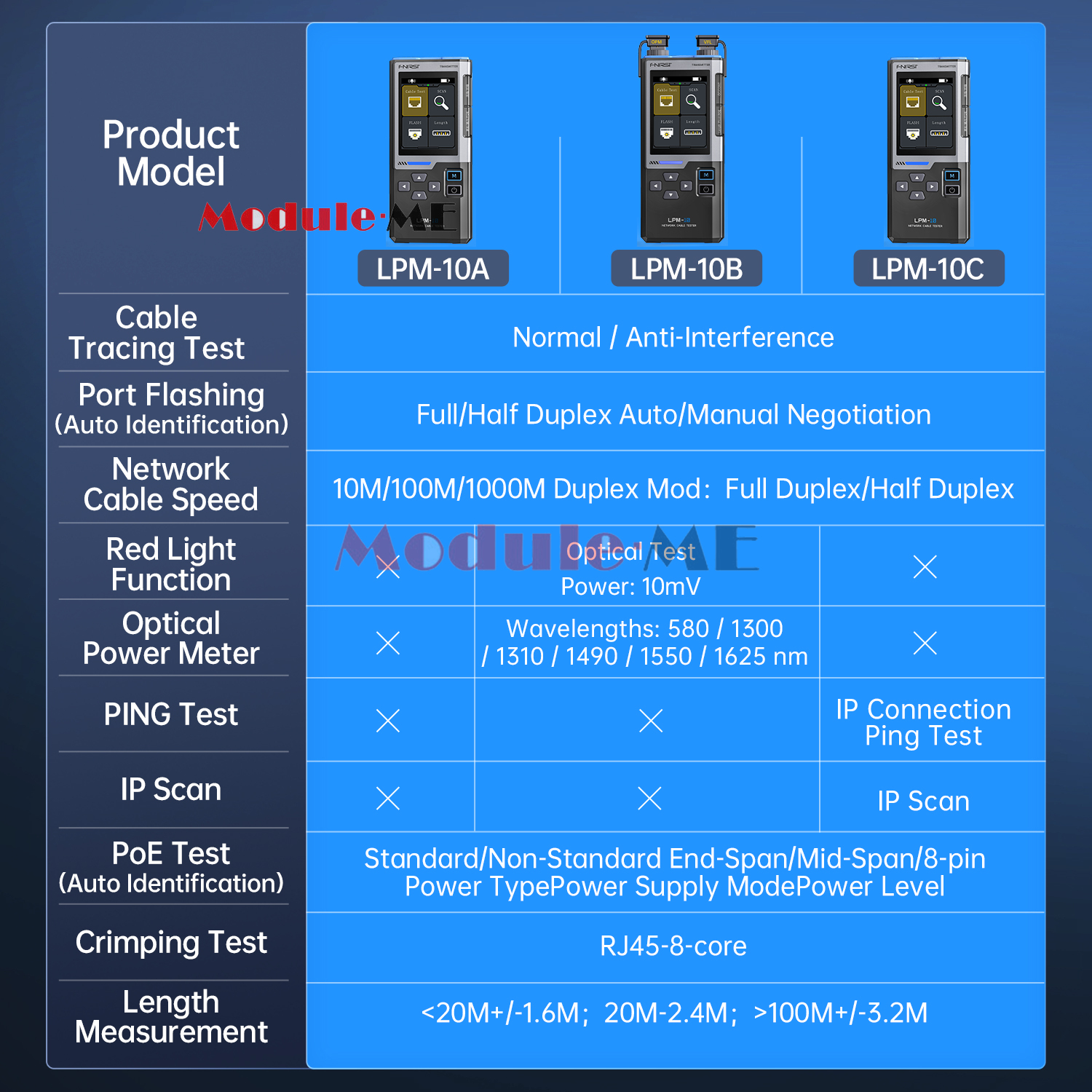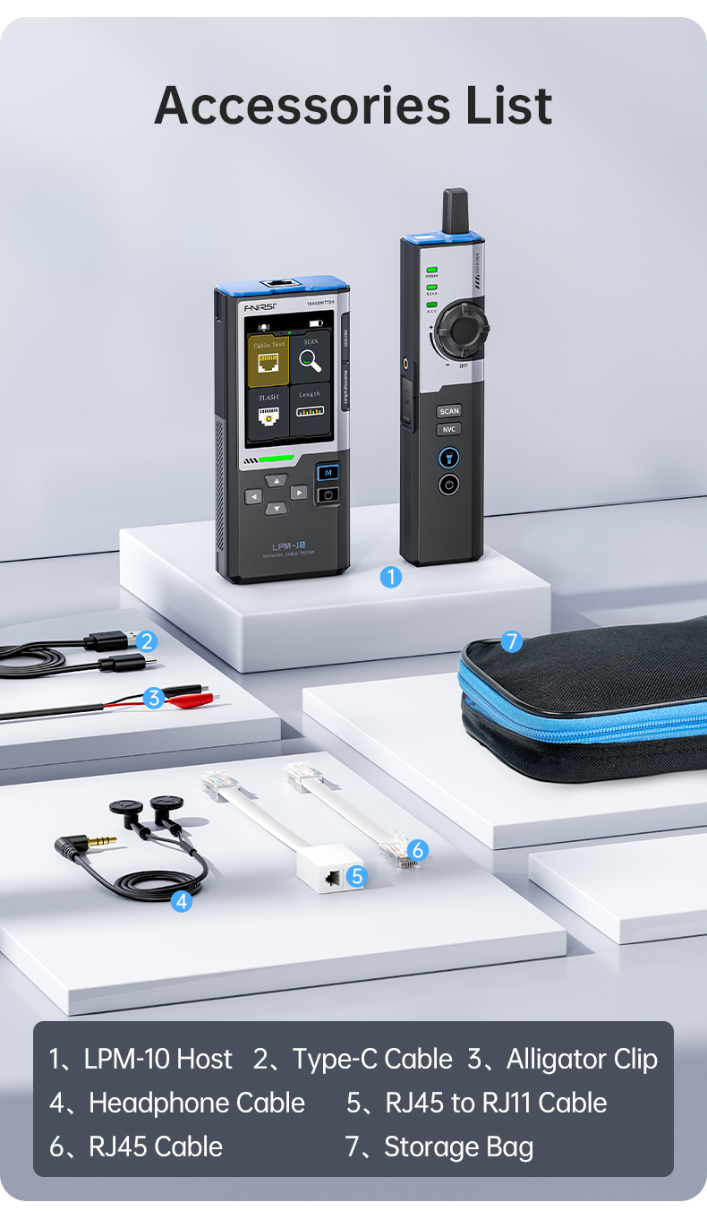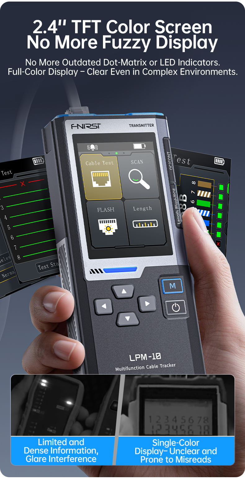 Professional line search: LPM-10 multi-function intelligent line search instrument integrates line search, length test, crimping test, network cable speed test, anti-interference and noise-free, port flashing and other functions, and is a powerful assistant for network cabling and troubleshooting.