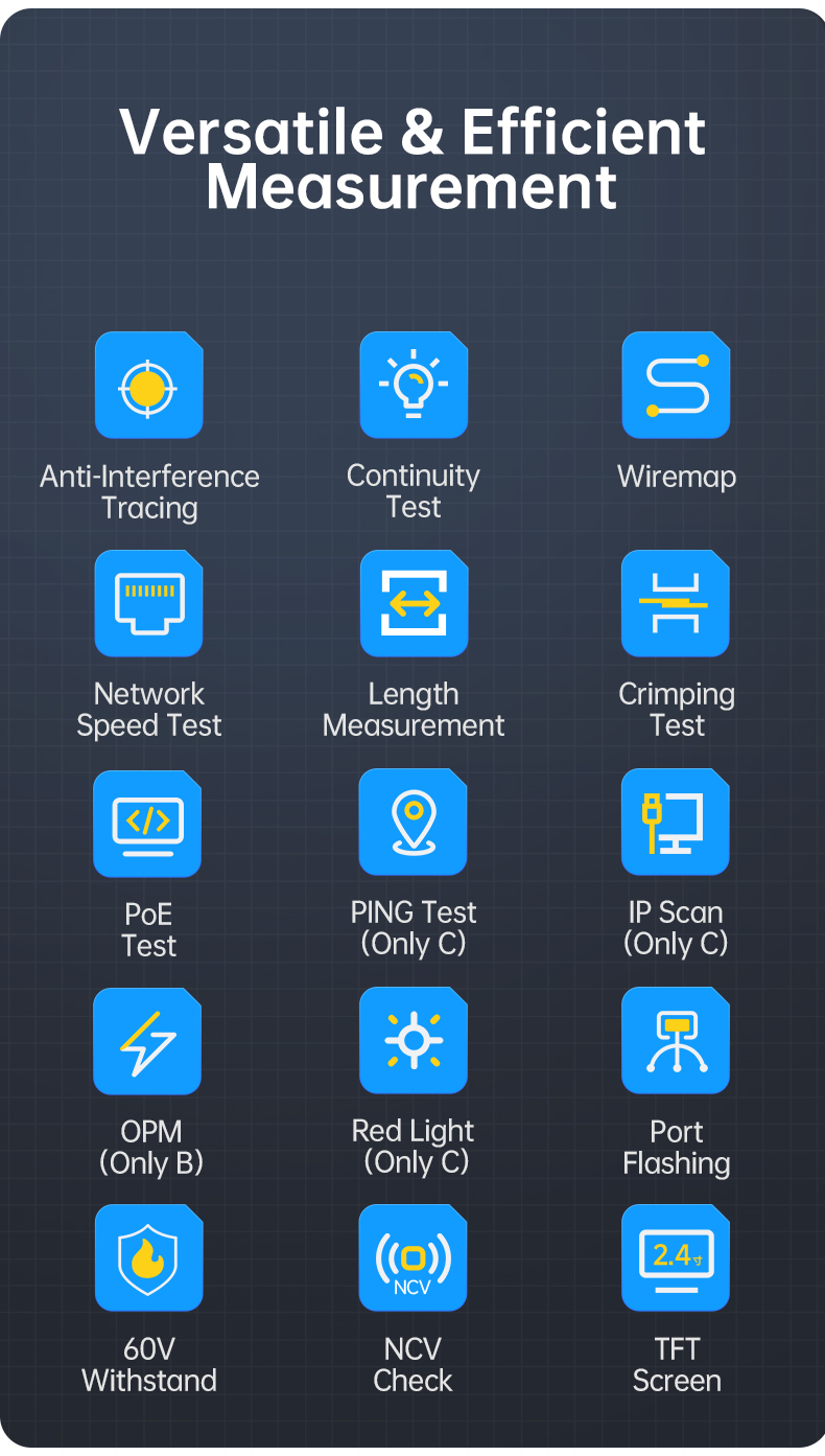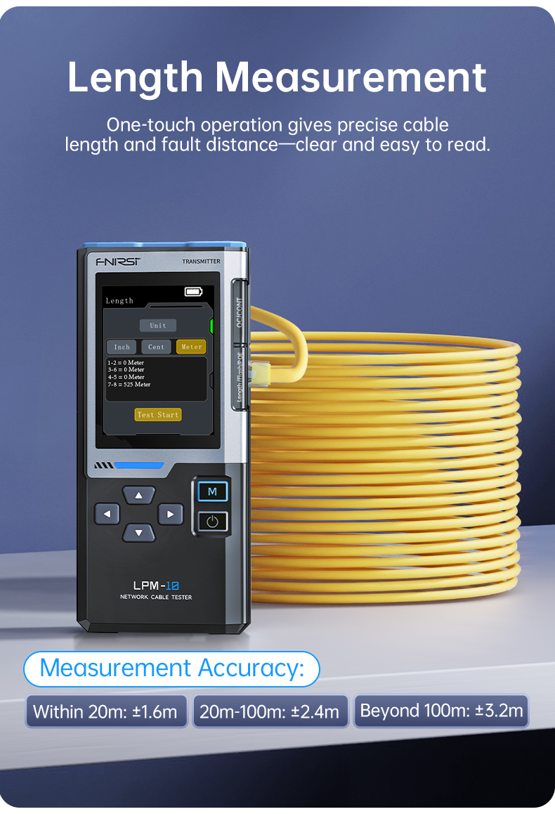 Accurate measurement: Adopt high-quality measurement technology to ensure the accuracy of network cable speed, length test and crimping test, and provide reliable data support for network maintenance.