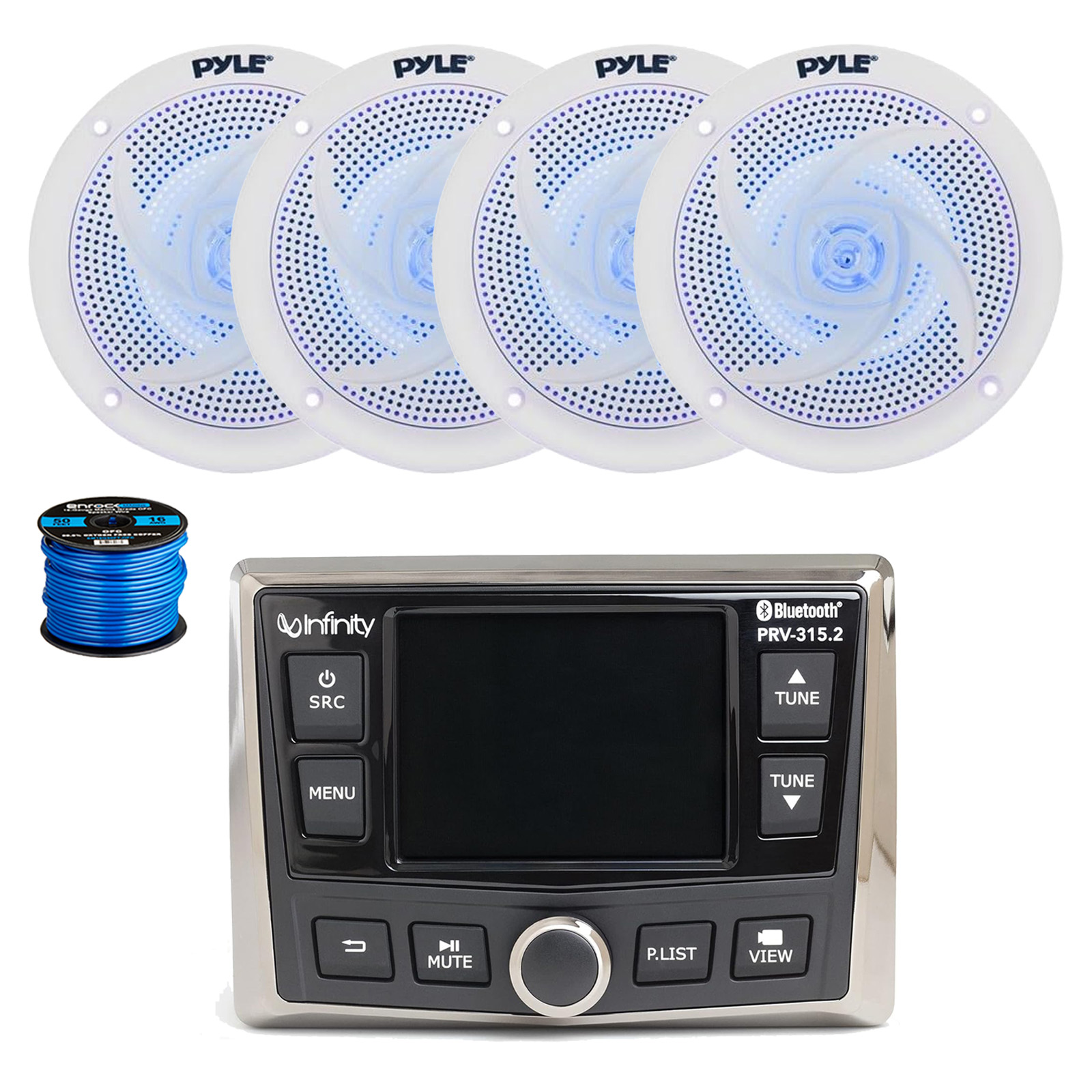 • PACKAGE BUNDLE INCLUDES: Infinity PRV-315.2 Marine Gauge Mount USB Bluetooth AM/FM/WeatherBand Tuner Radio Receiver, 4X 6.5" 240 Watt 2-Way Slim Low Profile Blue Flashing LED Audio Speakers (White) w/ Wire