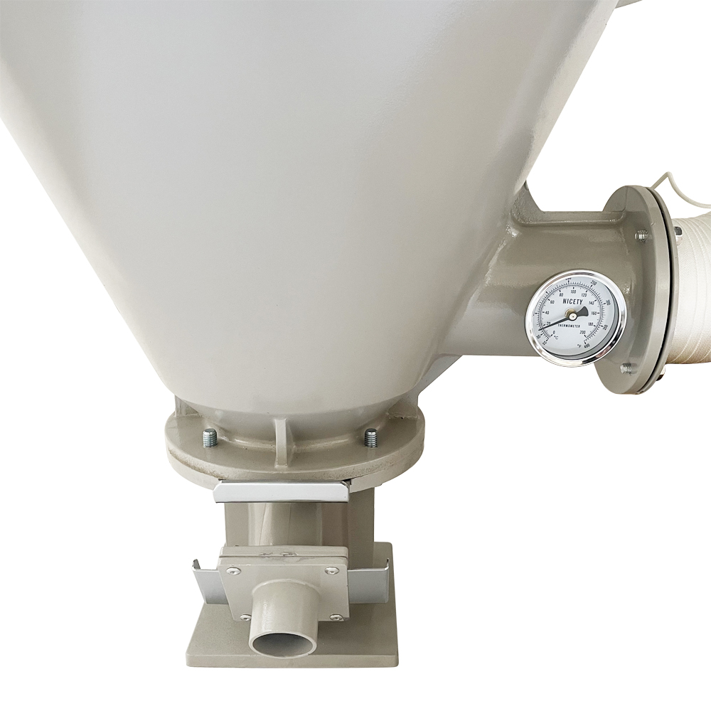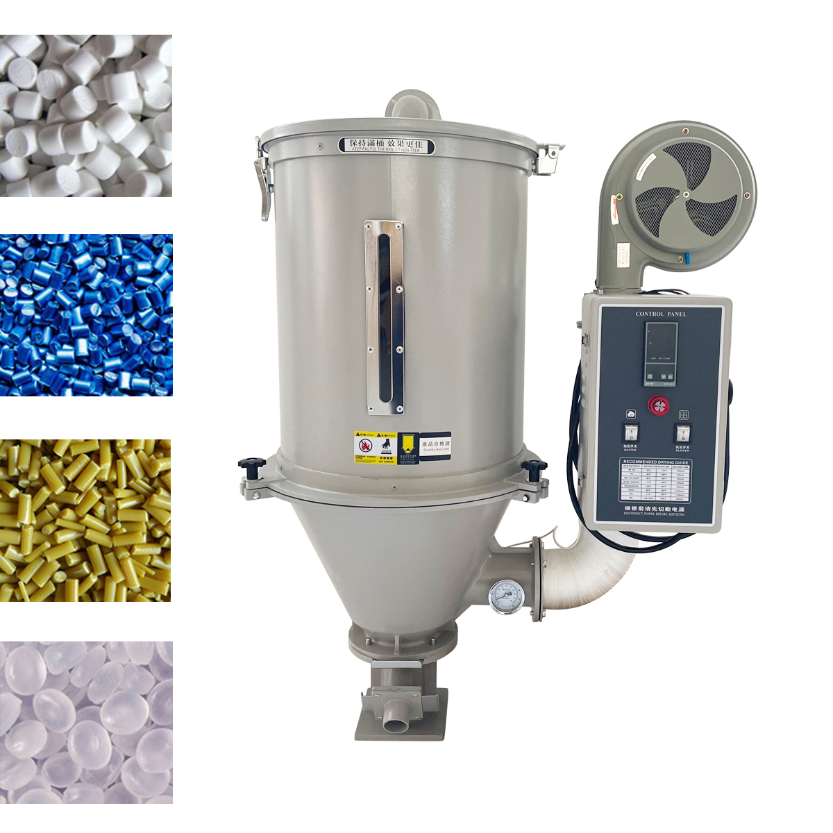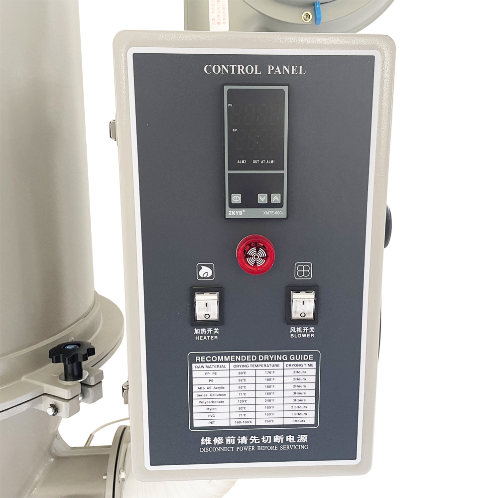 1.Working principle: through the fan supply air, blowing to the heating tube in the heating cylinder, and then controlled by the temperature controller air supply temperature, uniform flow in the drying drum, to the purpose of drying. 2.The contact part of the machine and raw materials are made of stainless steel, so that the raw materials are not contaminated. 3.The heating tube is elbow type, effectively prevent dust accumulation. 4.This machine has uniform hot air distribution, high drying efficiency, temperature controller adopts proportional deviation type,temperature difference is controlled within plus or minus 3 degrees. 5.The machine can dry the raw materials which are wet due to packaging and transportation, and is used to remove the moisture on the surface. It is suitable for PP, PE, ABS, PVC and other raw materials. 6. Stainless steel buckle, strong and durable, good sealing. 7. Stainless steel conical screen, uniform bulk material. Note: