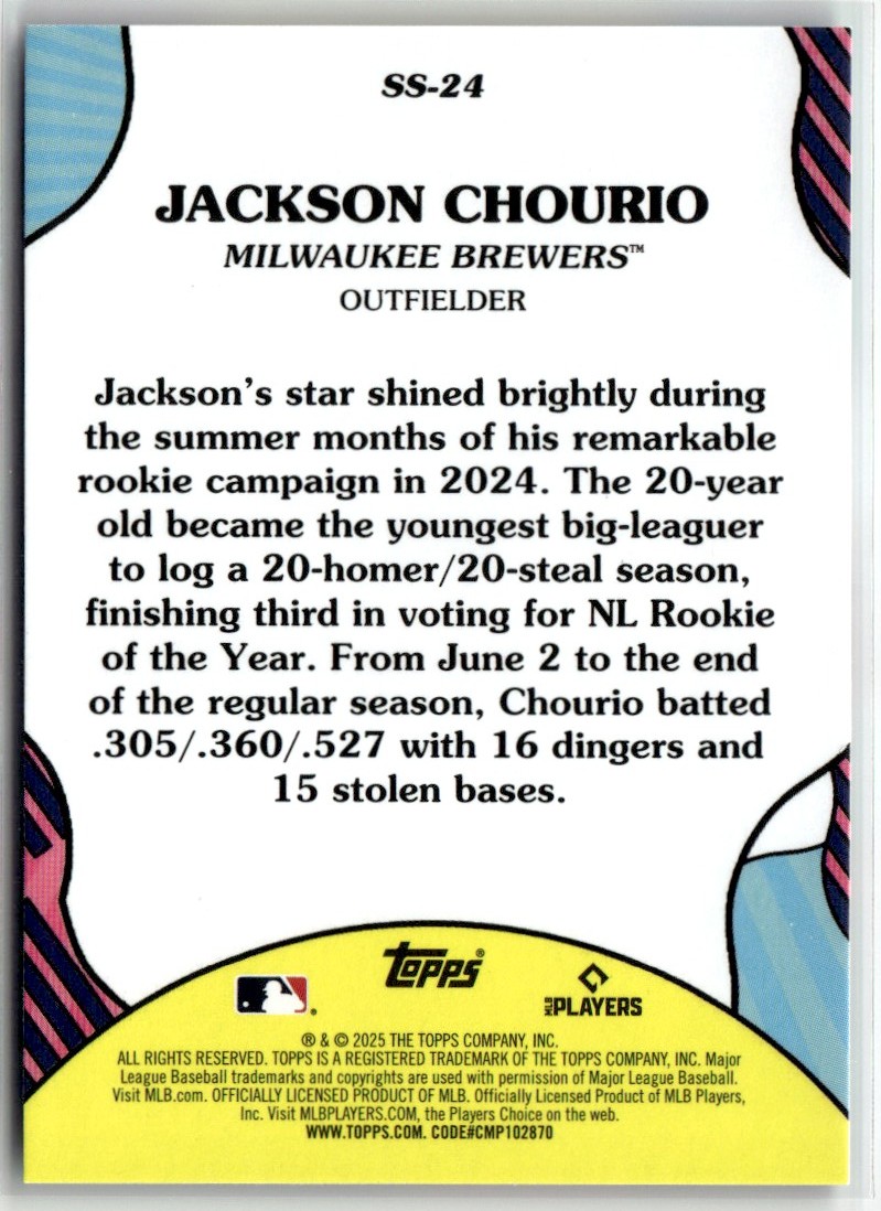 | Jackson Chourio 2025 Topps Summer Superstars Milwaukee Brewers #SS-24 | ||||||||||||||||
