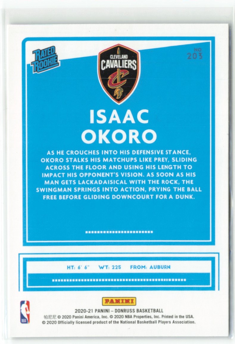 | Isaac Okoro RC 2020-21 Donruss Choice Mojo Rated Rookie Cleveland Cavaliers #203 |