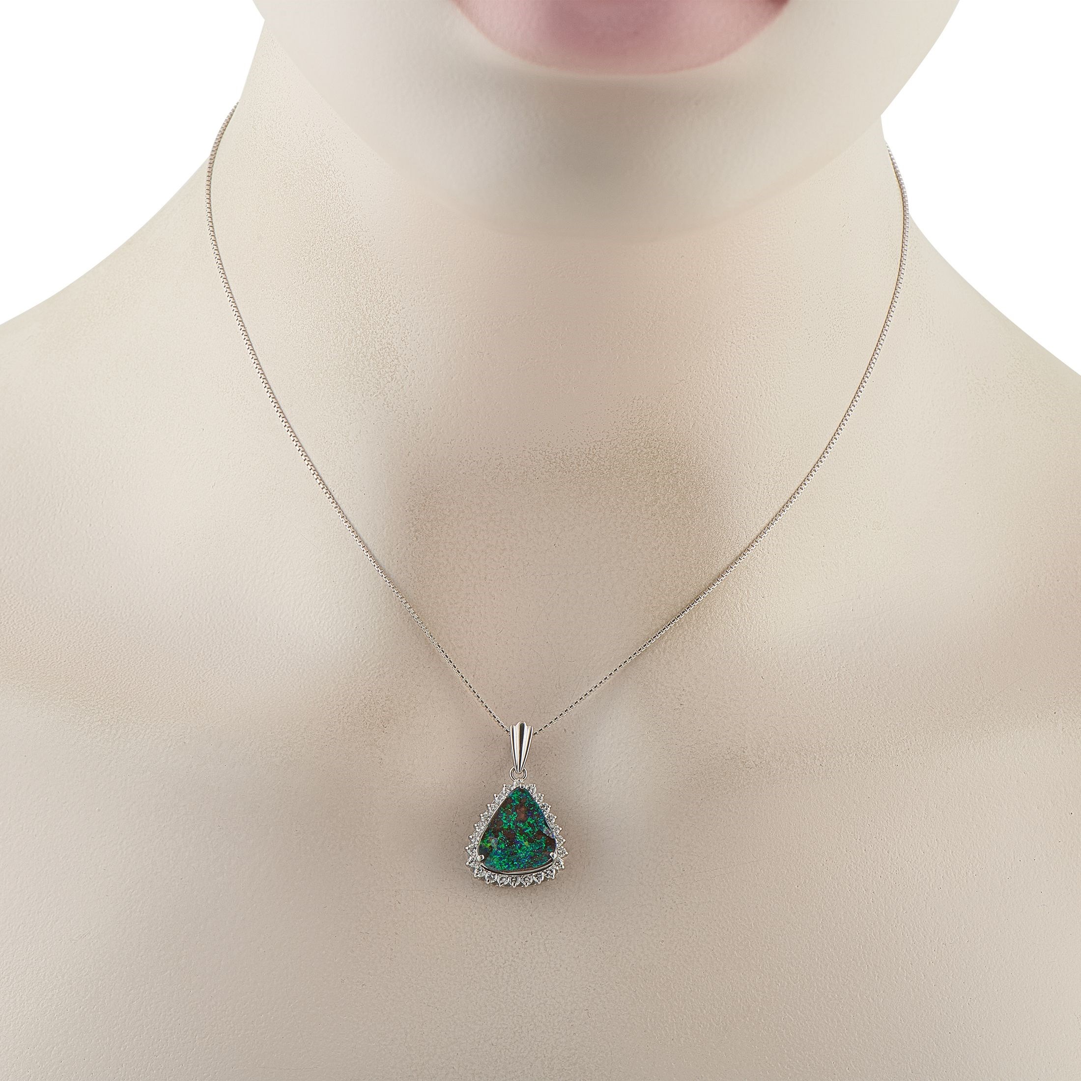 A genuinely unique piece, this LB Exclusive necklace is designed with a 4.38-carat opal offering vibrant flashes of green, bronze, and blue-violet hues that seem to shift with every moment. The remarkable play of color is complemented by the gem's custom-cut appearance, a nuanced triangular form with subtle, rounded corners. Surrounding this dynamic central gem is a halo of diamonds, perfectly tracing the opals' distinctive curves. The pendant is held by a ridged bail suspended from a platinum box chain.Offered in estate condition, this LB Exclusive Platinum 0.60 ct Diamond and 4.38 ct Opal Necklace comes with a gift box.