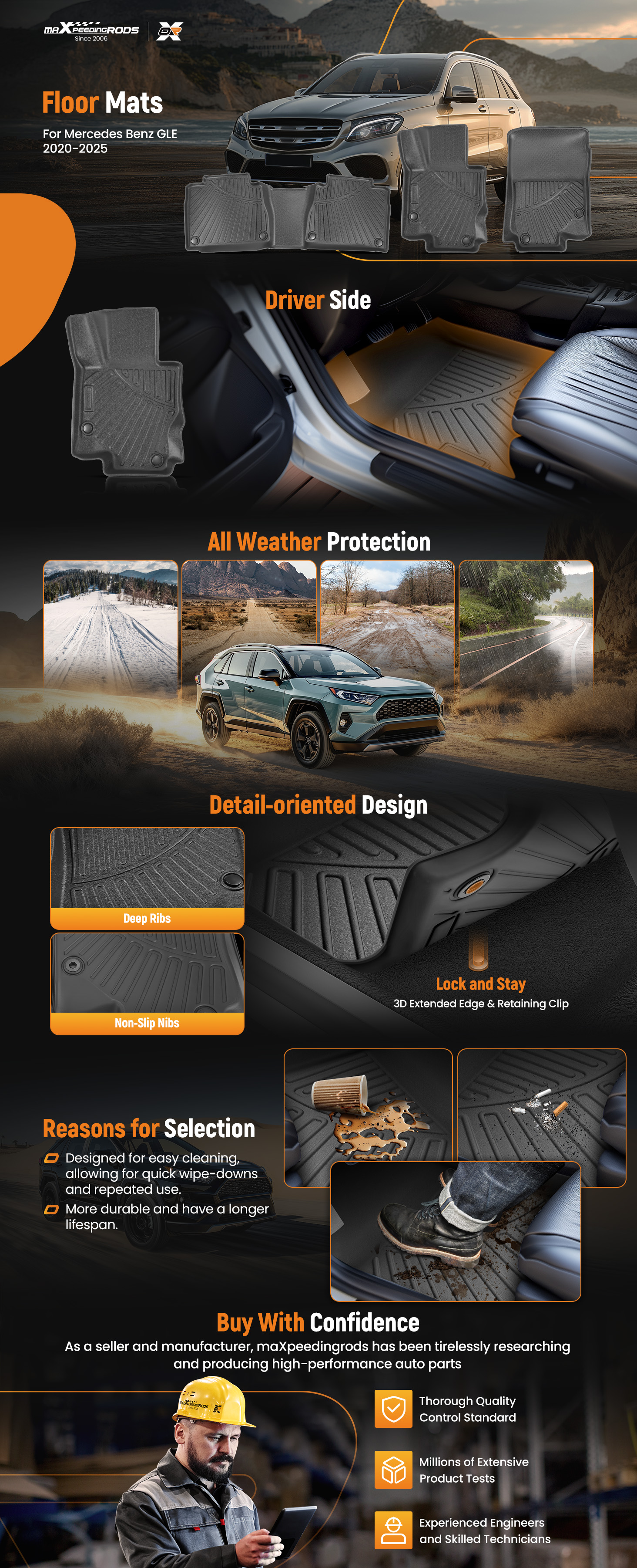 - All-weather protection, Unique designed channels and raised edges can effectively trap the liquid, snow, sand, etc.