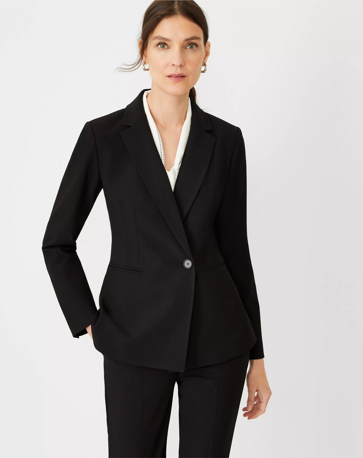 Details: Refined four-way stretch holds its shape while flattering yours - so you stay polished and comfortable from A.M. to P.M. Notched lapel. Long button-open sleeves allow for versatility in styling. Double breasted button front. Front flap besom pockets. Back vent. Lined. Fitted. Hits at hip. Machine Washable. Style: 831762