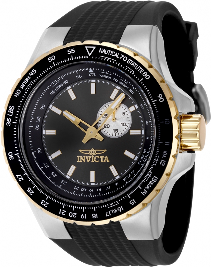 Gunmetal dial enhanced by gold-tone hands. Silver-tone and Gold stainless steel case with a black silicone band. Quartz movement. 100 meters / 330 feet water resistance. bezel. Scratch Resistant Mineral crystal. Solid caseback. Buckle clasp. Pull / Push crown. Case size 50 mm x 15.0 mm. Band 32.5 mm x 8.75 incheslong. Invicta 49718 Aviator Watch.