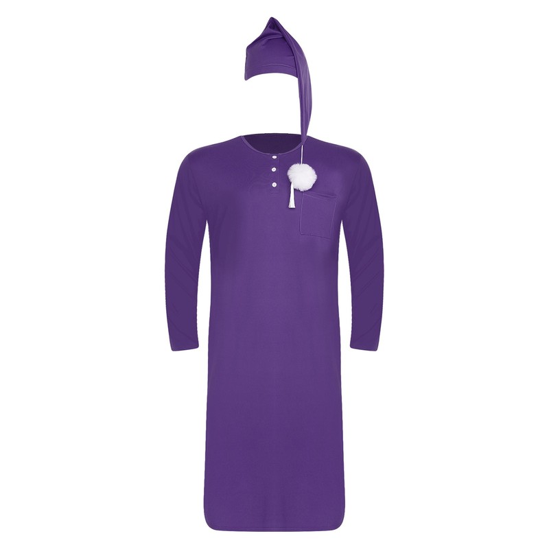 2-piece set includes long robe and hat. The robe is designed with long sleeve, round neck with buttons, pullover style.