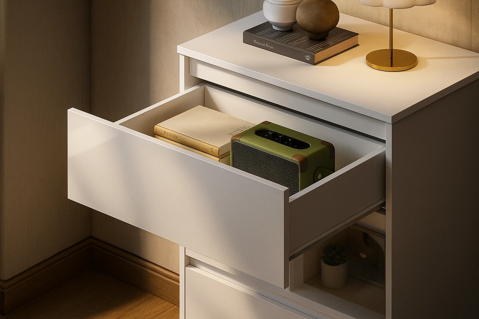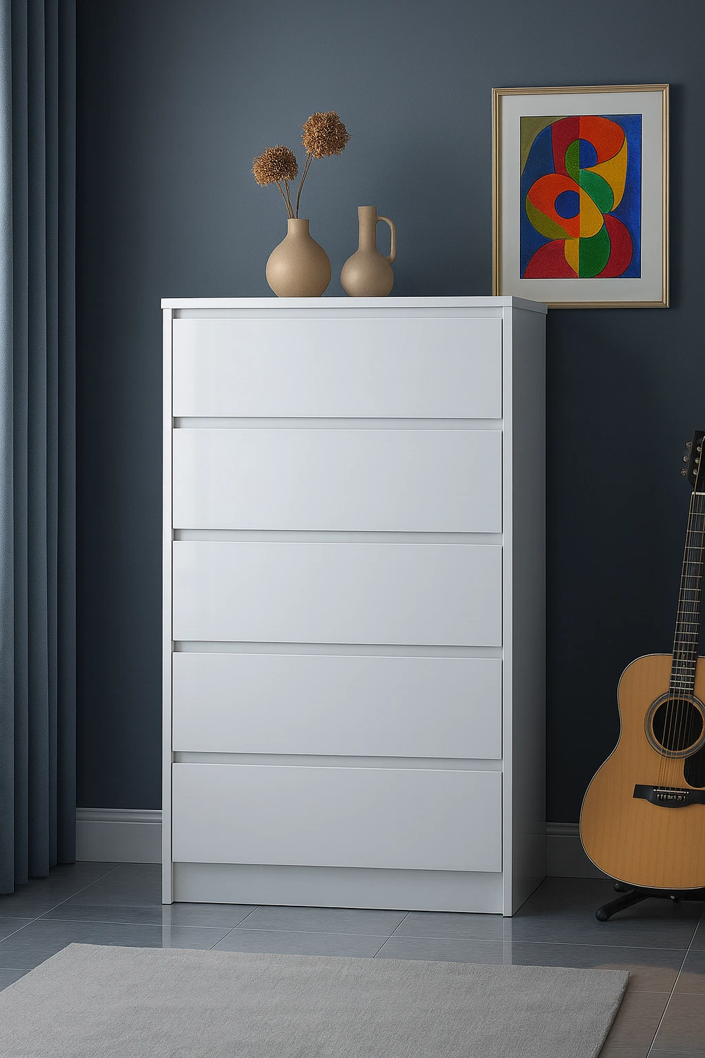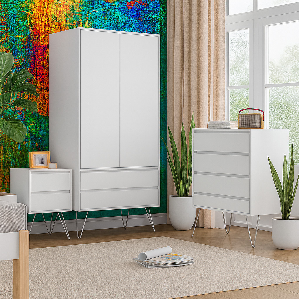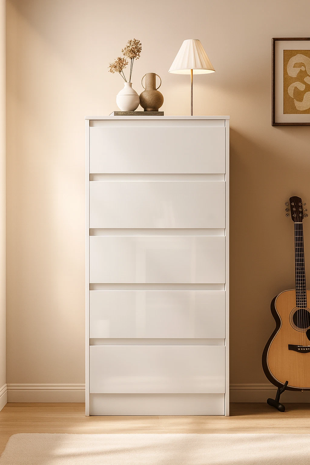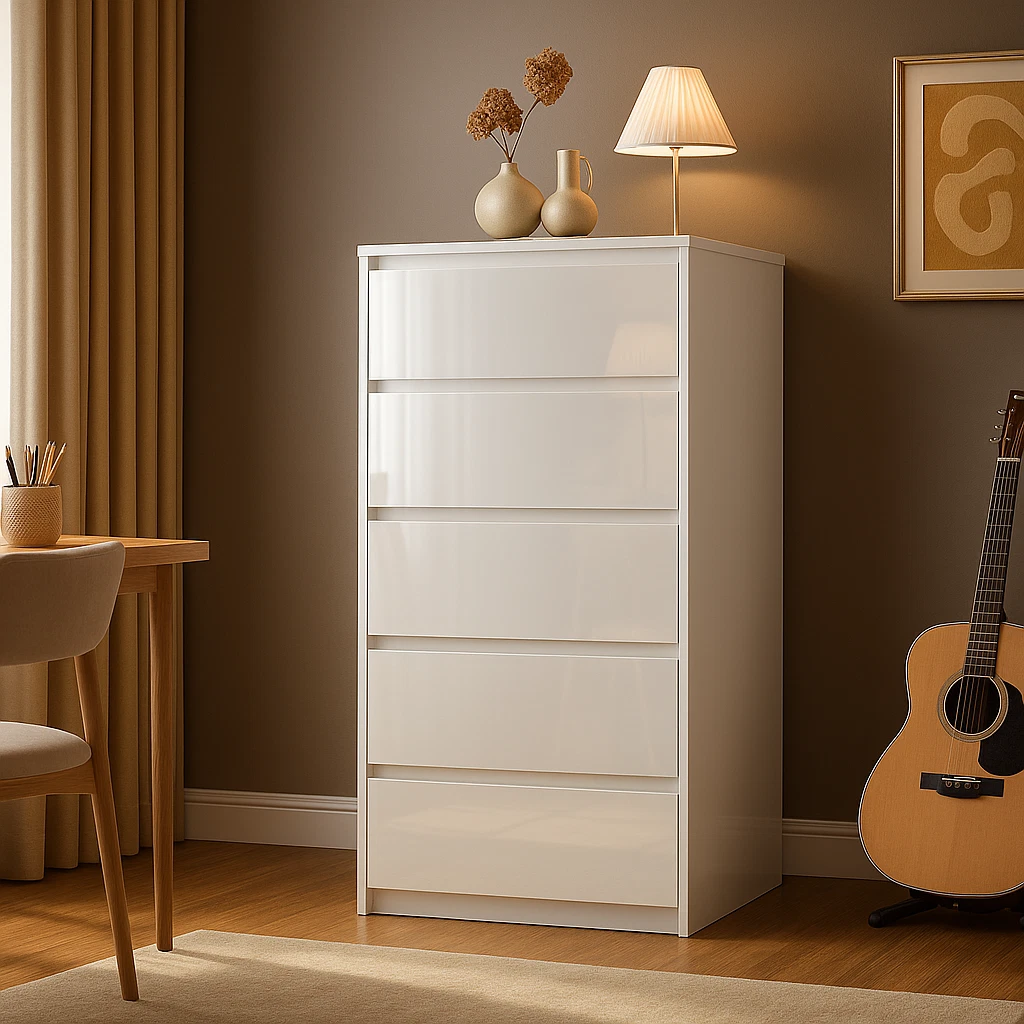 With its clean, handleless design and durable structure, this chest provides generous storage space while maintaining a minimalist aesthetic — ideal for keeping your room tidy and stylish.
