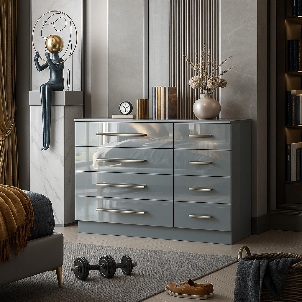 Crafted from high-strength engineered wood, this chest is built to last. Each drawer is precisely manufactured to fit flush, ensuring a smooth and stable operation every time. The luxurious high gloss drawer fronts contrast beautifully with the matt-finished frame, creating a sleek, contemporary look that complements any modern or traditional bedroom décor.