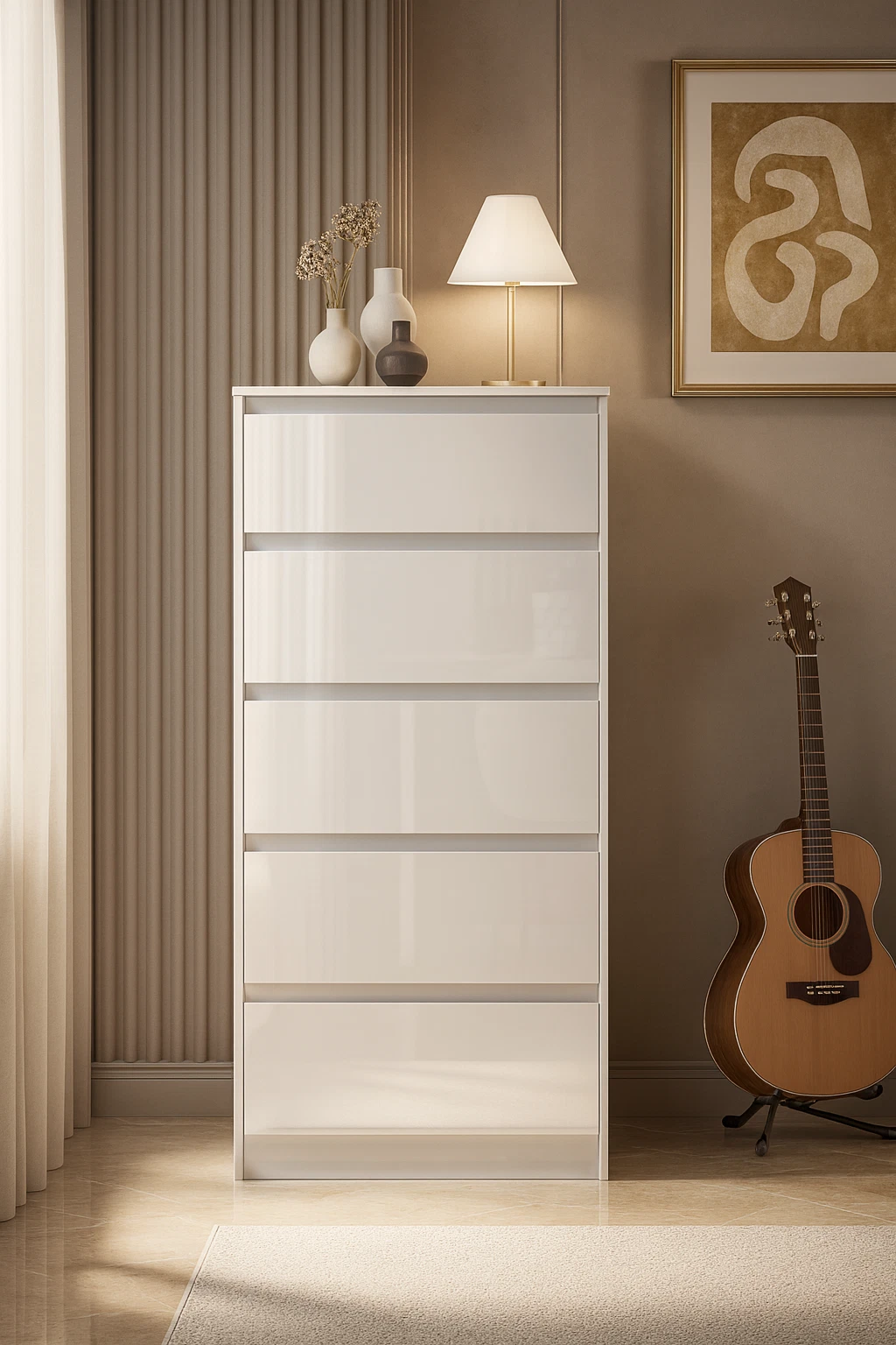 This 5 Drawer Handleless Chest is a sophisticated addition to our premium high gloss bedroom furniture collection — offering the perfect balance of style, practicality, and modern design.