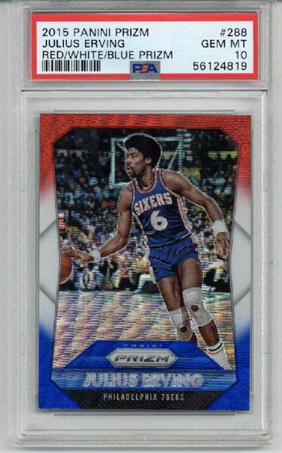 The item you are buying is a PSA GRADED and ENCAPSULATED 2015 Panini Prizm Red White Blue Prizm #288 card of Julius Erving. The card was graded a 10 by PSA. This card comes from my personal collection. The plastic of the encapsulation has no cracks and is scratch free.