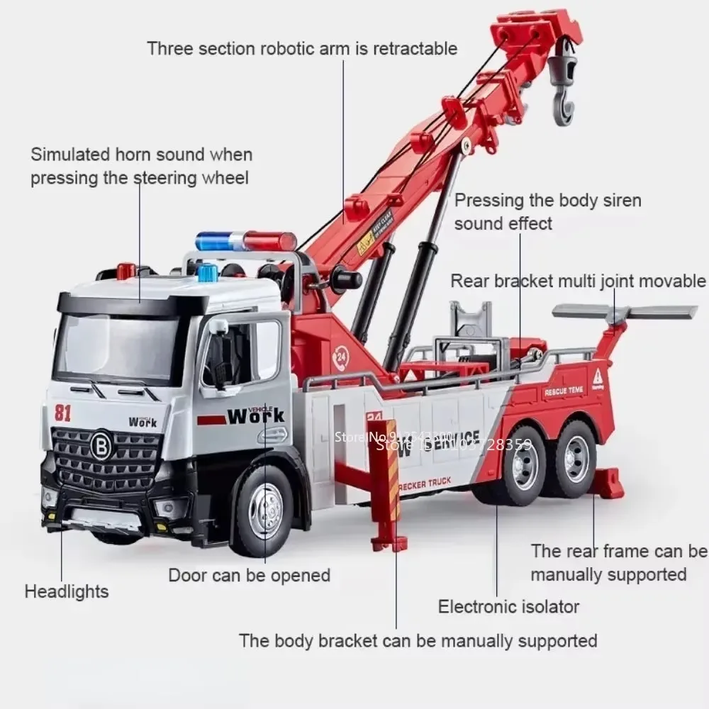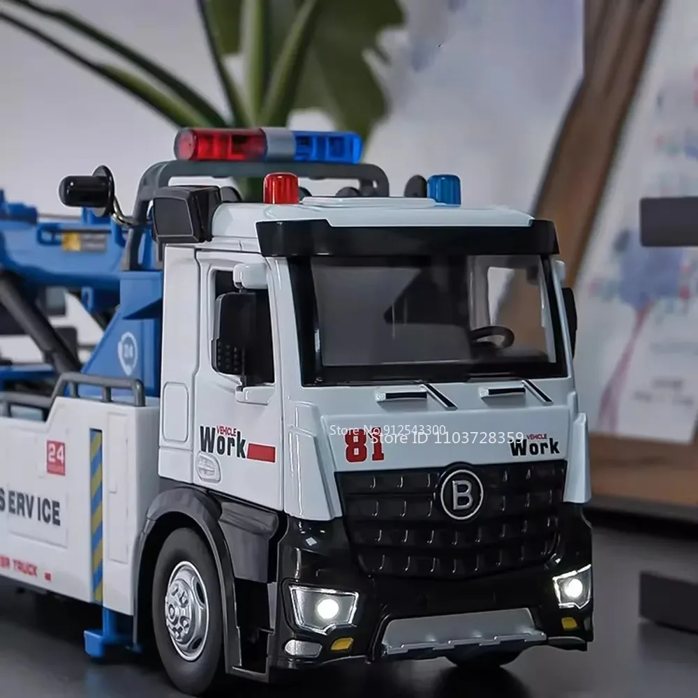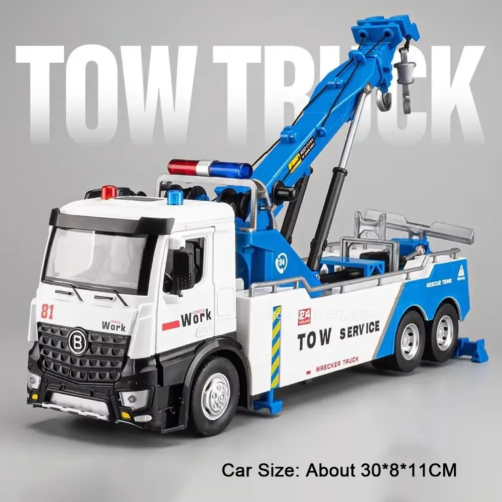 This stunning 1:18 scale miniature wrecker truck model showcases a vibrant blue and white color scheme, representing an exquisite combination of style and functionality. Not only does it feature a robust alloy diecast construction with a metal body and plastic chassis, but it also includes realistic sound and light functions. Its design boasts operable doors and a fully movable bracket, making it an engaging addition for both play and display. The extendable three-section robotic arm enhances its utility, while the sturdy rubber tires ensure durability. With an emphasis on craftsmanship, it serves as an impressive piece for collectors and is suitable for ages 14 and above.Key Features of This Miniature Wrecker Truck