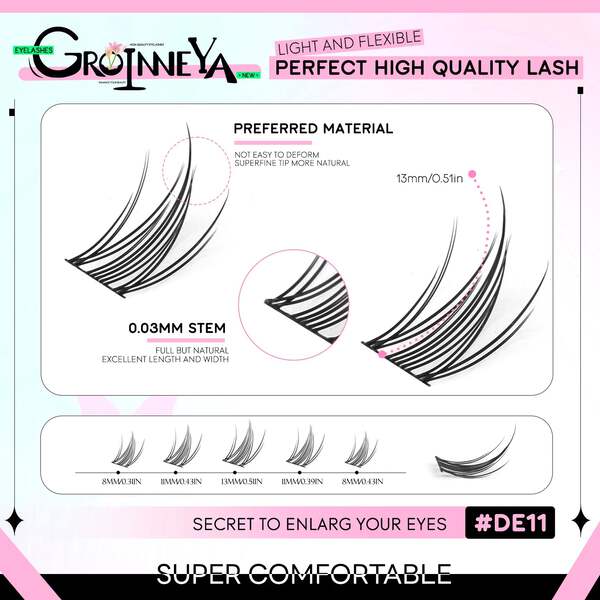 GROINNEYA lash clusters feature a flexible band that adapts to your lash line for a more comfortable fit. The lightweight construction supports all-day wear and blends naturally with your own lashes when applied correctly.