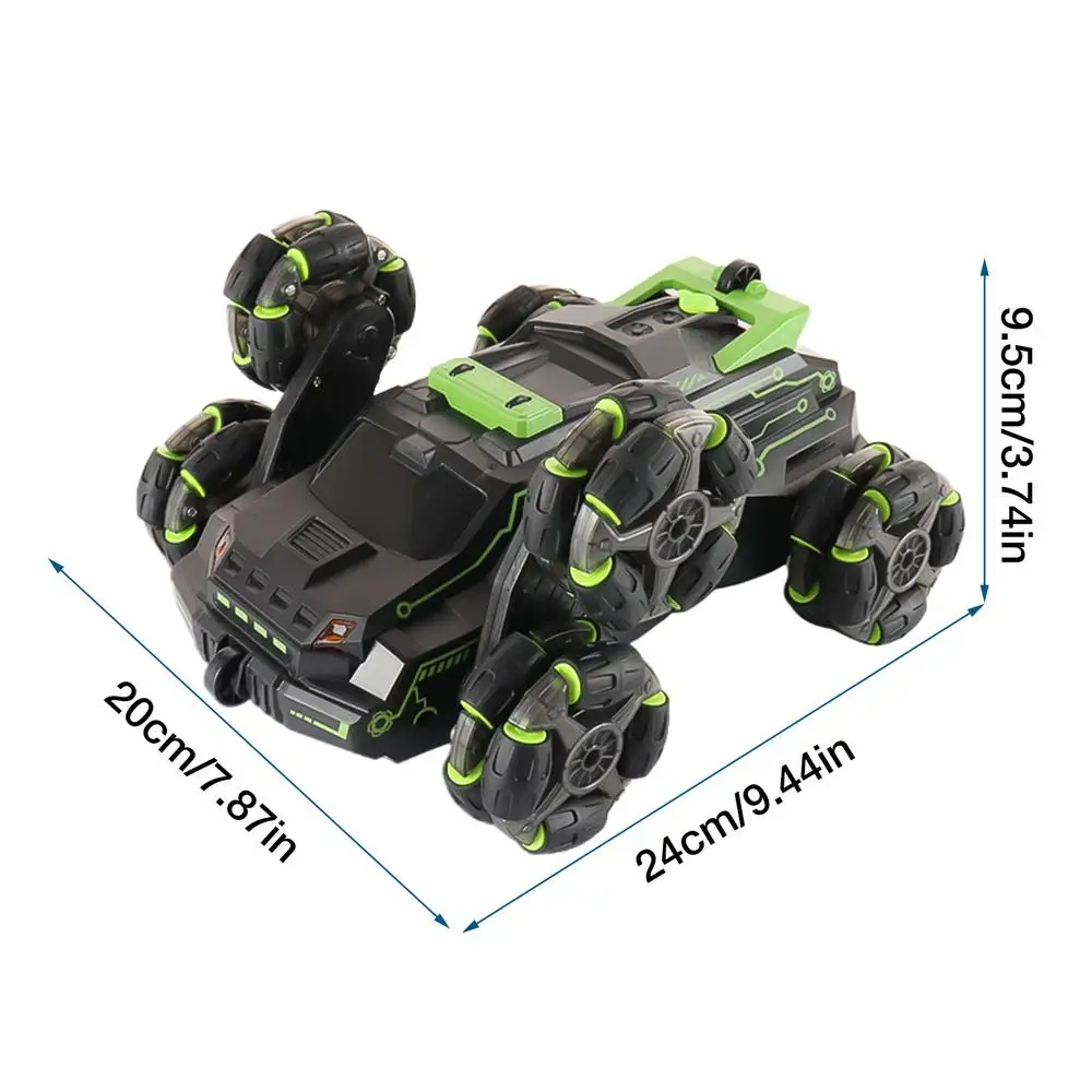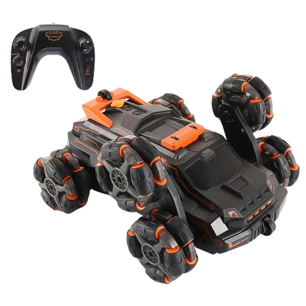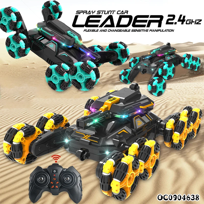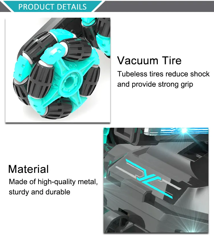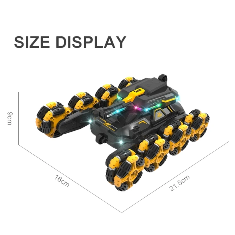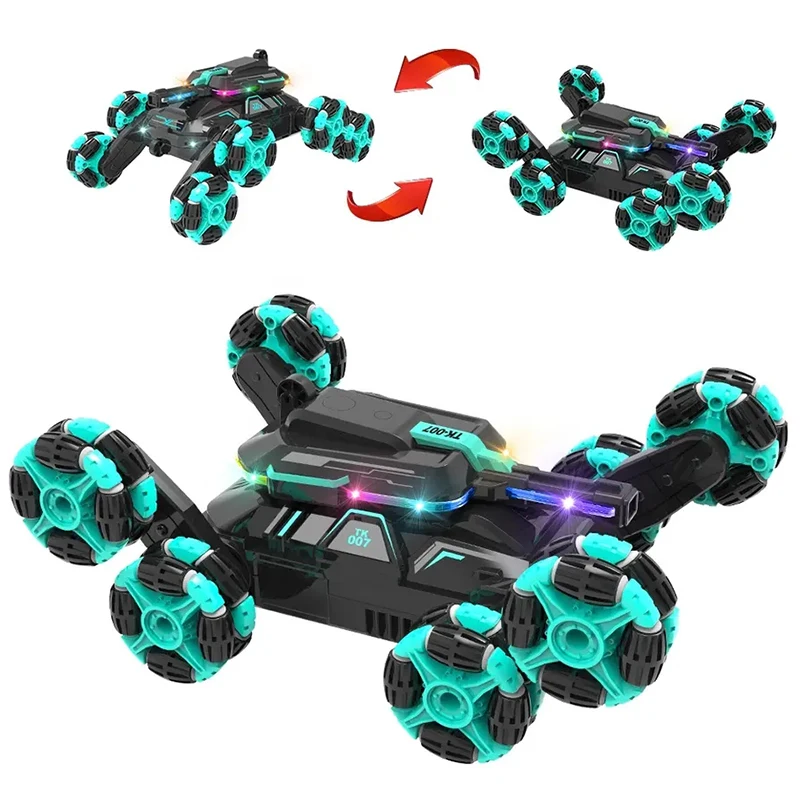 2.4GHz, color LED lights , eight wheels climbing stairs stunt function, back flip walking function, drift olive wheel walking function. Forward, backward, left turn circle, right turn circle. With music mode switching key. With light mode switching key