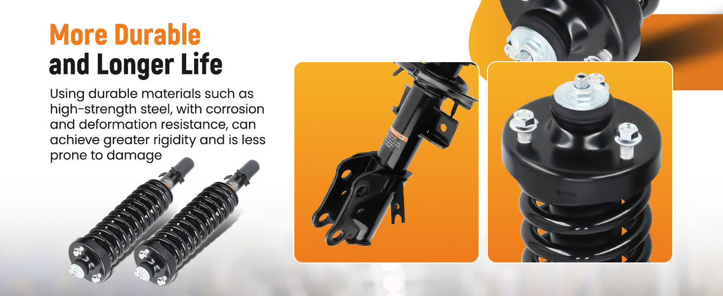 - They effectively reduce the bumps and vibrations of the vehicle body, creating a smooth suspension system for a comfortable and stable driving and handling experience, while effectively reduce the noise of the vehicle and improve the overall driving quality.