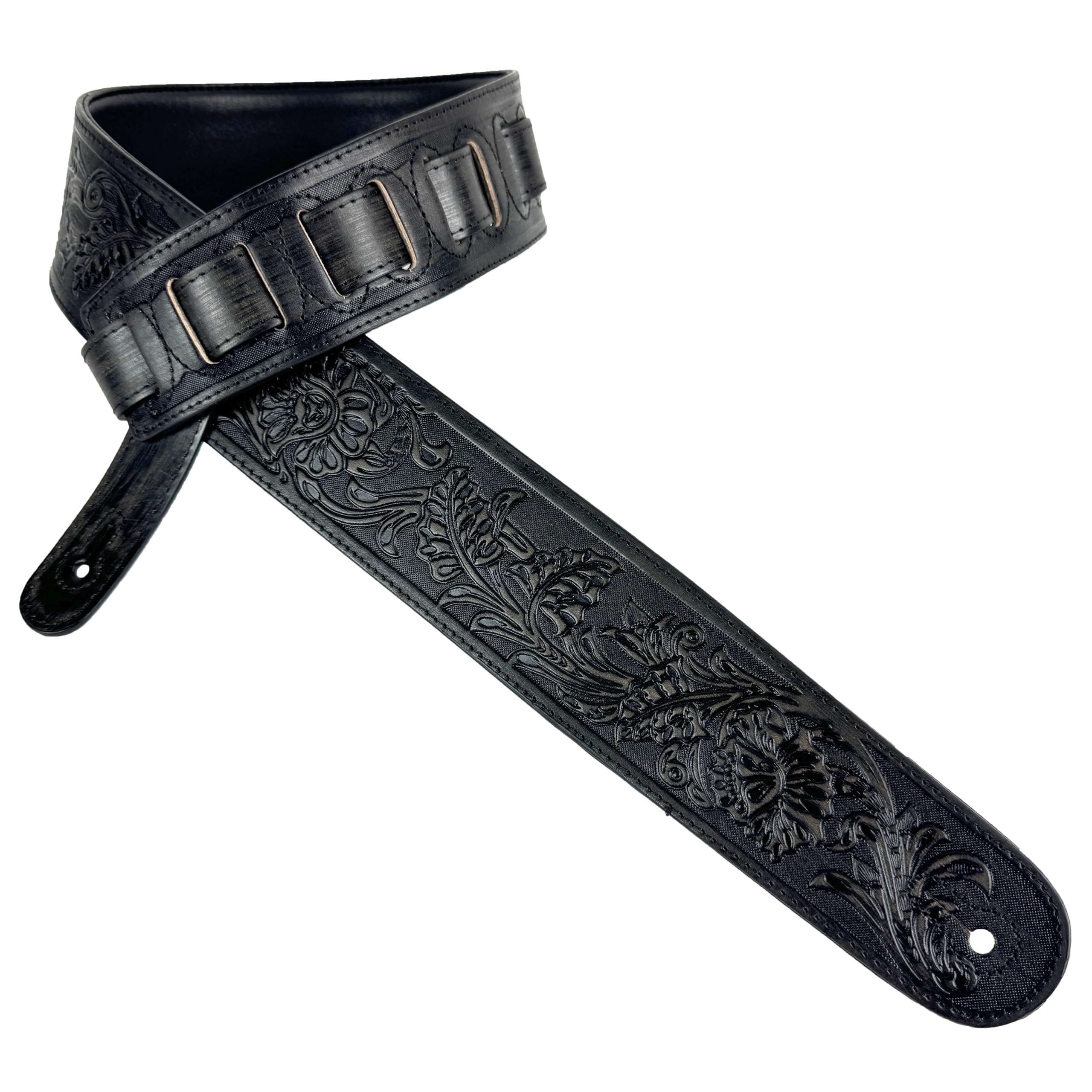 Welcome to Walker and Williams From our start in the late 19th century in the horse collar business, we’ve gone on to make harnesses and saddles, steamer trunks, industrial belting, buggy whips, military leggings, bomber jackets, flying helmets and just about every thing that can be made from leather. We still do make some of those things, although the market for buggy whips is way down these days. Throughout this site, you’ll find a variety of premium guitar, banjo, mandolin and ukulele straps in many, many styles. We currently are offering over 350 different designs "Worn-In" Look Black Leather Padded Strap with Traditional Live Oak Carving Pattern Comfortable Padded Glove Leather Back Double Reinforced End Caps Matching Top Stitching 2 1/2" wide Adjustable from 41"-53"