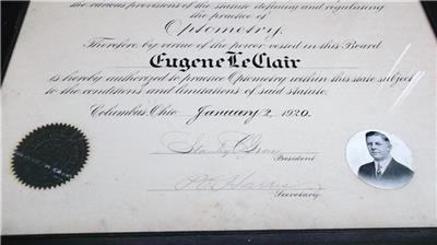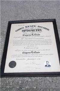 Original Vintage Antique Framed under Glass OHIO STATE BOARD of OPTOMETRY Certificate measures approximately 15-3/4" x 18-3/4". The Vintage Certificate features the Official Seal of the Ohio State Board of Optometry, along with printed language authorizing the recipient (Eugene Le Clair) to practice Optometry in the State of Ohio. The Certificate is Number 584; dated January 2, 1920 in Columbus, Ohio; and signed by President Stanley Gray and Secretary P. F. Harris. A photograph of Mr. Le Clair is affixed to the lower right corner of the Certificate.