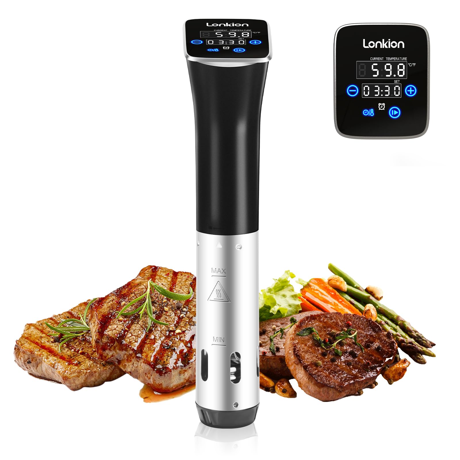 [Restaurant-Quality Cooking at Home] Elevate your cooking with the Lonkion Sous Vide Cooker, designed to deliver restaurant-quality meals right in your kitchen. Whether you're cooking steaks, pork chops, eggs, or salmon, enjoy flawless results every time. With precise control over both time and temperature, your food will always be perfectly tender, flavorful, and cooked to your exact preferences—never overdone.