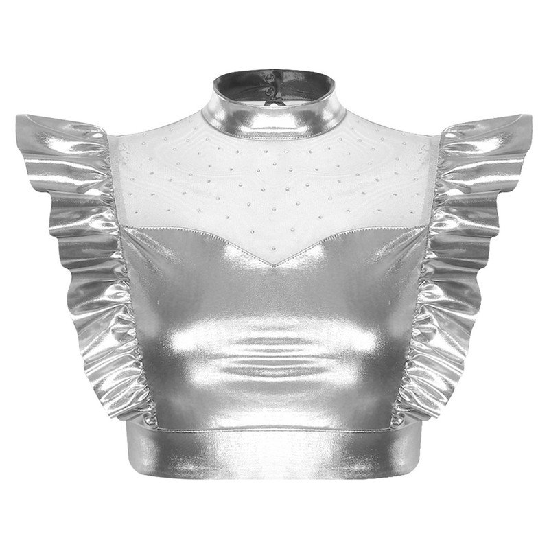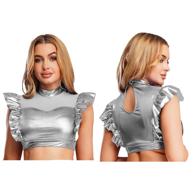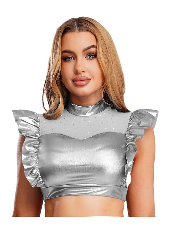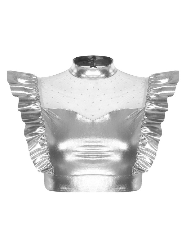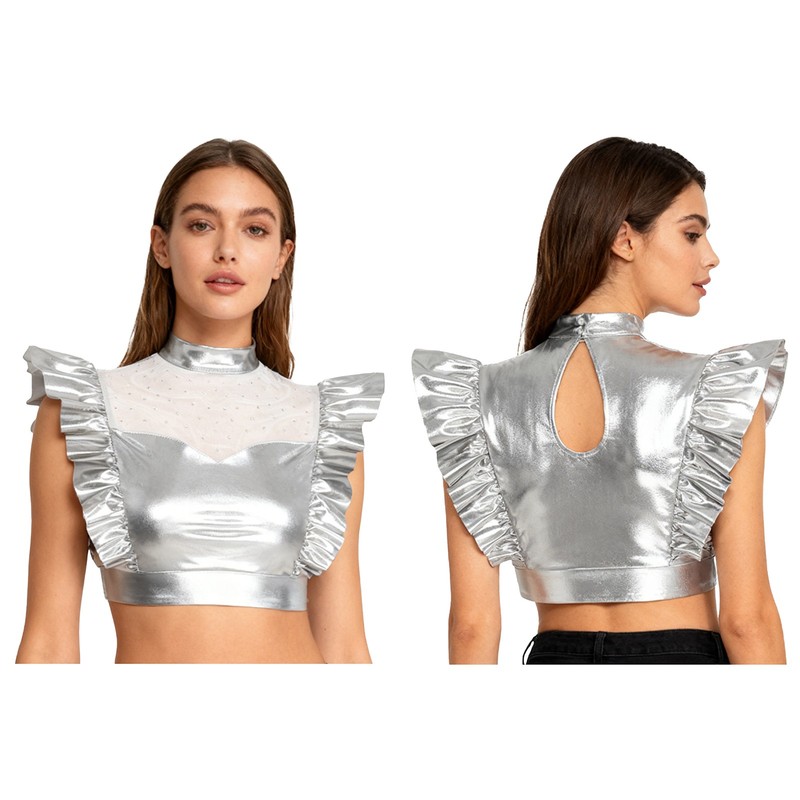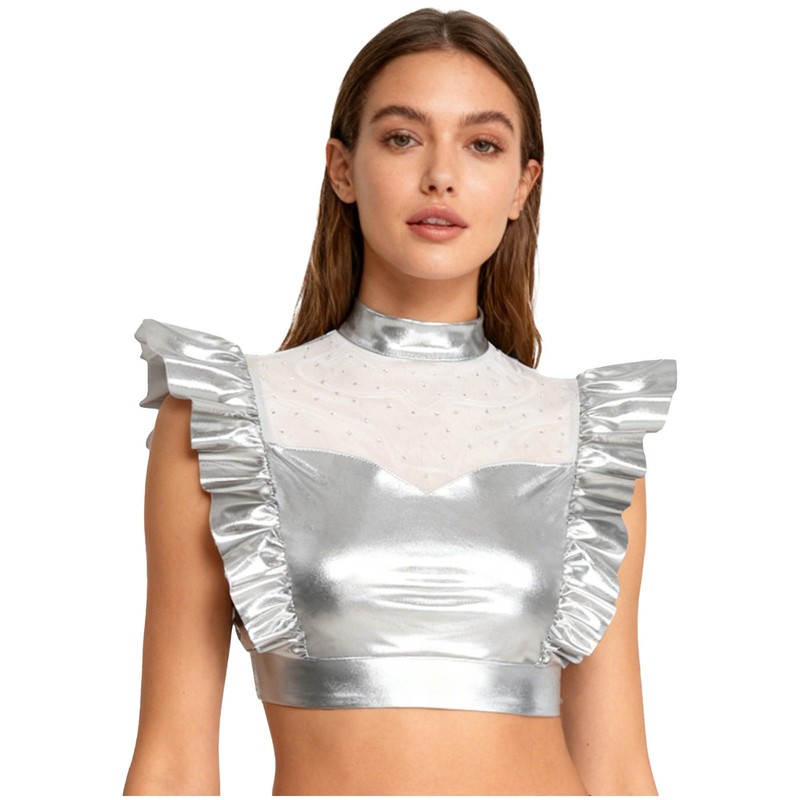 The front sheer mesh with rhinestones adds a touch of glamour and sparkle, making this top perfect for those who love to make a statement.