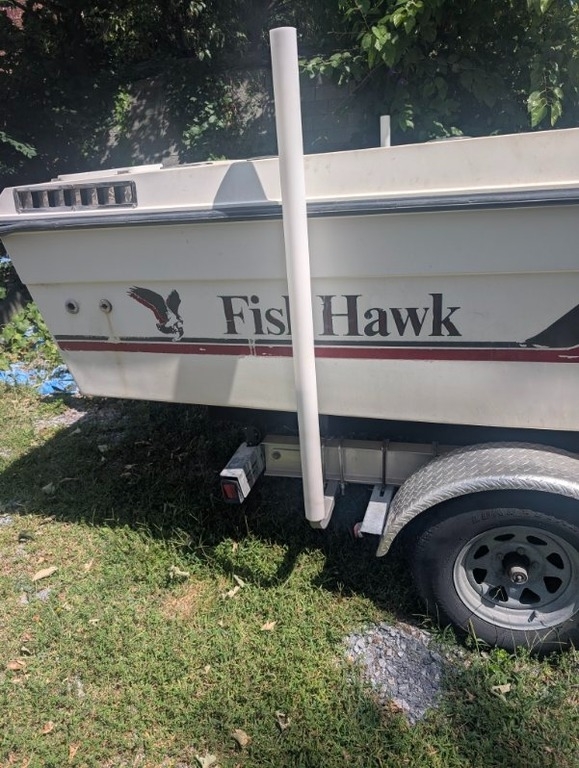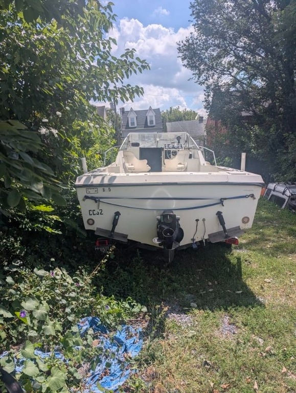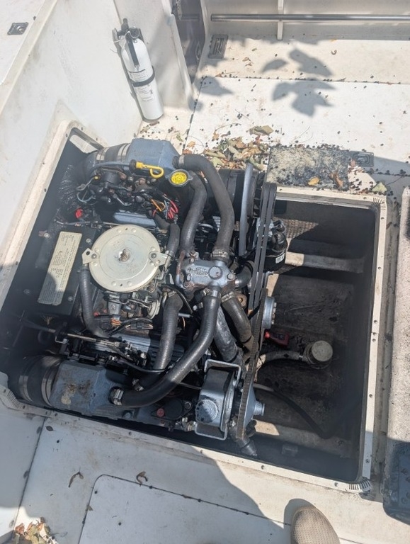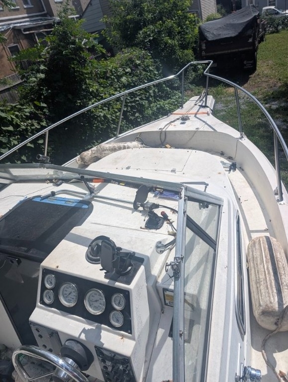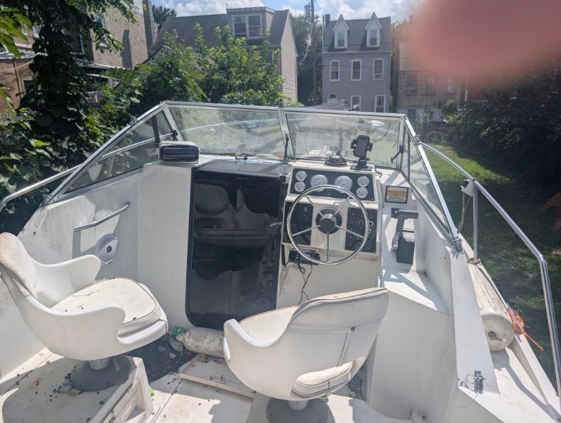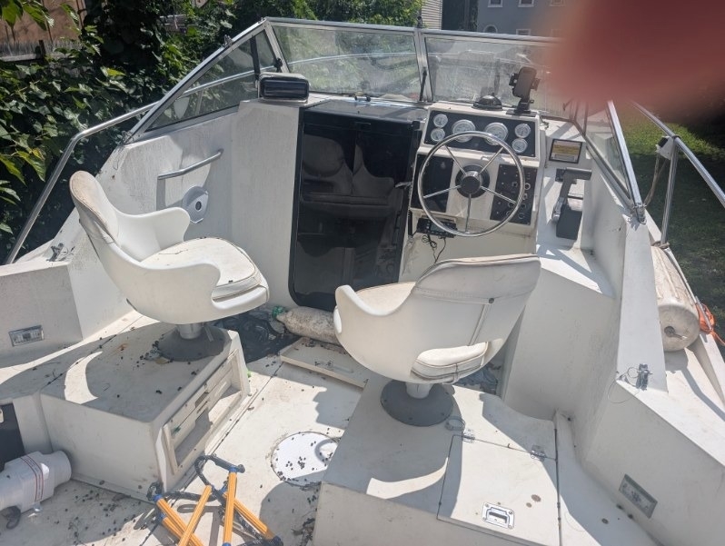 This boat is powered by a gasoline Yamaha V6 engine. According to the owner, the boat starts and runs, and it was last used on November 21, 2024. It has since been winterized with fluids drained. There is no battery included. The boat has seen freshwater use only and features a fiberglass hull. Overall mechanical condition of the boat is described as fair. A powerwash will do wonders.