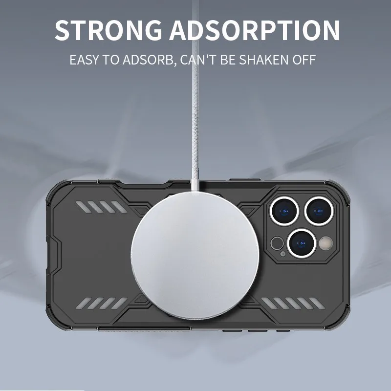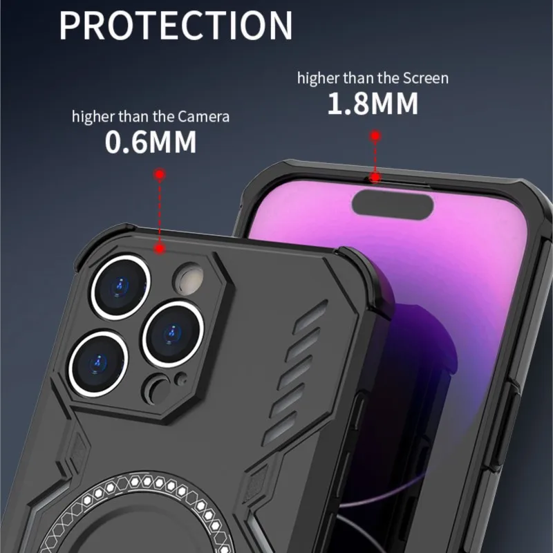 Experience ultimate protection with this rugged black case designed specifically for the iPhone 16 Pro Max. Its high-tech tactical style features angular lines, textured surfaces, and a matte finish that conveys strength and durability. The embedded magnetic ring with white LED-like lights makes the case not only functional but stylish, perfect for those who appreciate a futuristic aesthetic. Reinforced camera cutouts with raised bezels protect lenses from scratches and impacts, while precise cutouts and textured grips enhance handling. Made from durable plastic combined with soft TPU, this dual-layer case offers shockproof, impact-resistant, and dirt-resistant features. It combines advanced technological design with everyday practicality for a perfect fit.Key features of the rugged black iPhone 16 Pro Max case