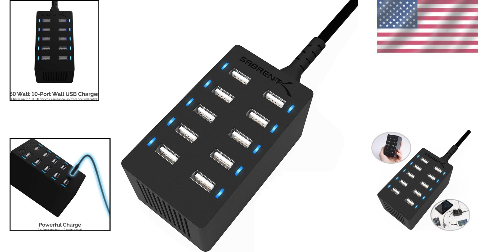 Charge up to 12 Amps among 10 ports (2.4 Amps per port).