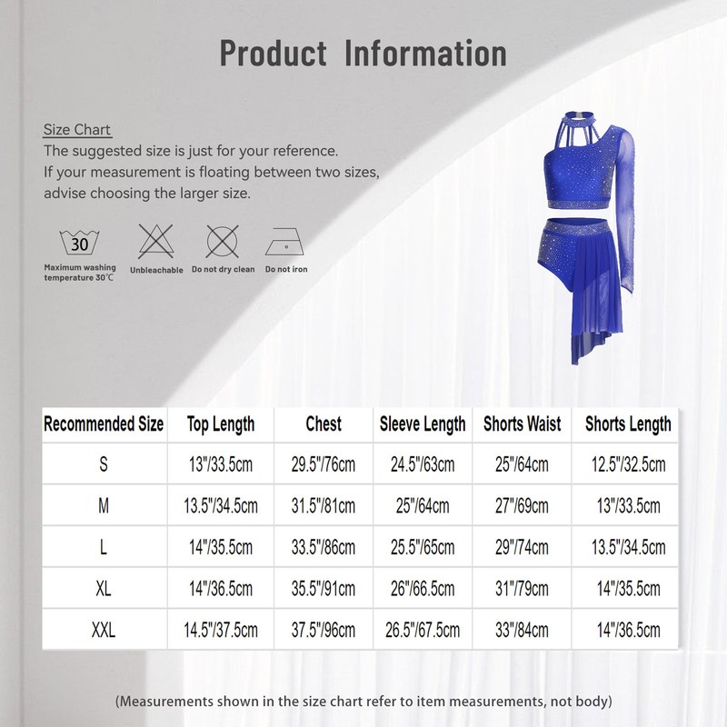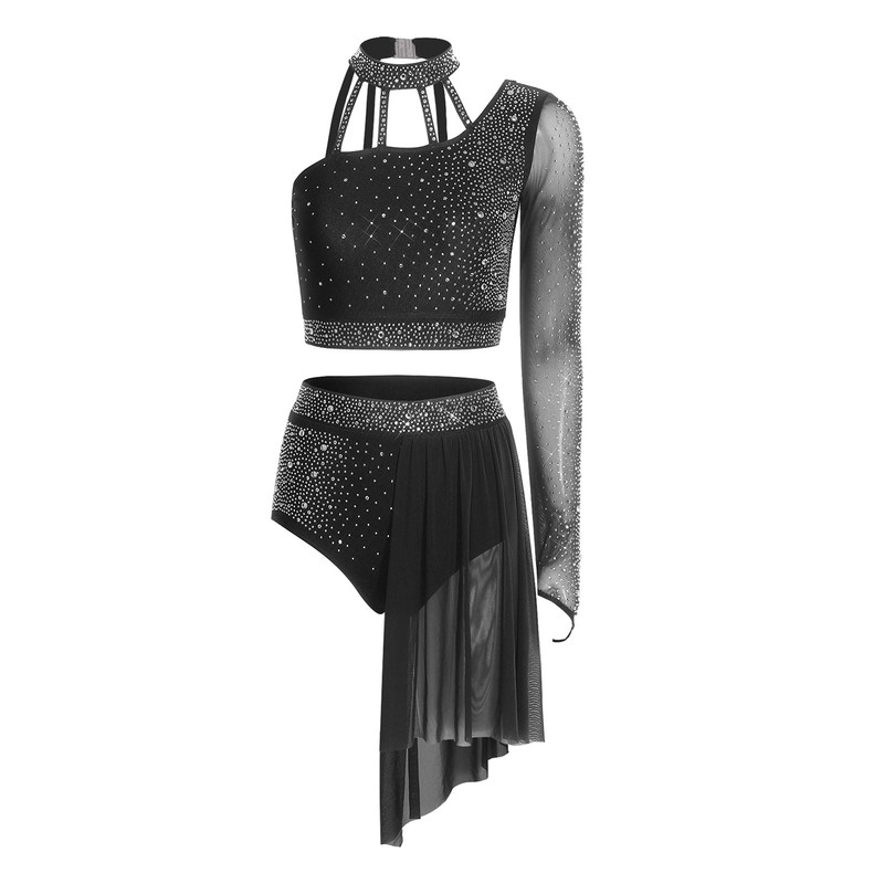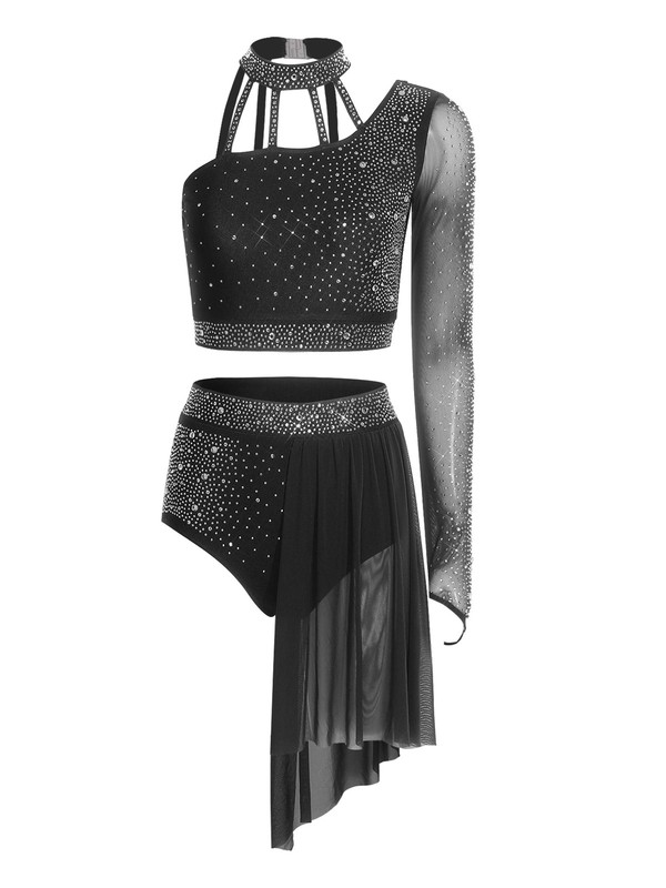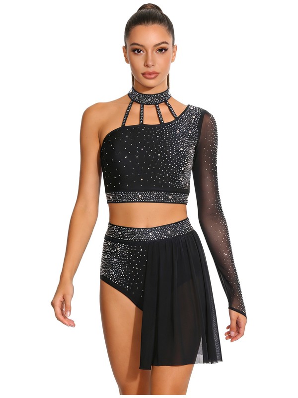 The asymmetrical design of the single long-sleeve crop top and shorts is trendy and unique, adding a modern and fashionable touch to the dance costume.