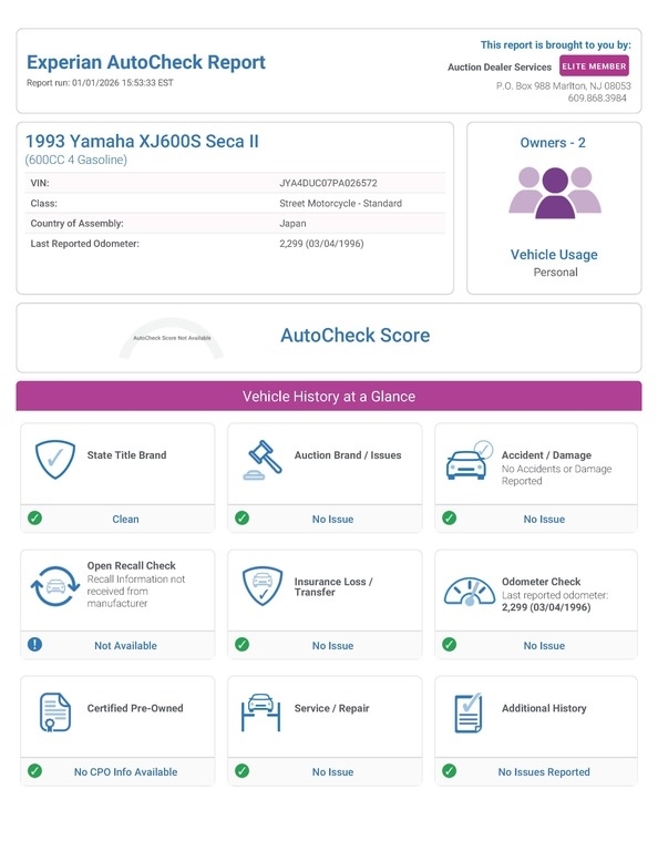 Up for sale is a 1993 Yamaha XJ600S Seca II with very low original mileage. This motorcycle has been garage kept and is in good cosmetic condition overall. It was running well when last regularly ridden, but currently will need some work