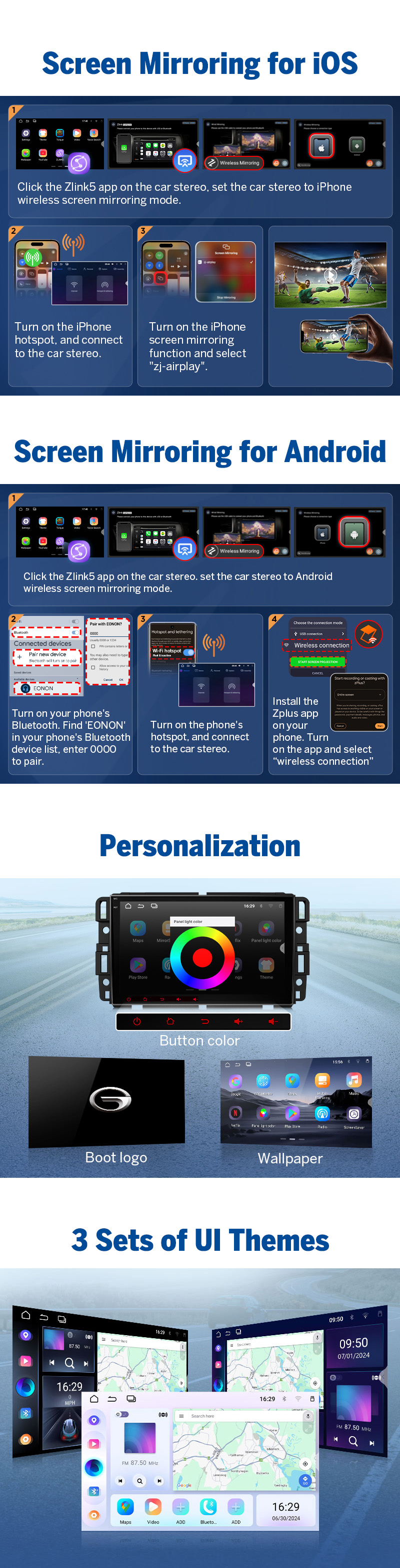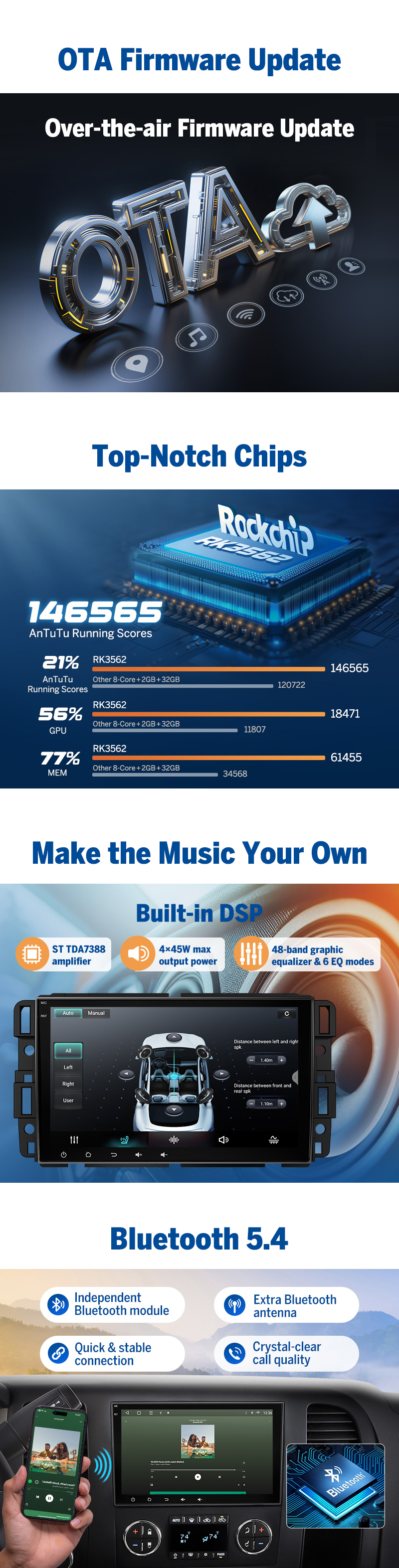 The Eonon GMX7 is a premium Plug & Play head unit engineered specifically for Chevrolet, GMC, Buick, and Hummer vehicles. It delivers wireless smartphone connectivity, powerful DSP audio, smooth Android performance, and factory feature retention—all without cutting wires or modifying your dashboard.