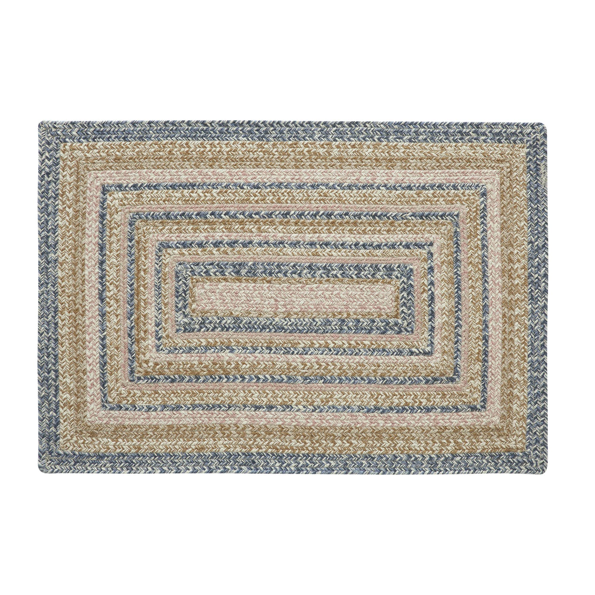 MULTICOLORED WEAVE: Alternating braids of dusty blue, gold, creme and dusty rose add charming, durable style to any surface.
