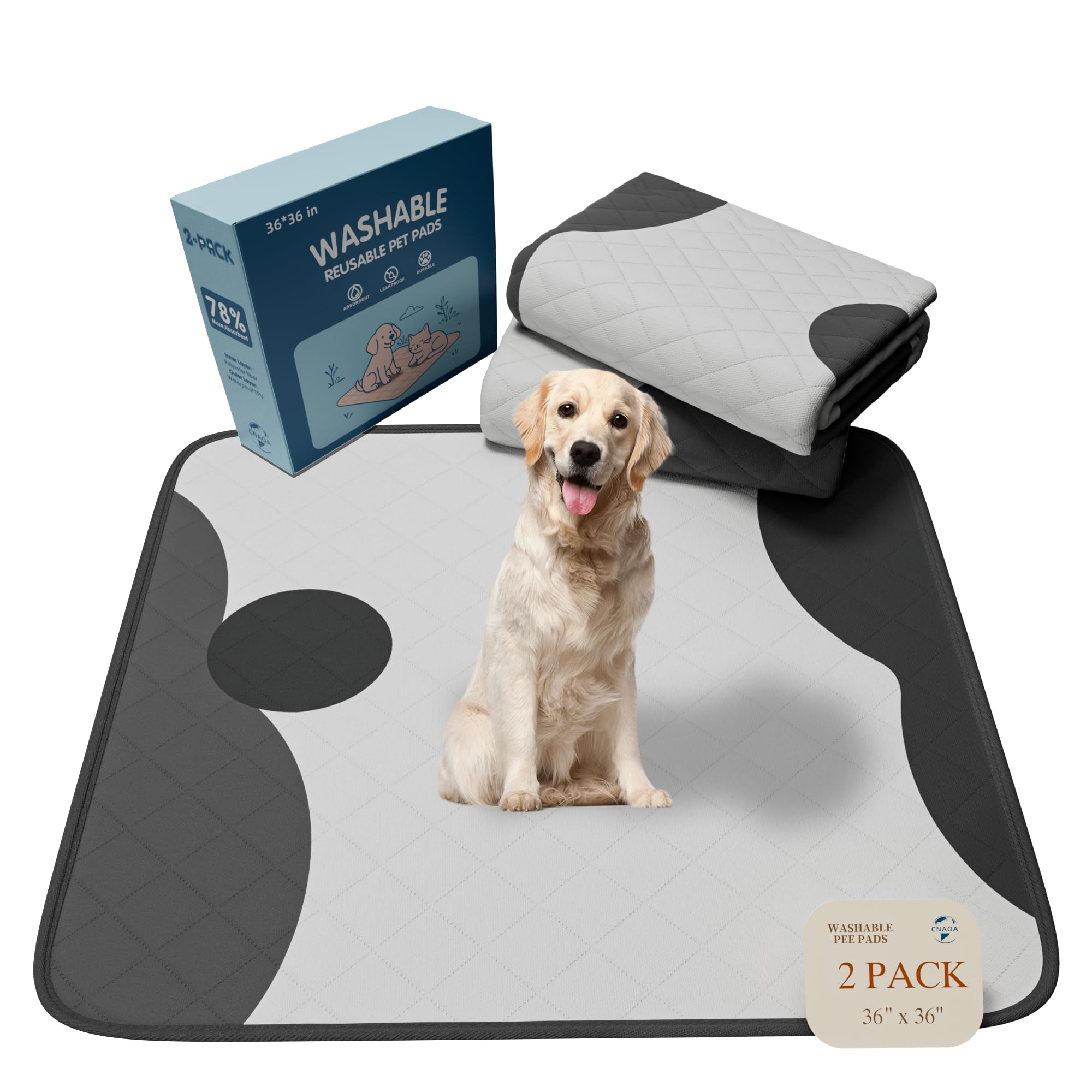 CNAOA Washable Pee Pads for Dogs 2 Pack 36x36 in - 5 Layer Reusable Puppy Pads, Super Absorbent, Waterproof, Leak Proof Non-Slip Training and Whelping Pet Pee Pads for Crate, Playpen, Potty