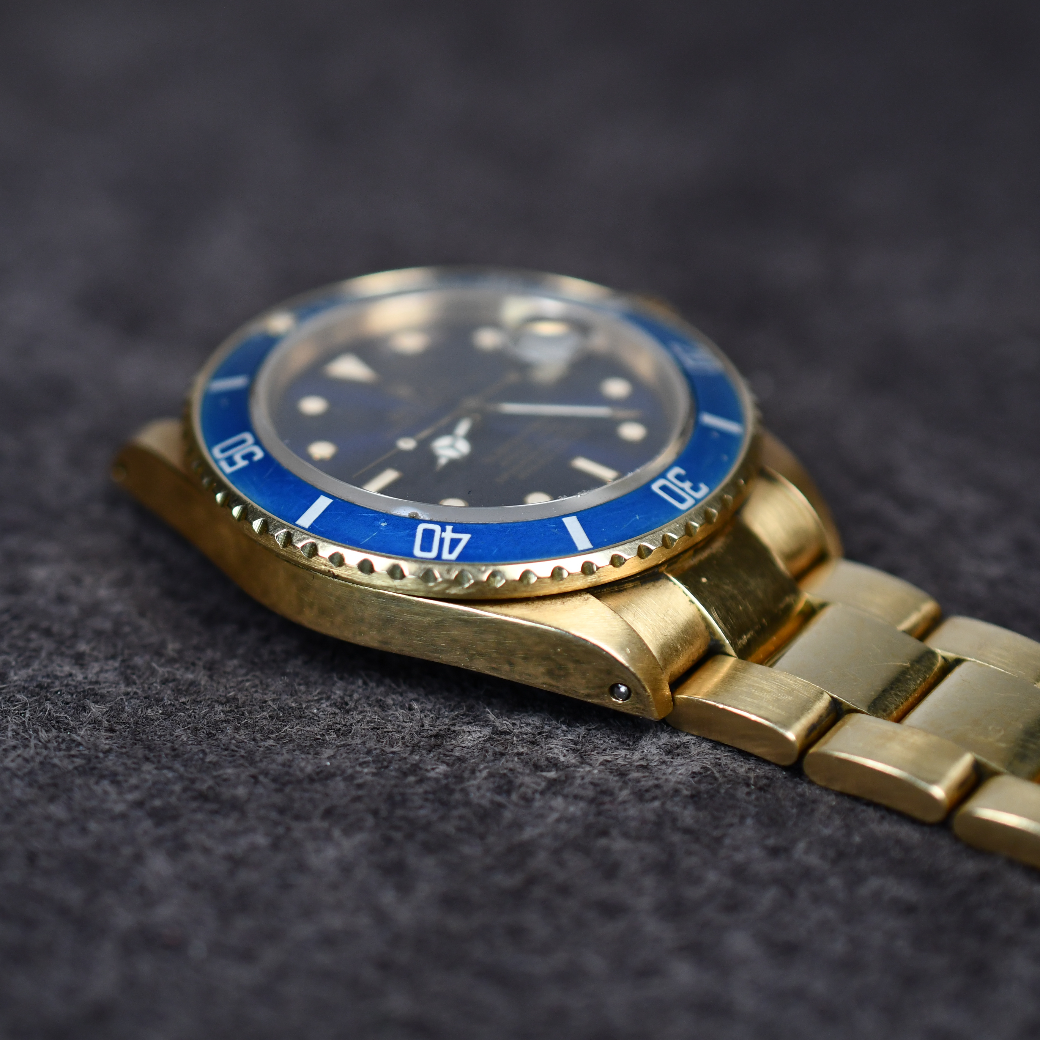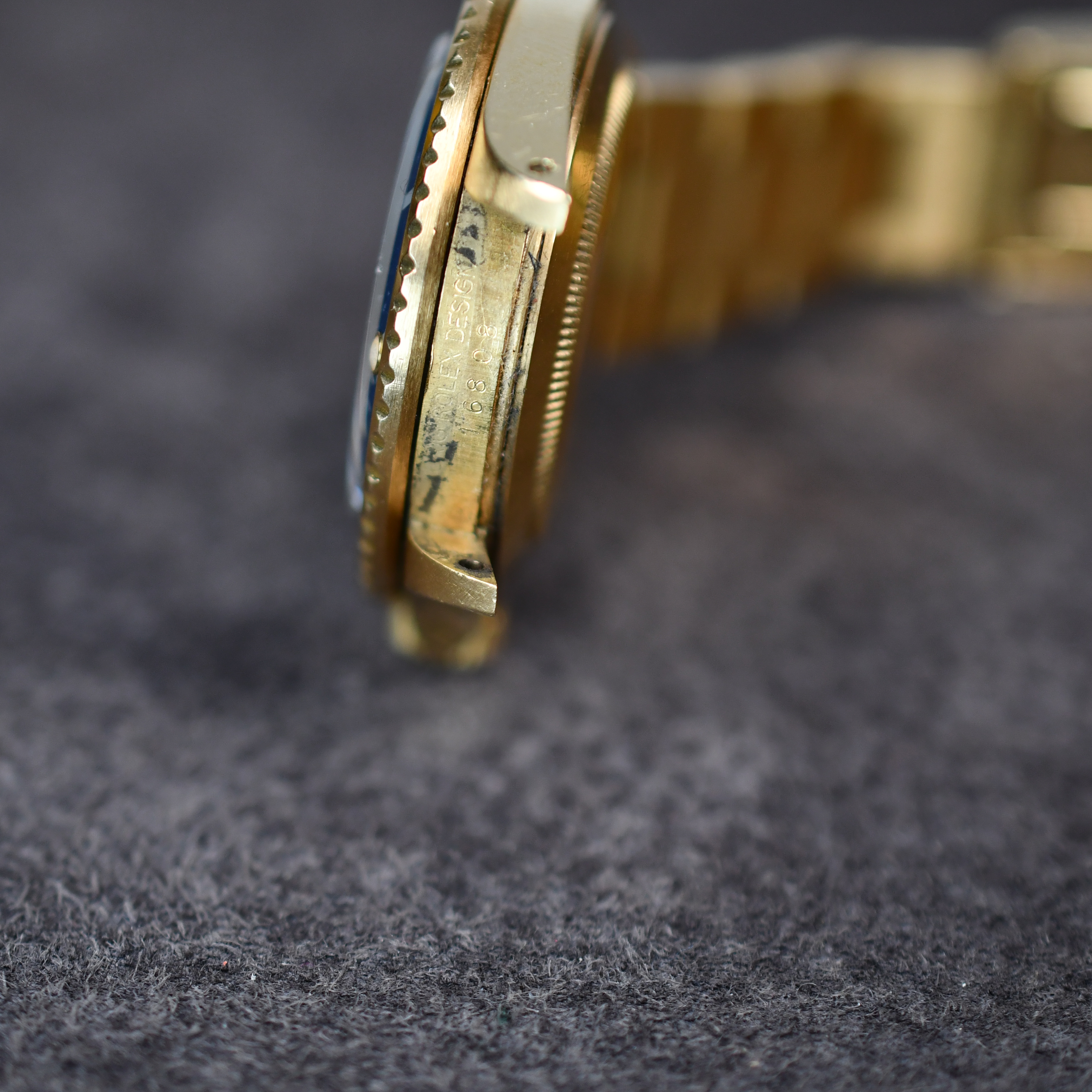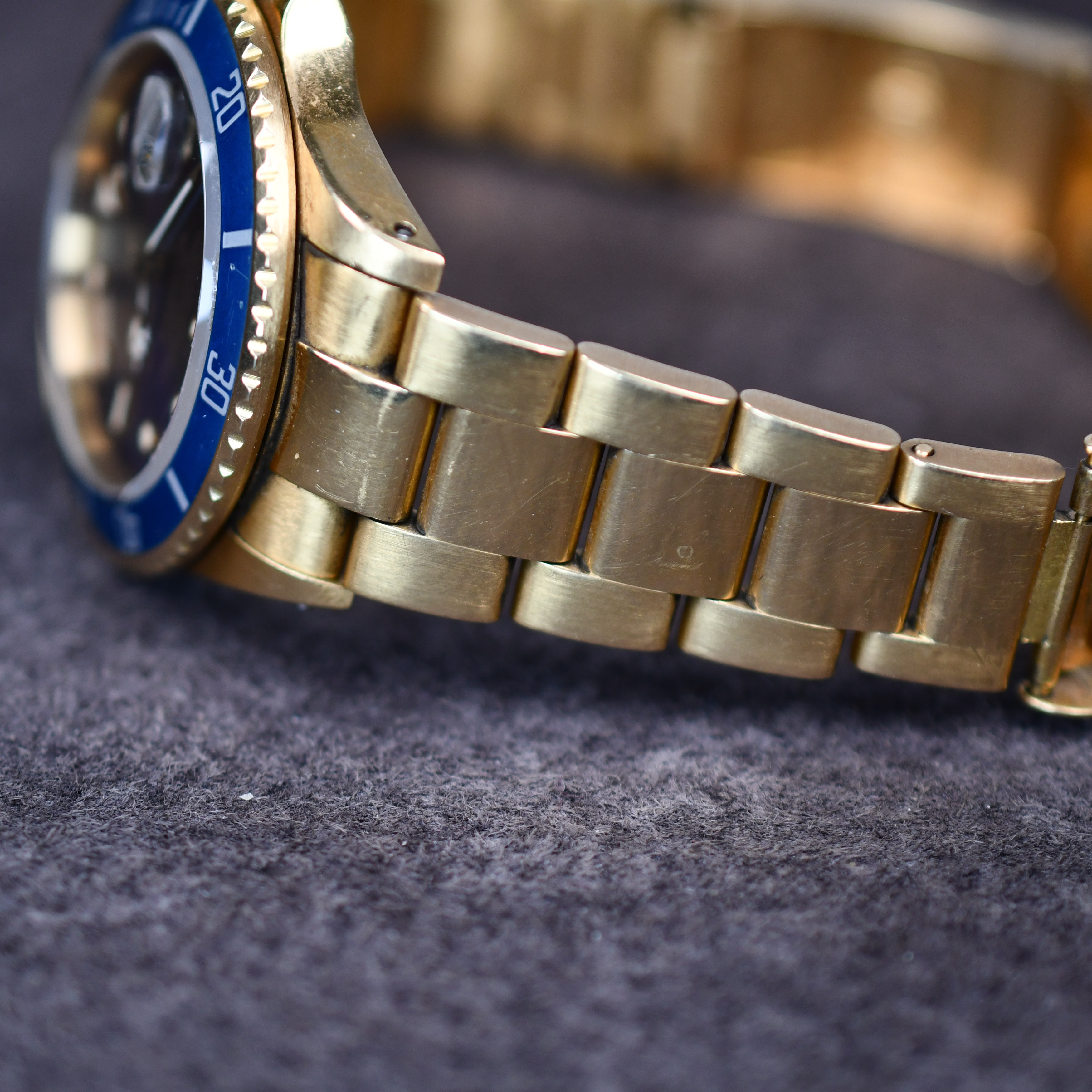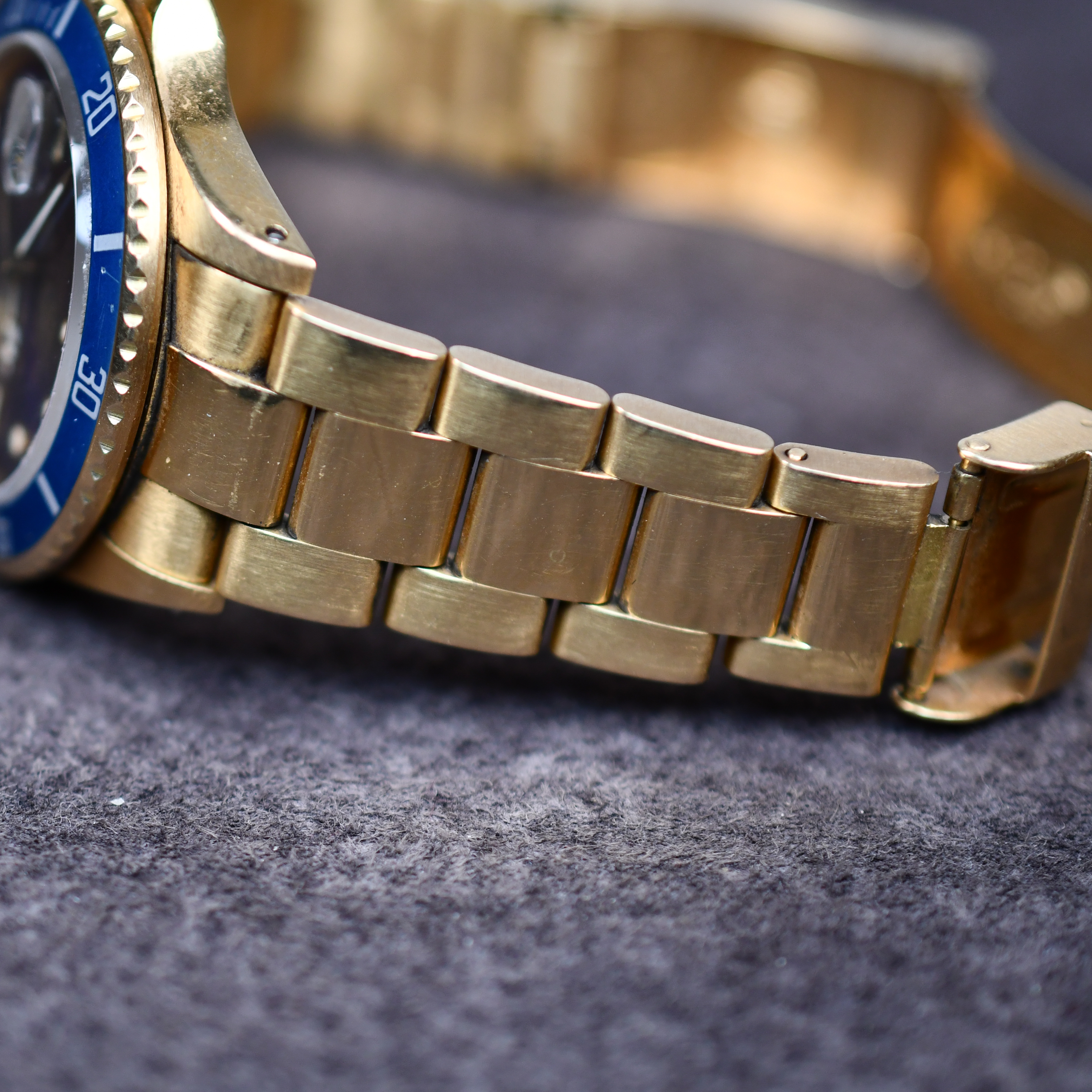 Case: 18k yellow gold oyster case with rotating faded blue bezel, Rolex triplock crown, oyster caseback