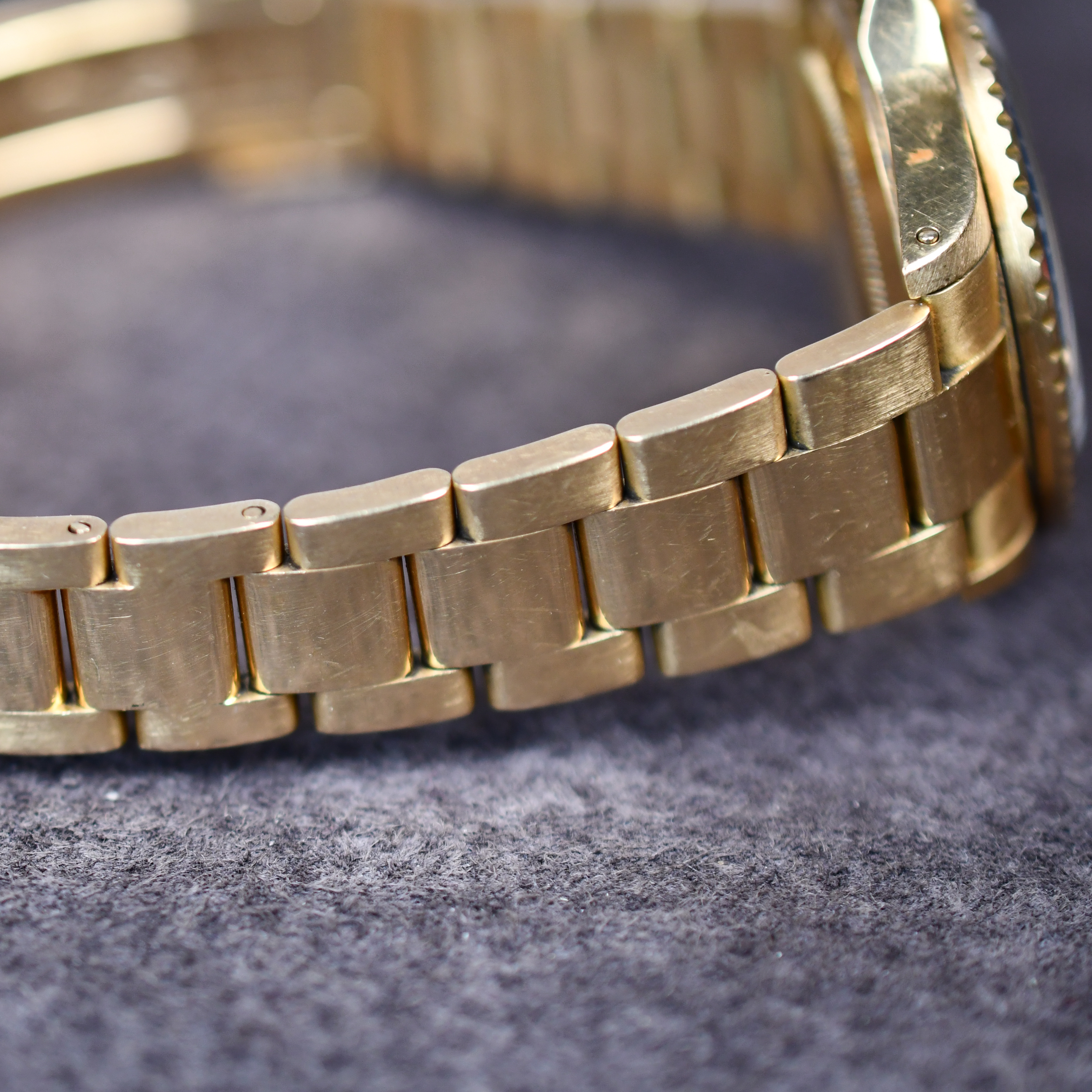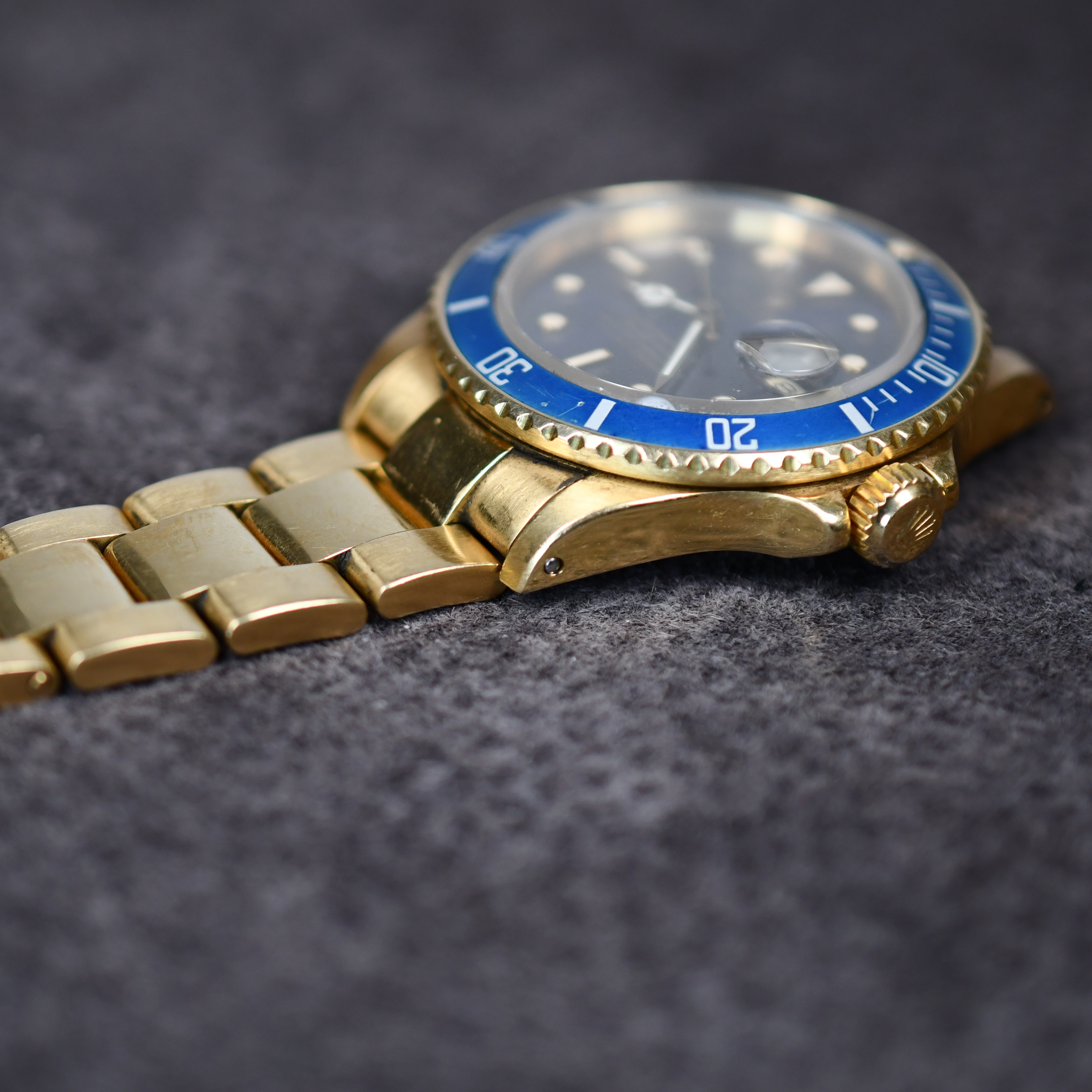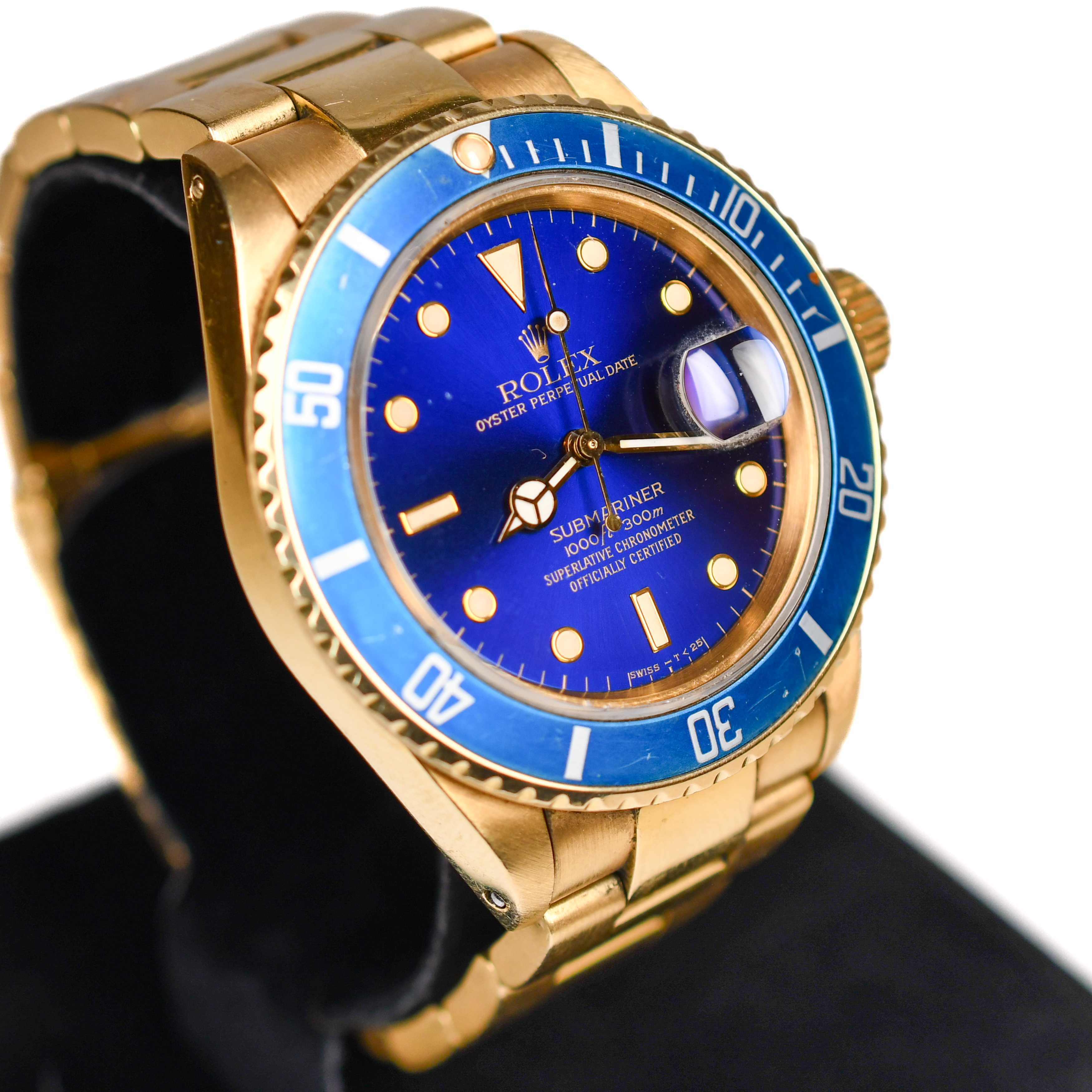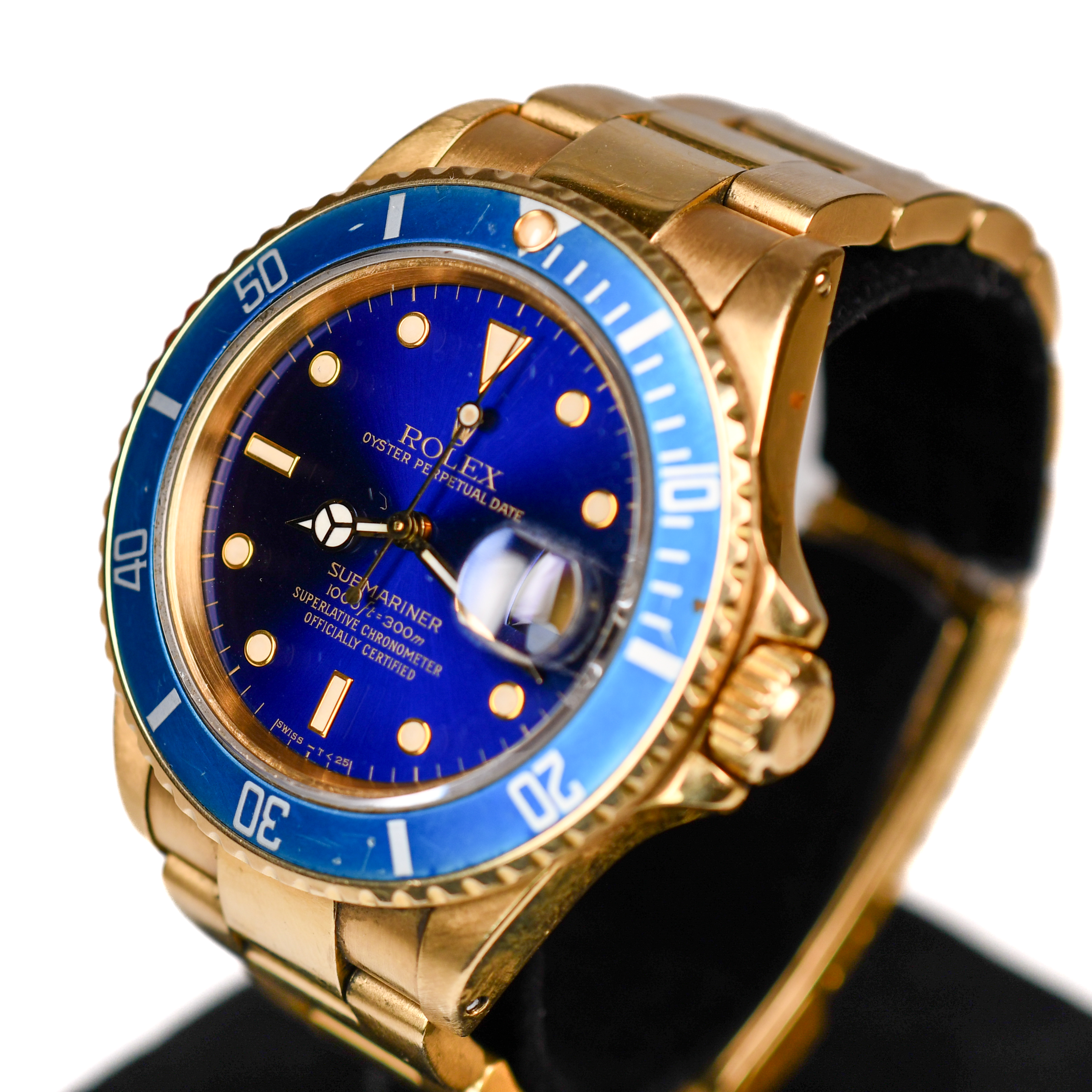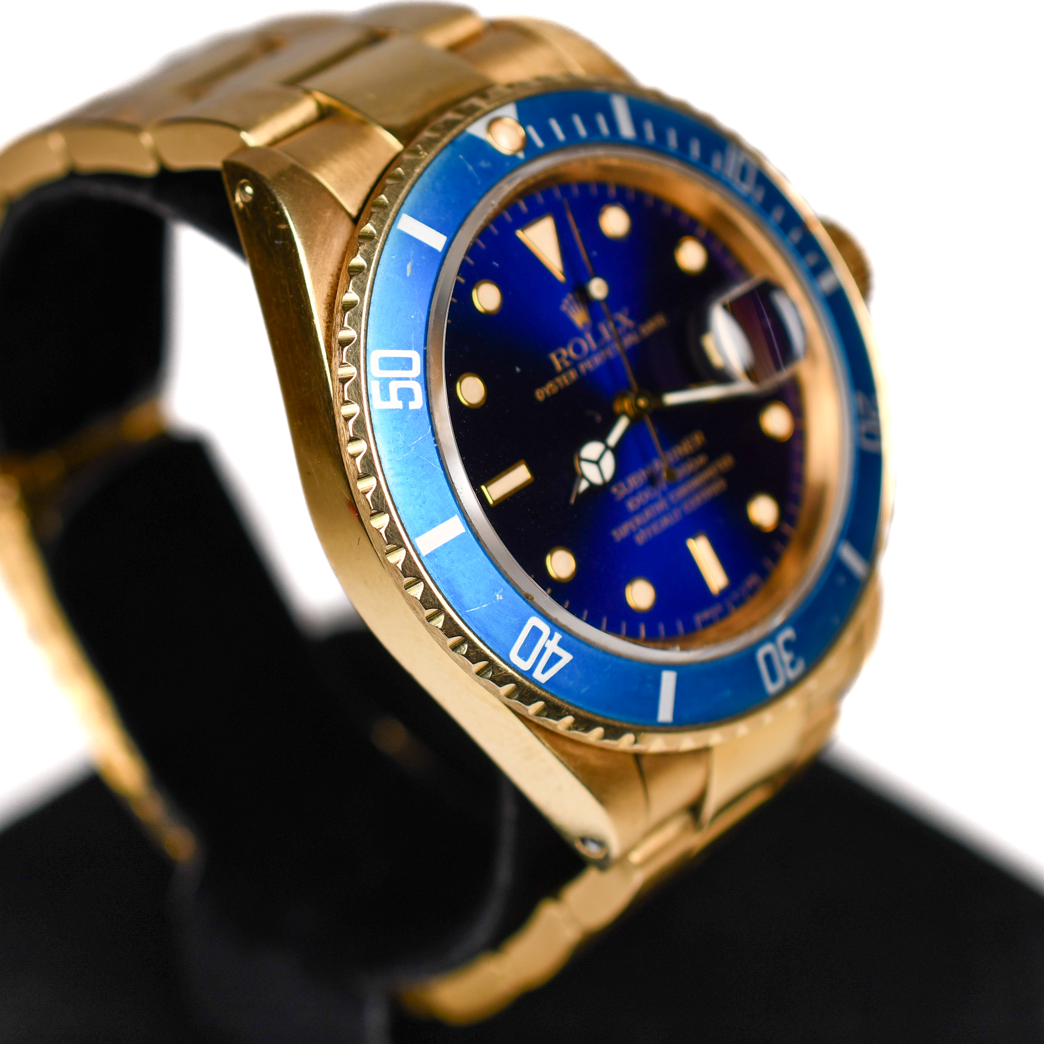 Case: 18k yellow gold oyster case with rotating faded blue bezel, Rolex triplock crown, oyster caseback