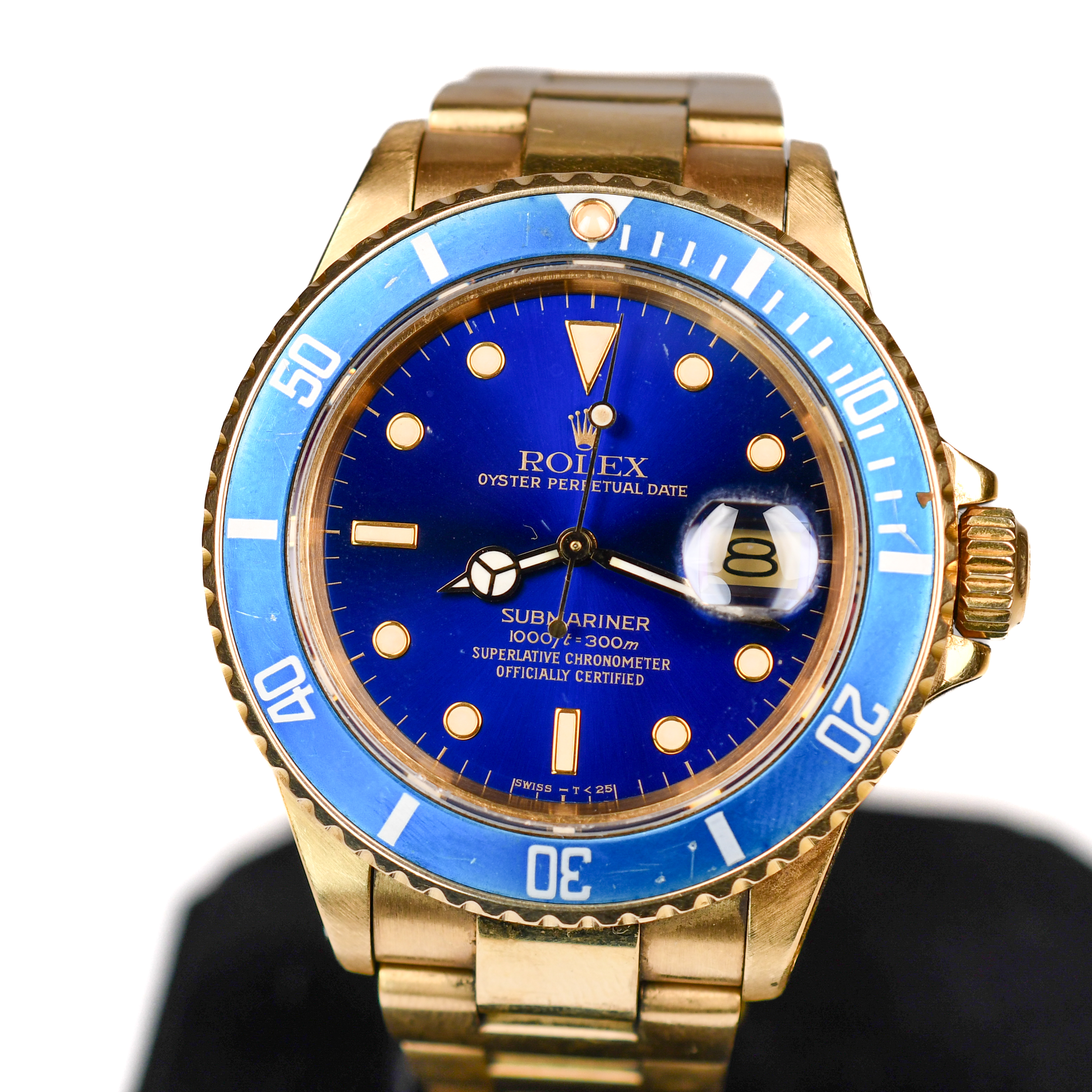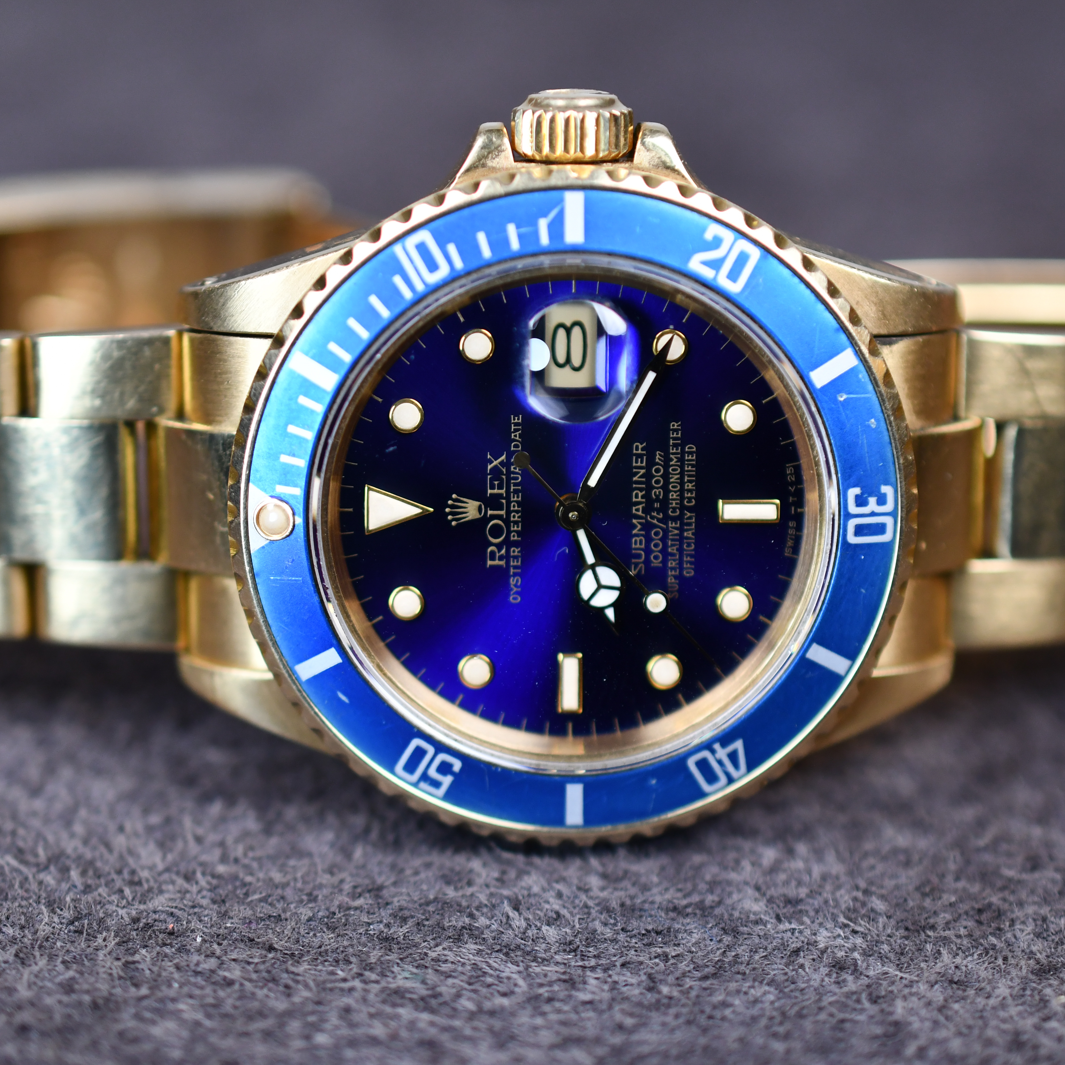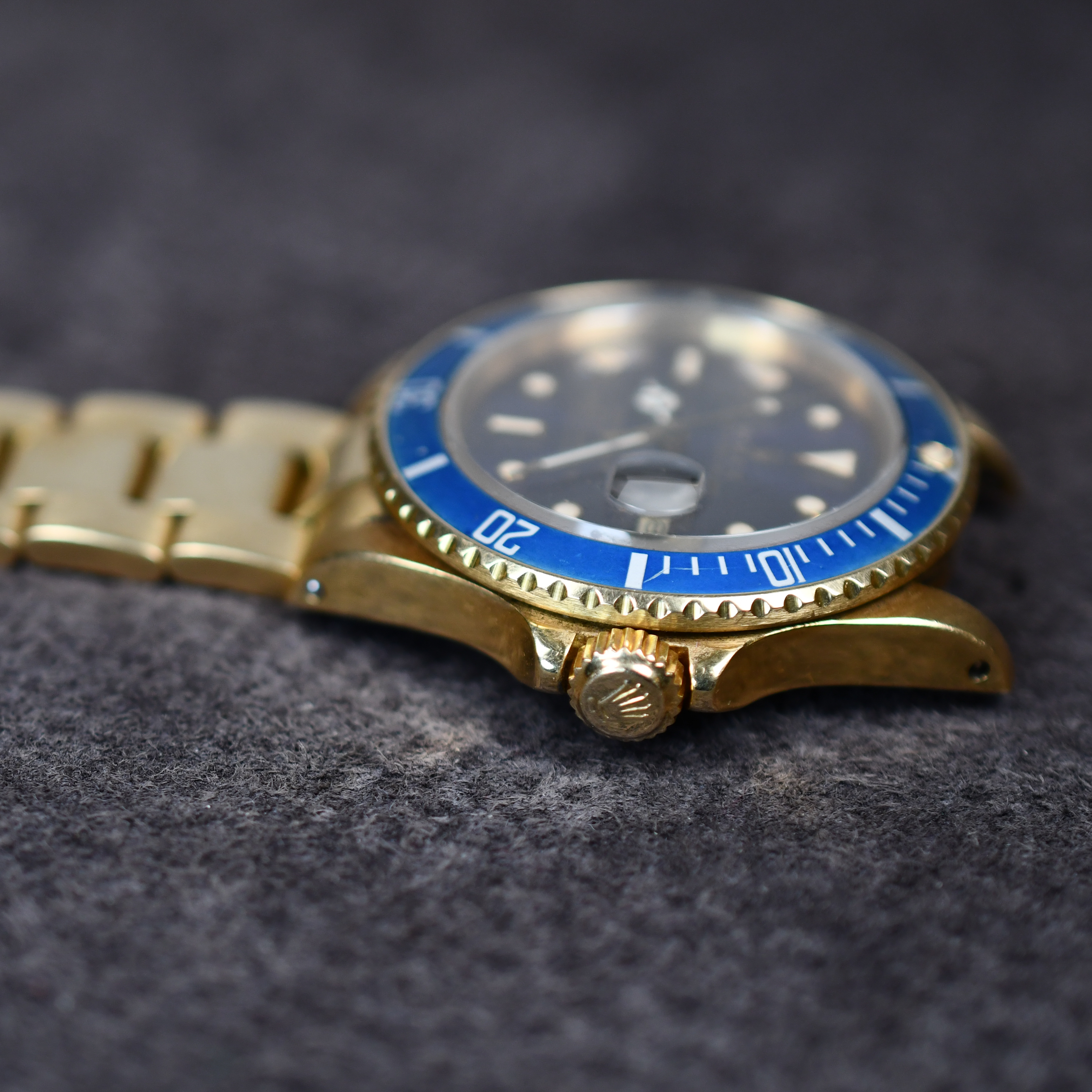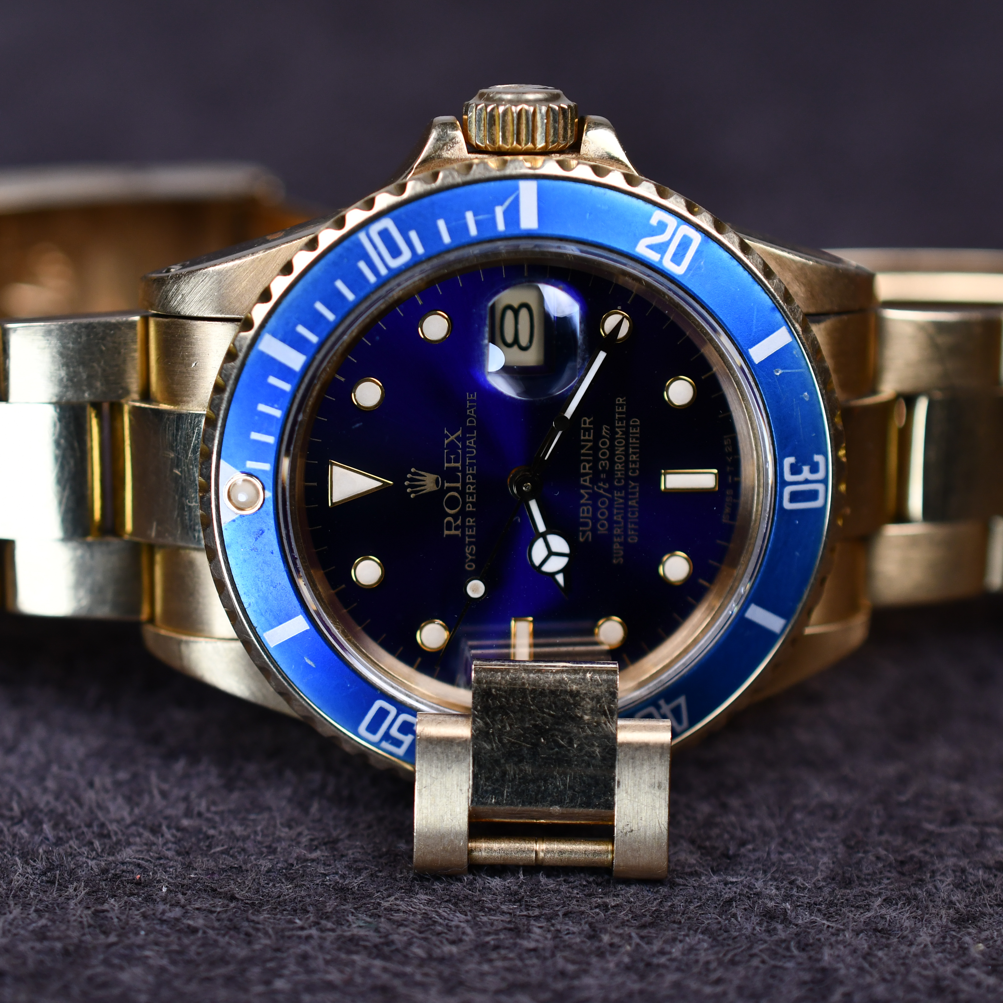 Case: 18k yellow gold oyster case with rotating faded blue bezel, Rolex triplock crown, oyster caseback