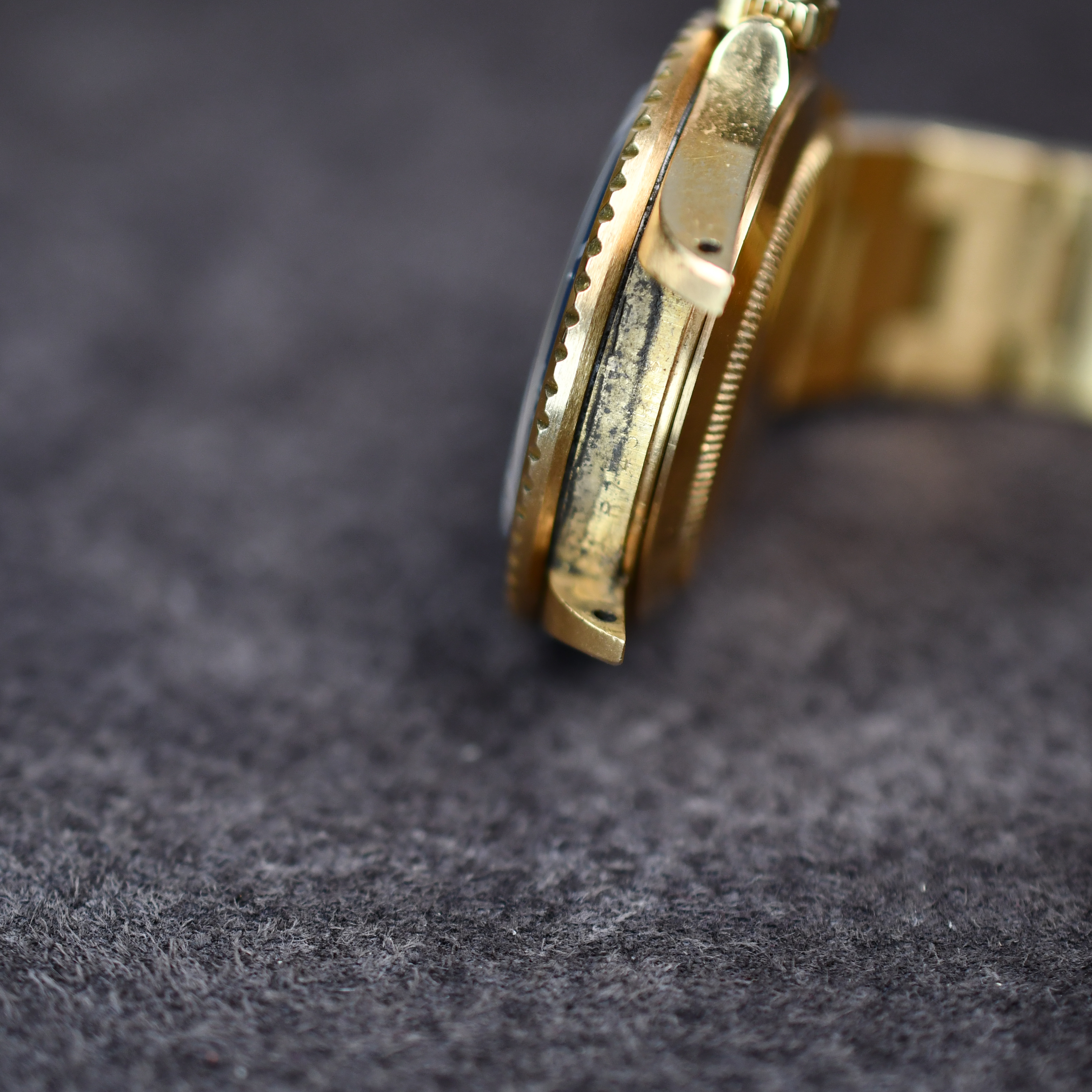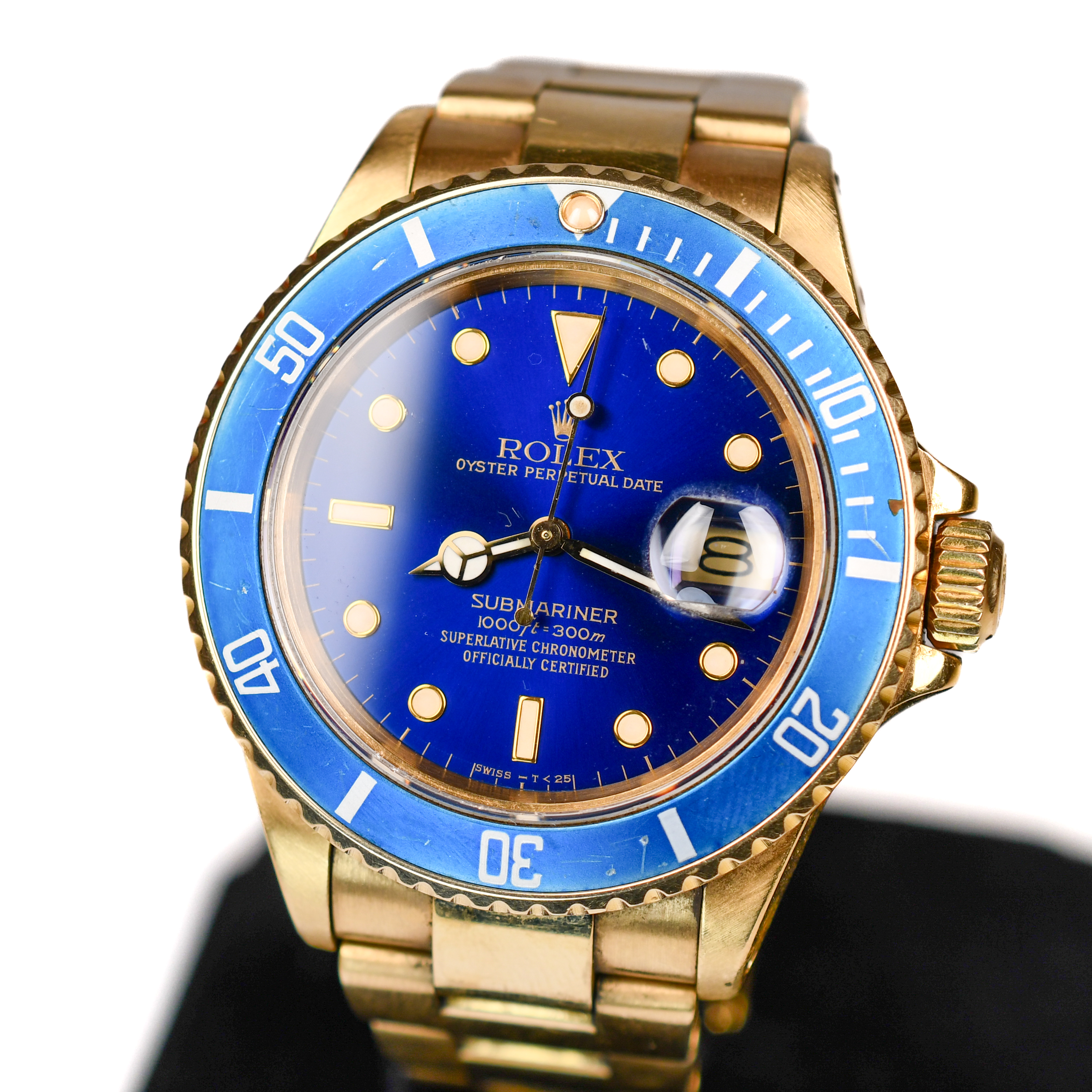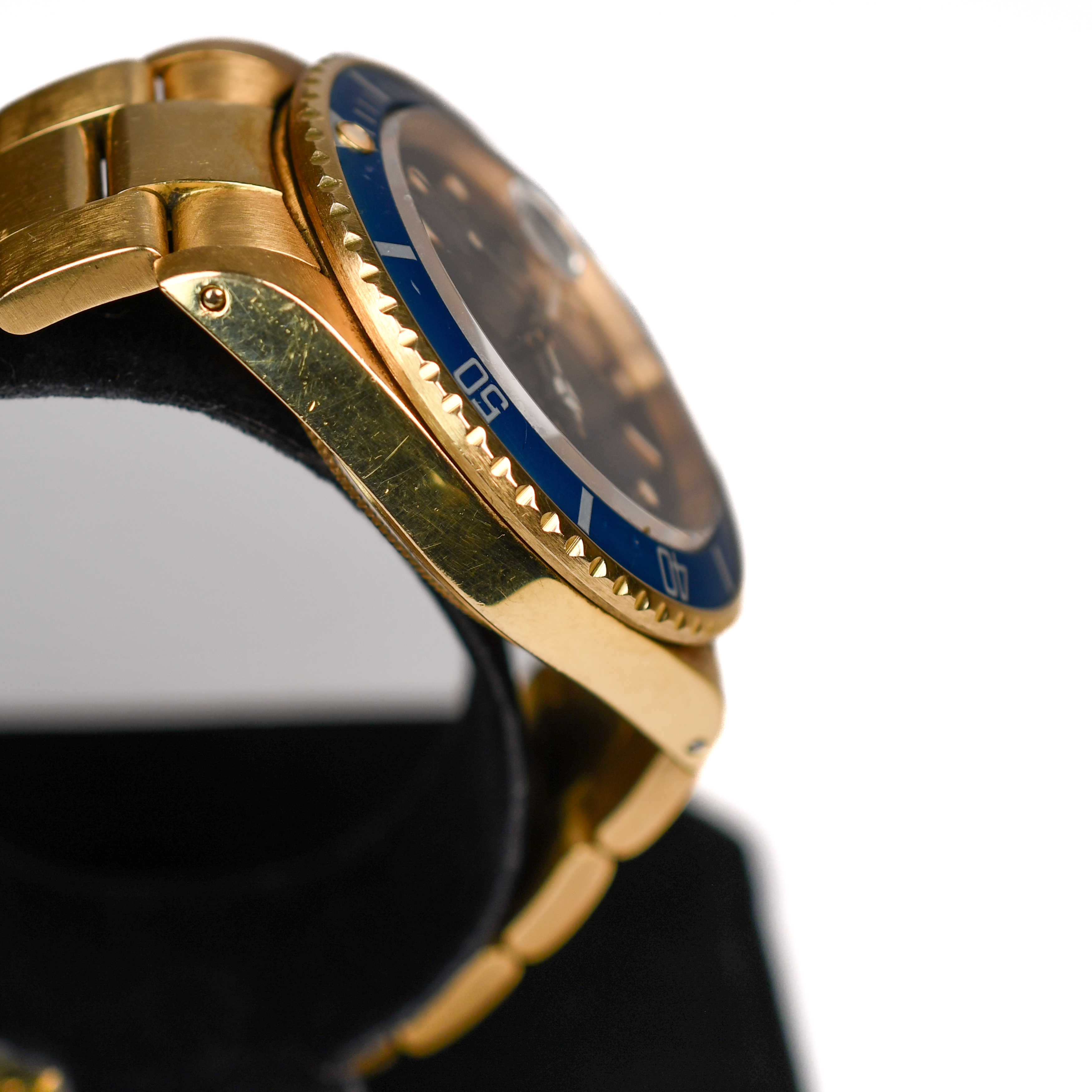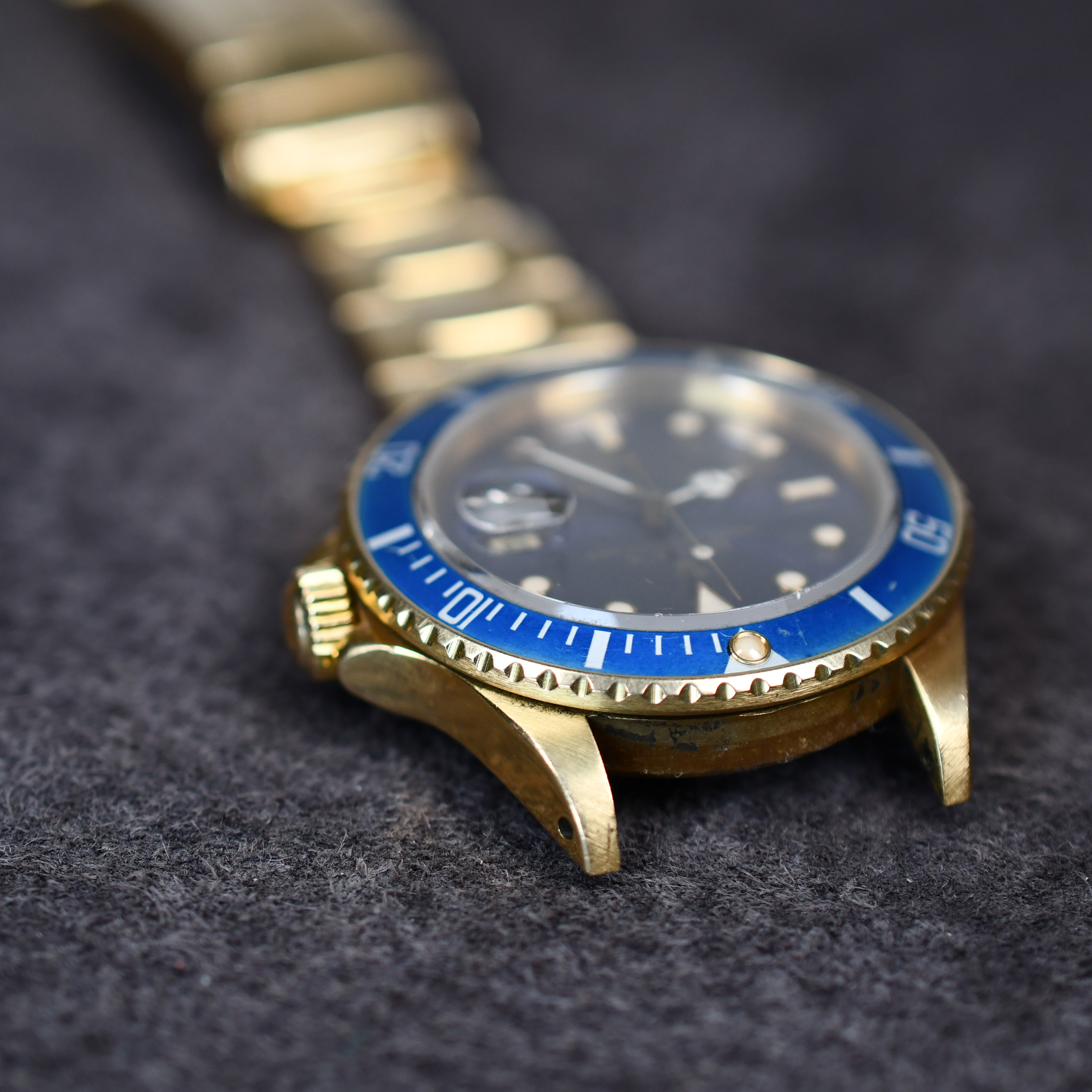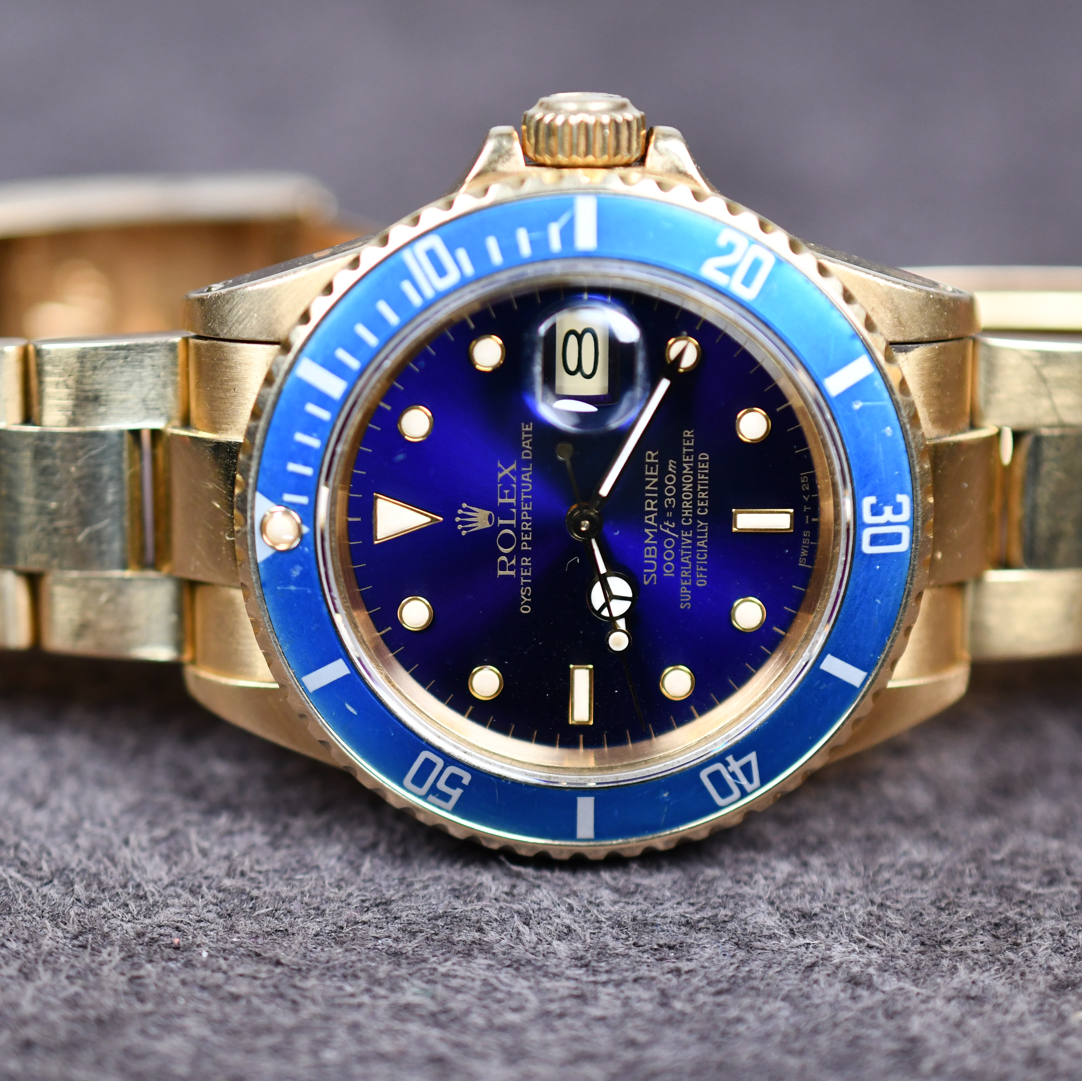 Case: 18k yellow gold oyster case with rotating faded blue bezel, Rolex triplock crown, oyster caseback