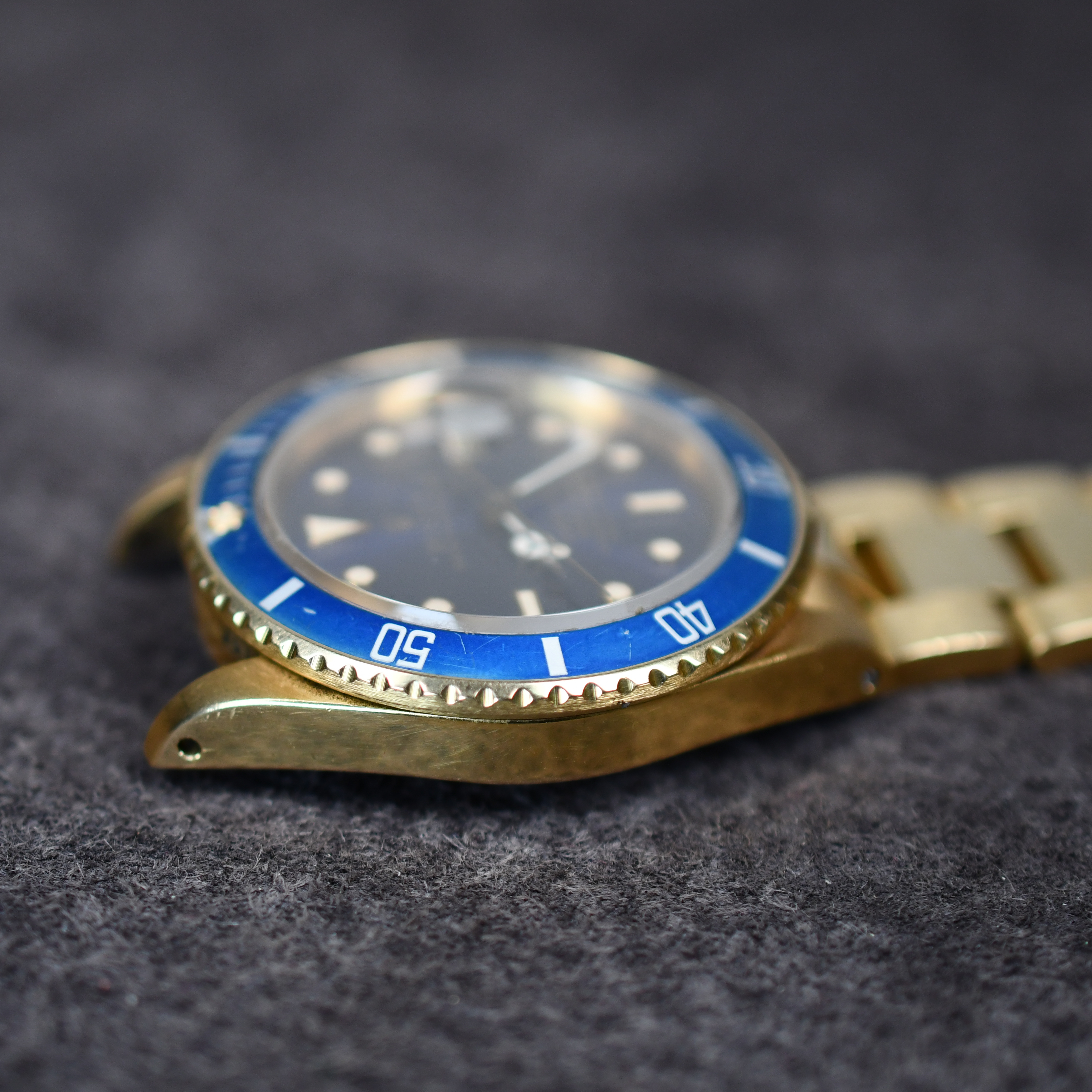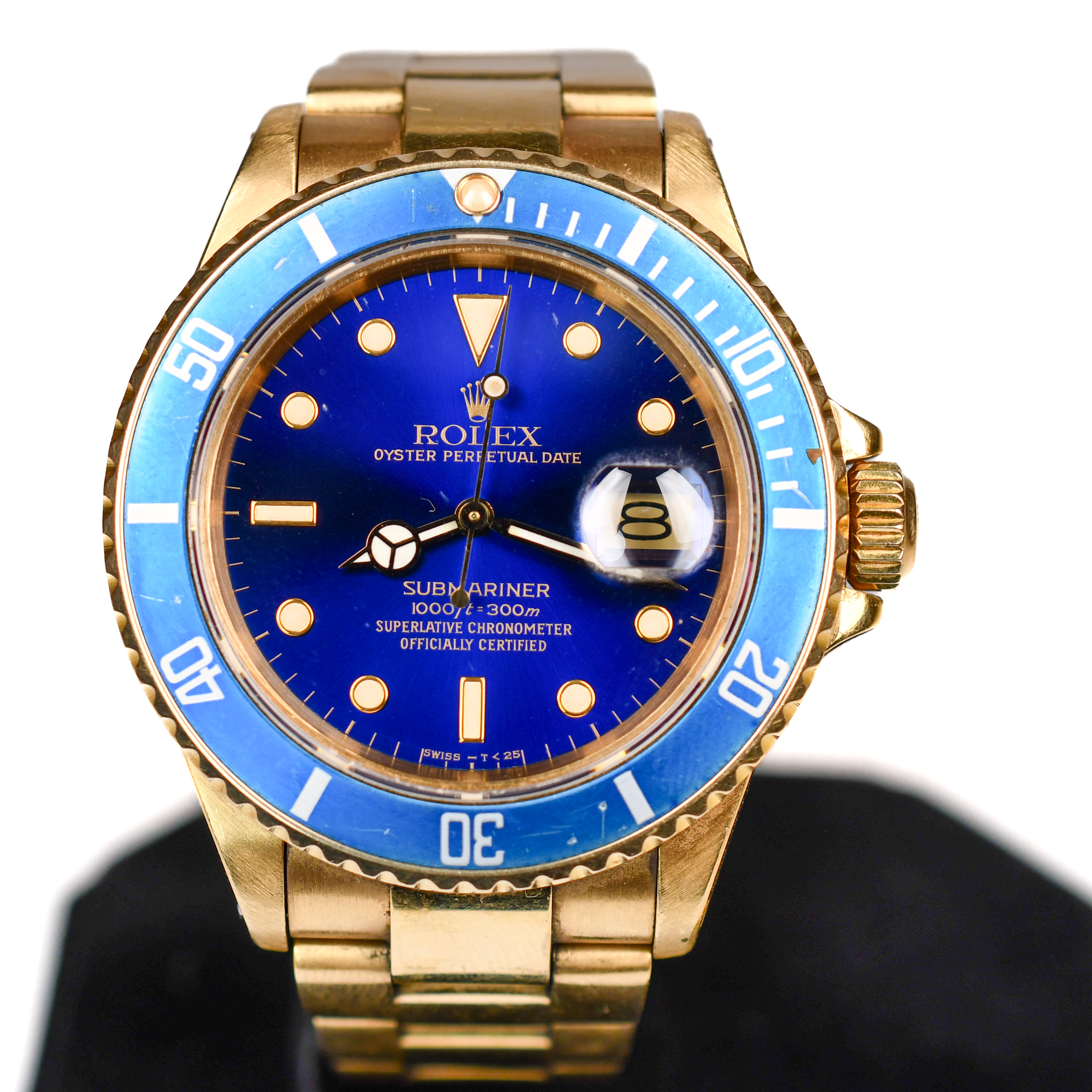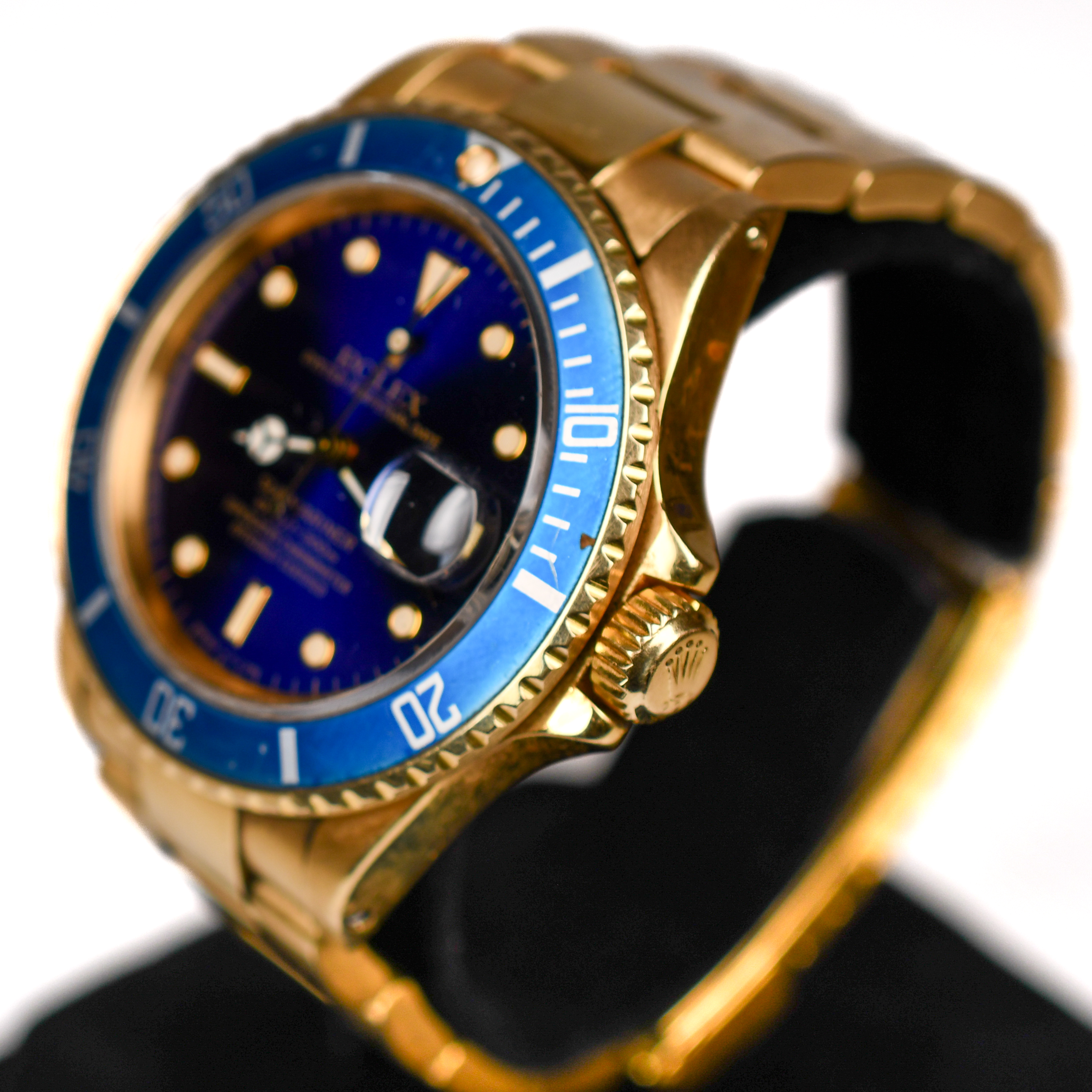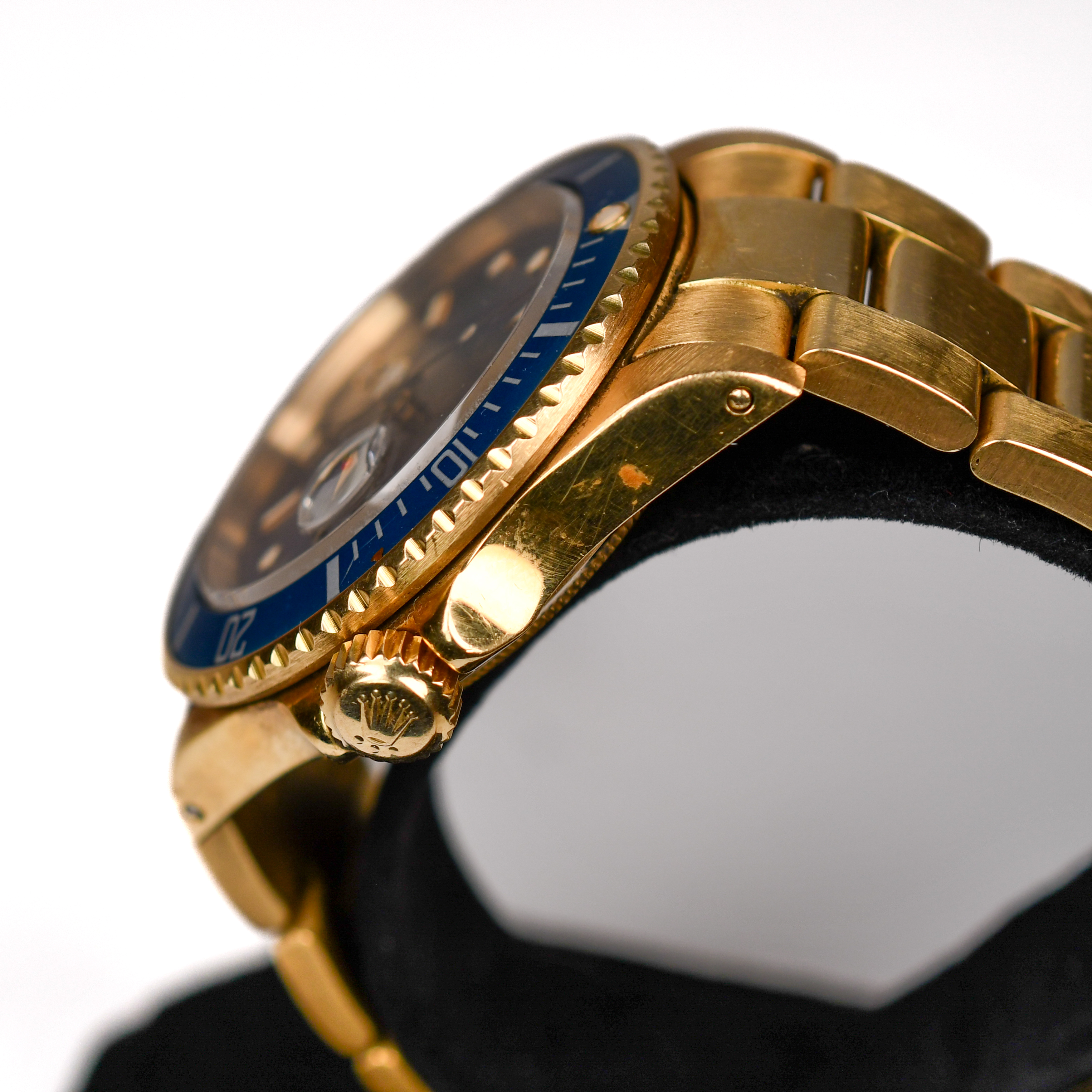 Case: 18k yellow gold oyster case with rotating faded blue bezel, Rolex triplock crown, oyster caseback