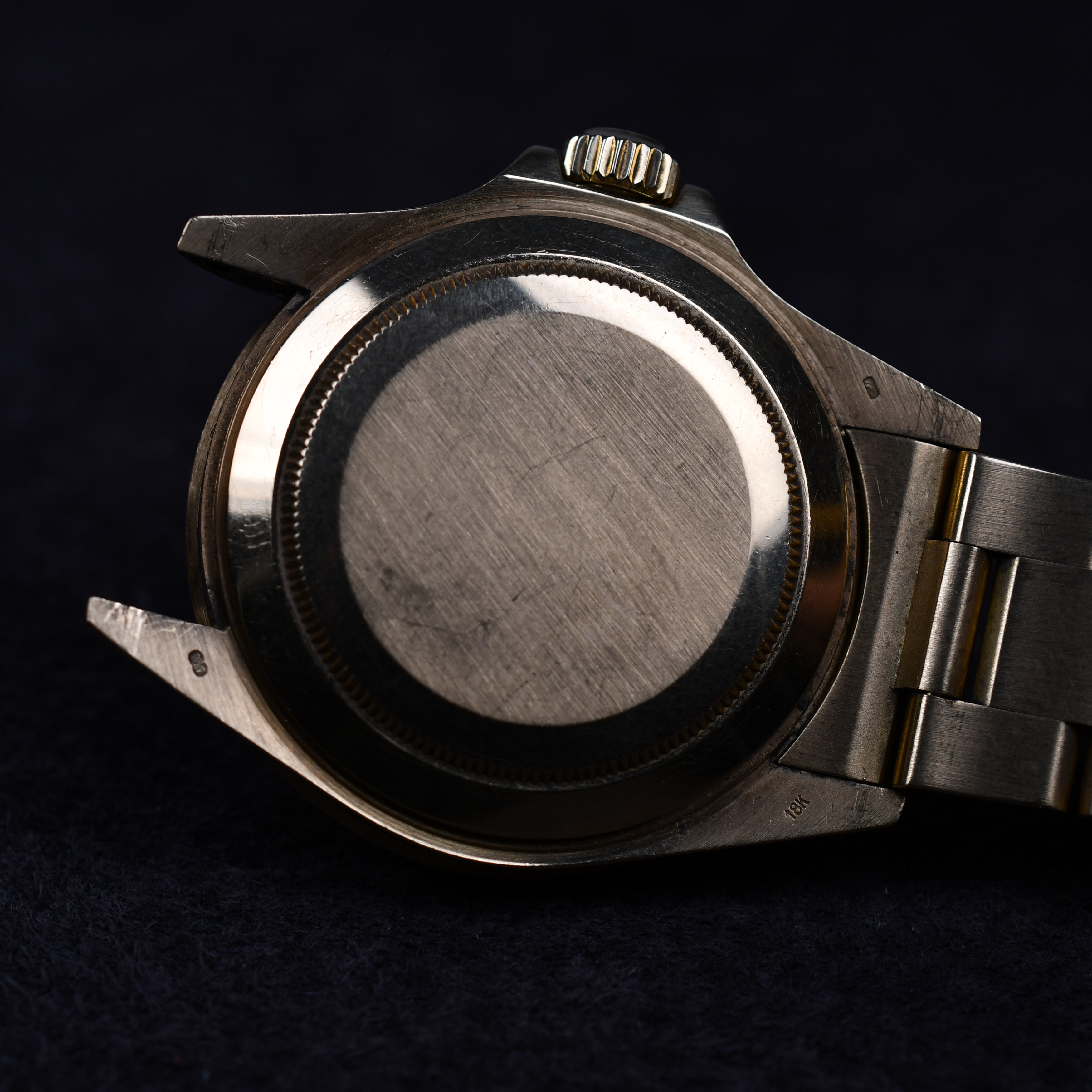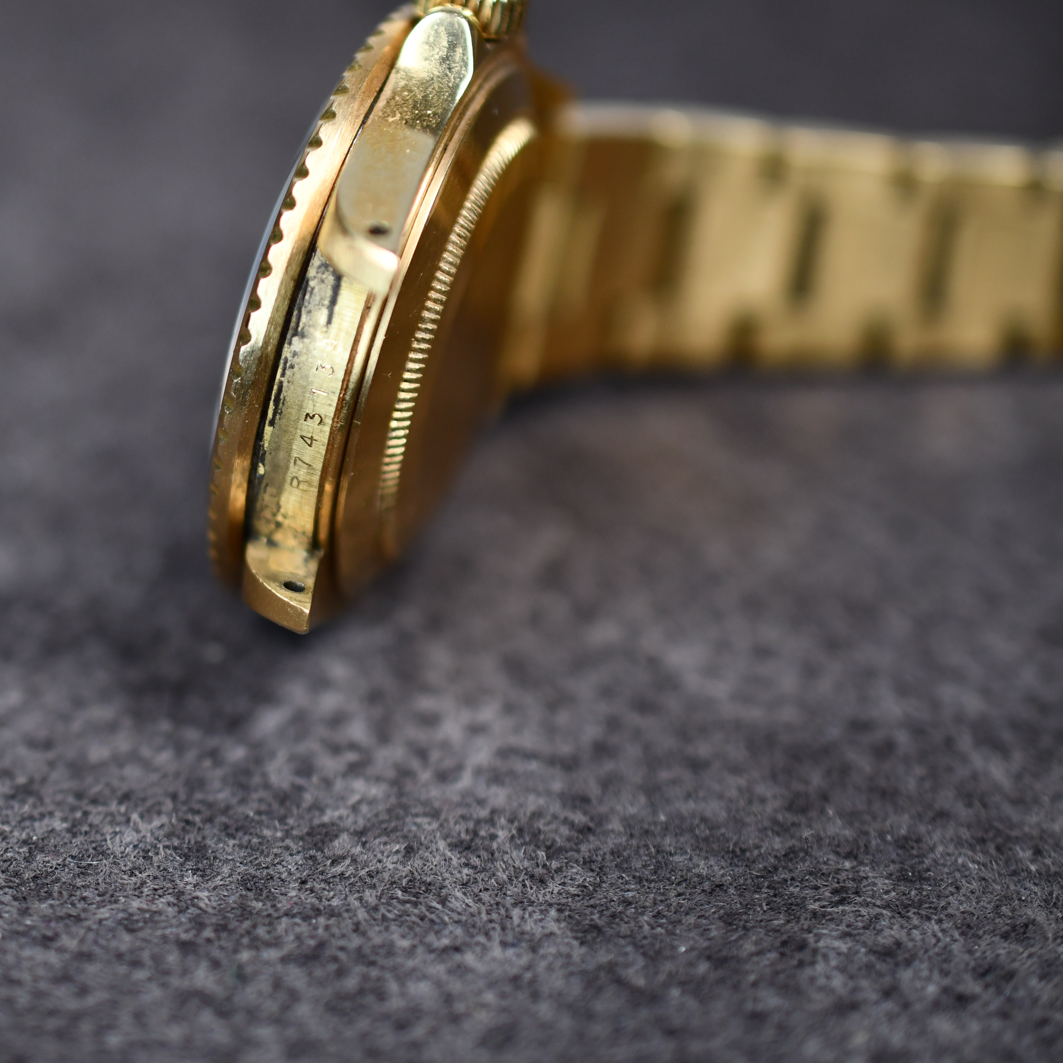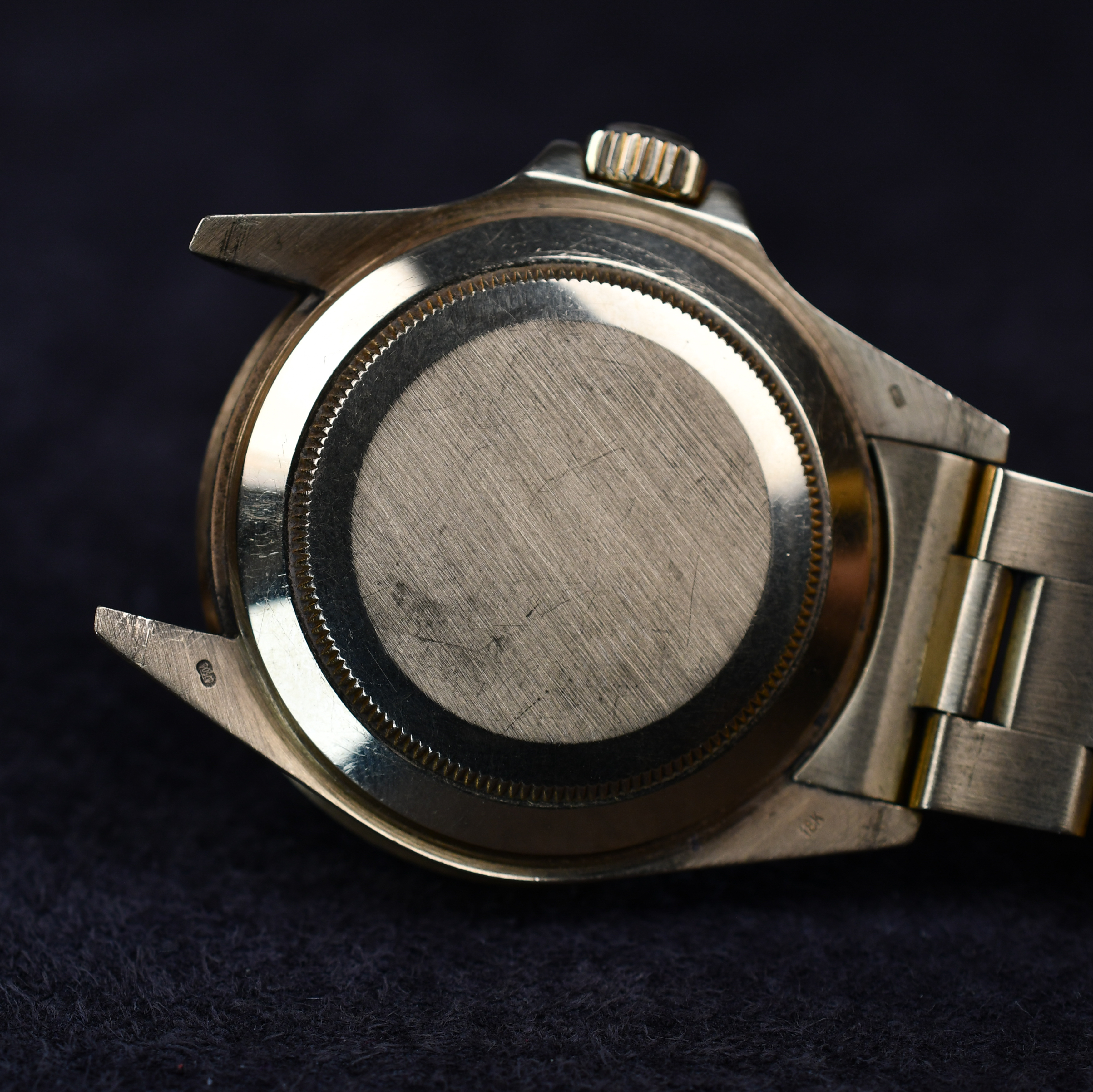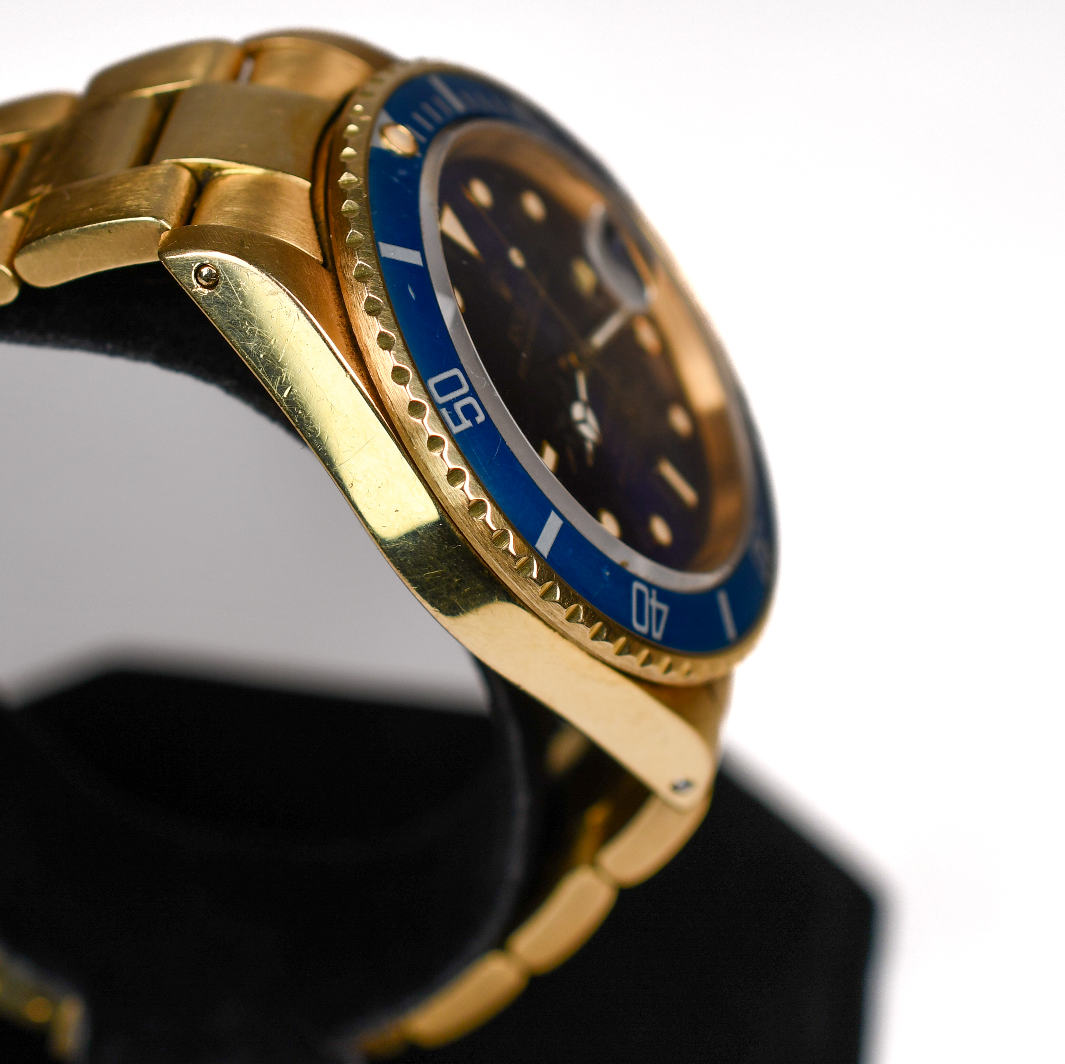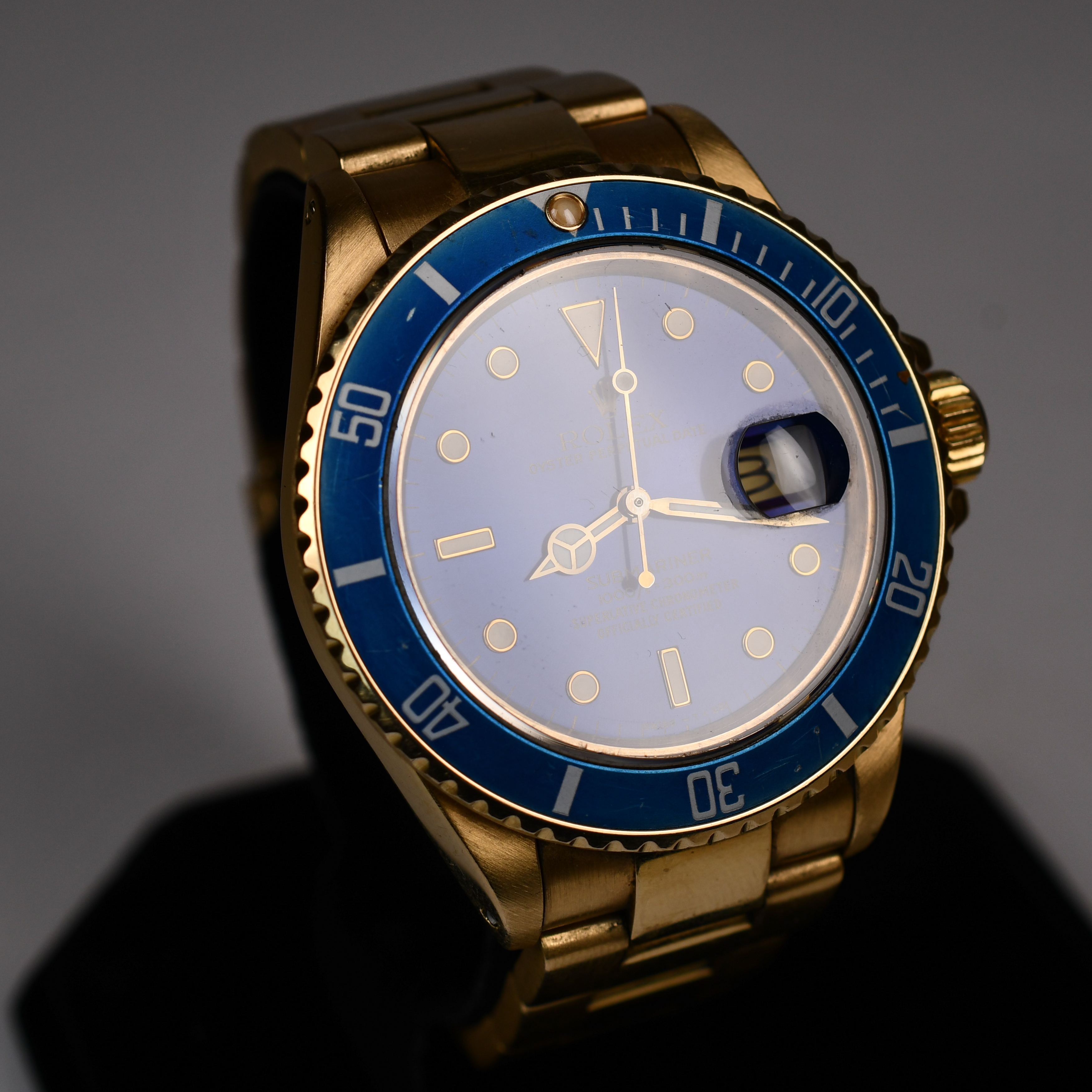 Case: 18k yellow gold oyster case with rotating faded blue bezel, Rolex triplock crown, oyster caseback