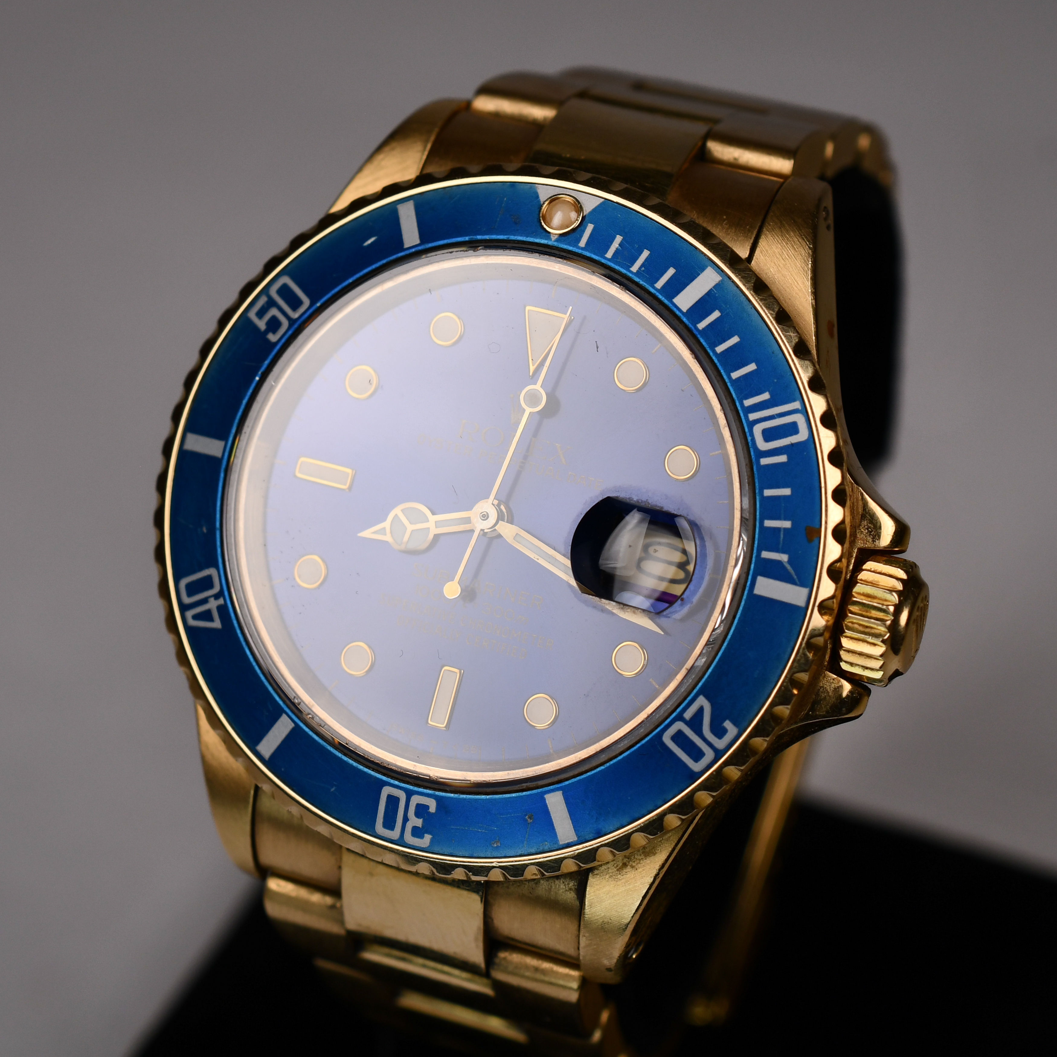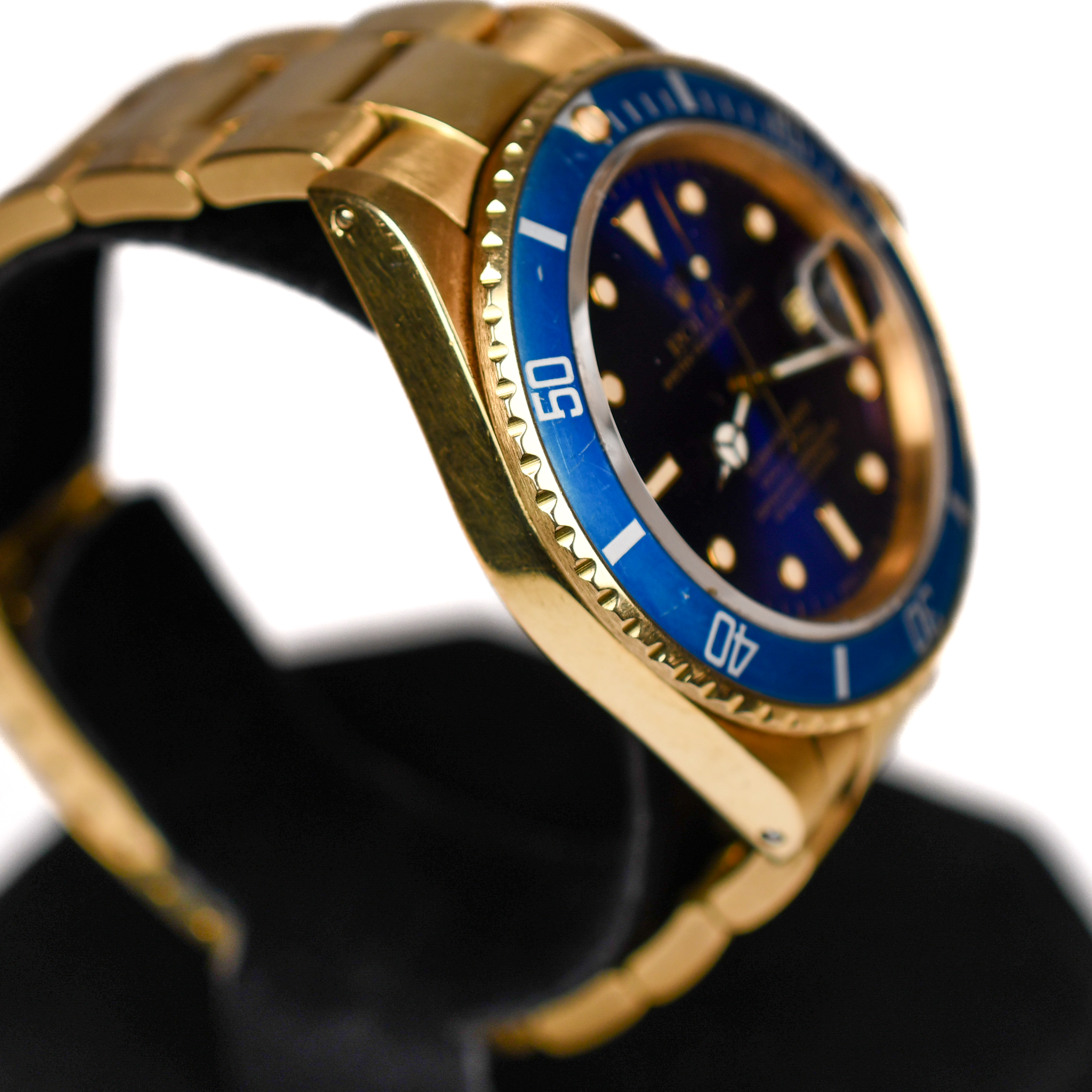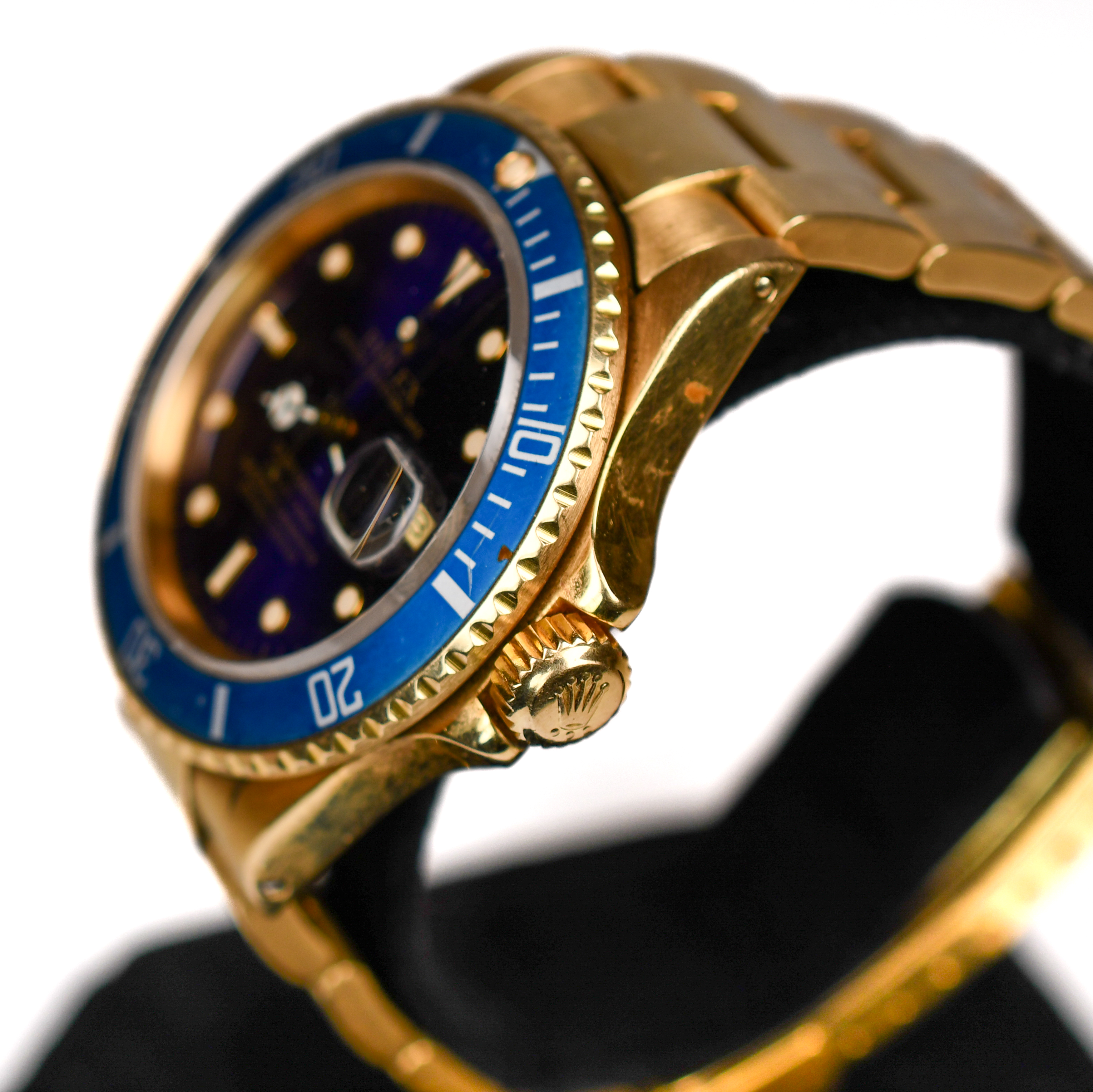 For auction is a 1988 Rolex Submariner ref. 16808 color change purple/blue dial and faded blue bezel caliber 3035 40mm. The Good: 1. Gorgeous color combination of a dial with blue to purple effects (depending on the light condition) and a faded sky blue bezel insert. 2. 16808's represent real value in the market; neo-vintage (its almost 40 years old) with the character of a patina dial but at a big discount vs. a modern gold sub. 3. Working and functioning correctly, +6 seconds per day and +265 amplitude. The Bad: 1. Watch only.