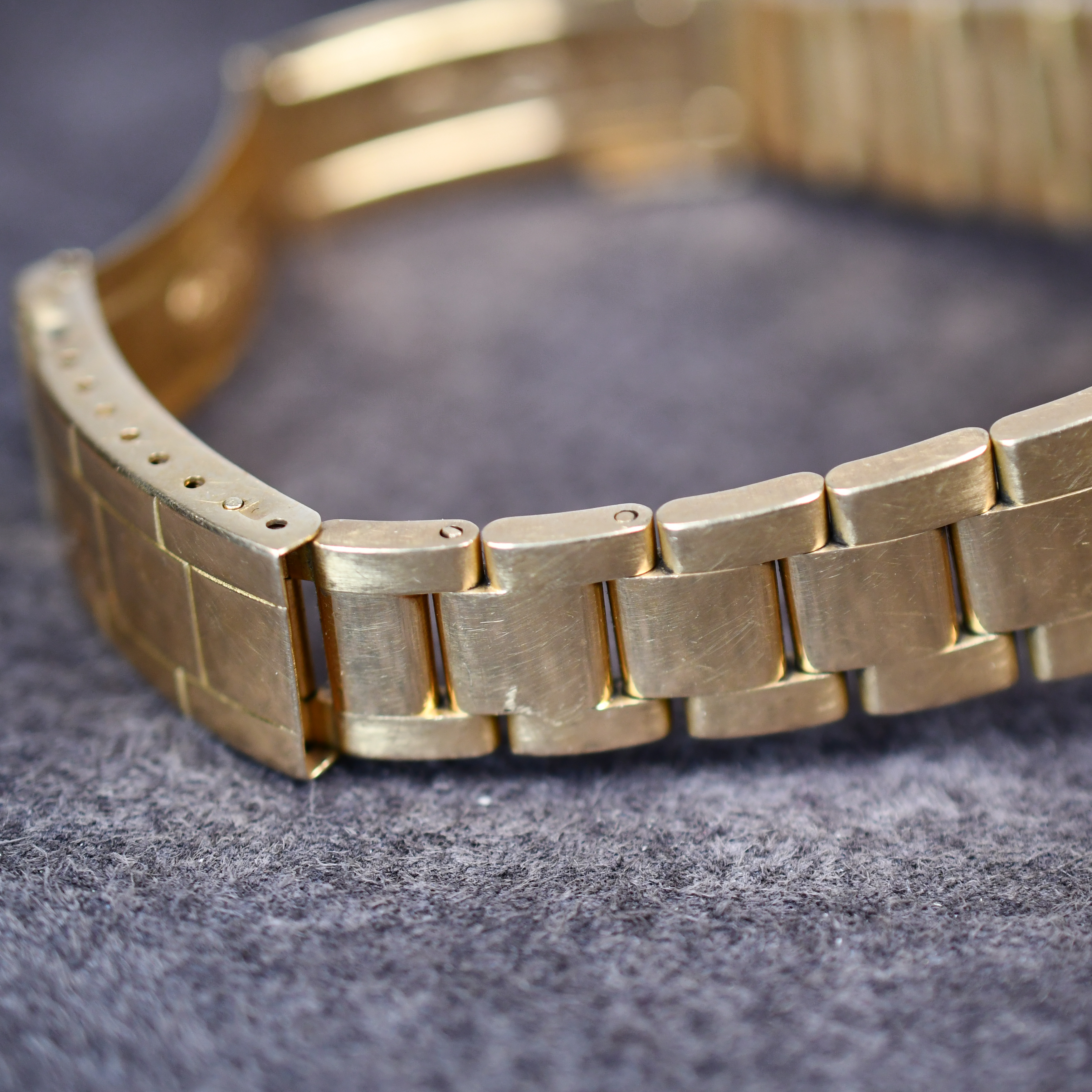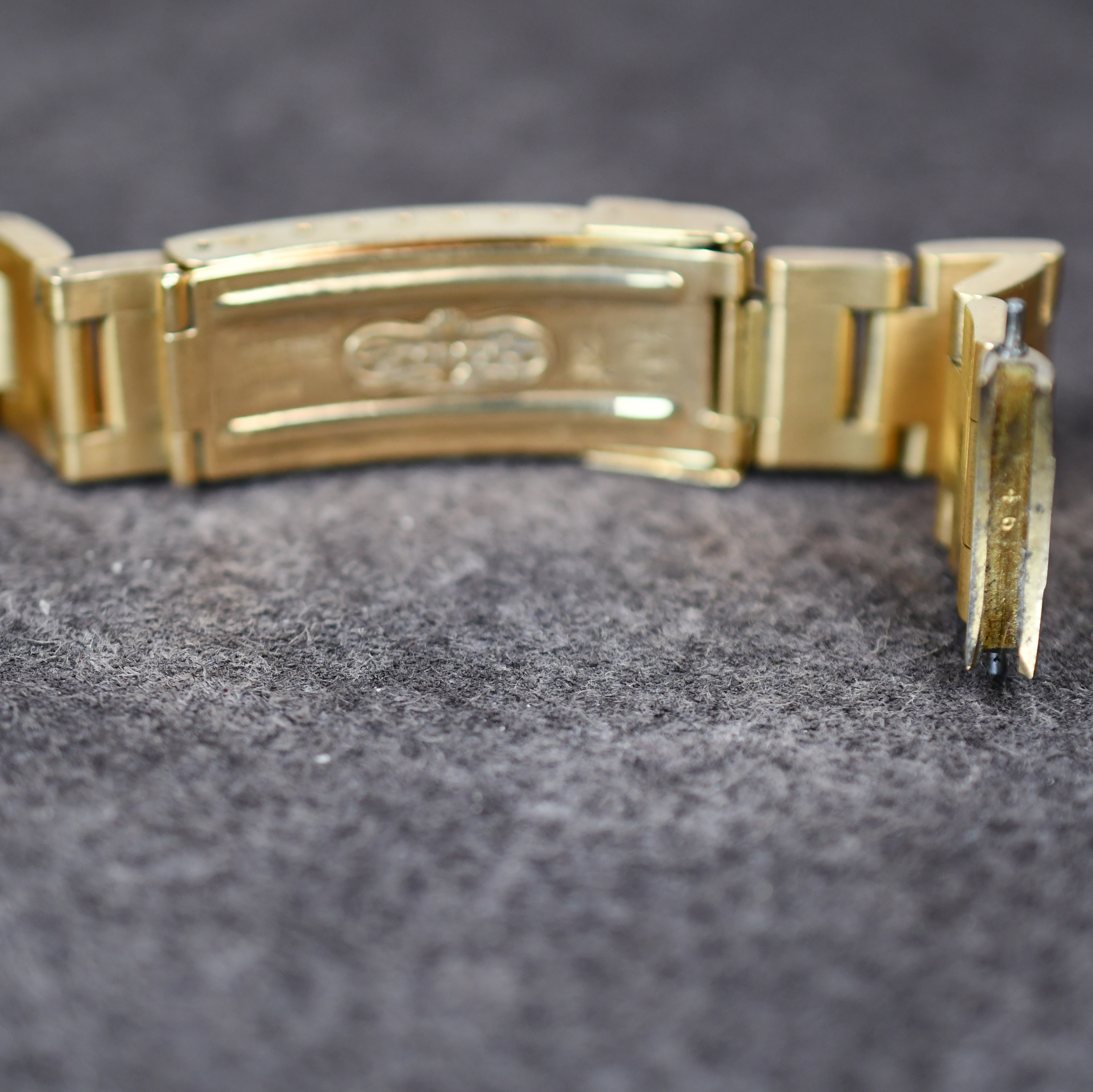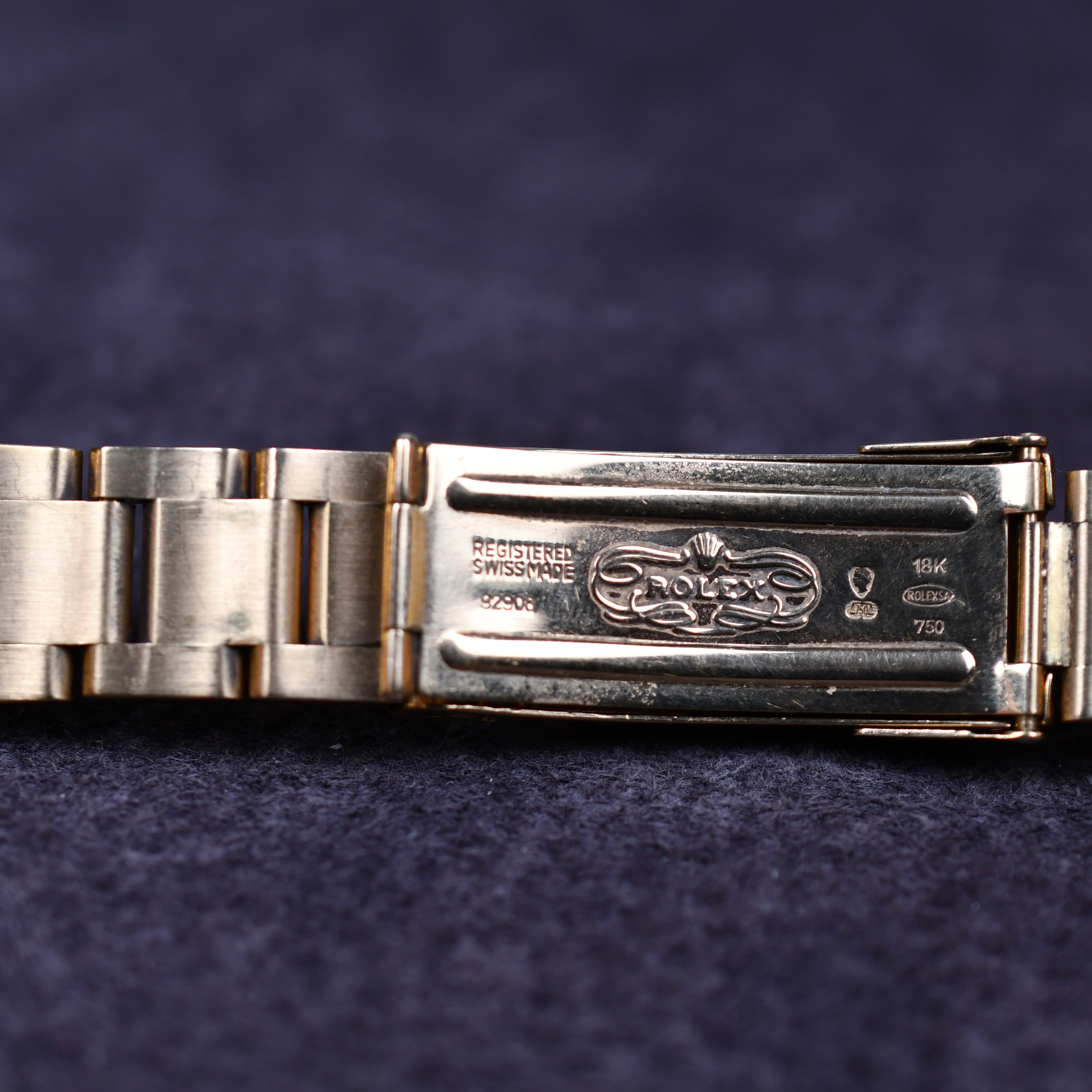 Strap/Bracelet: Rolex Oyster 18k with pin links, will fit up to roughly a 7.33" wrist