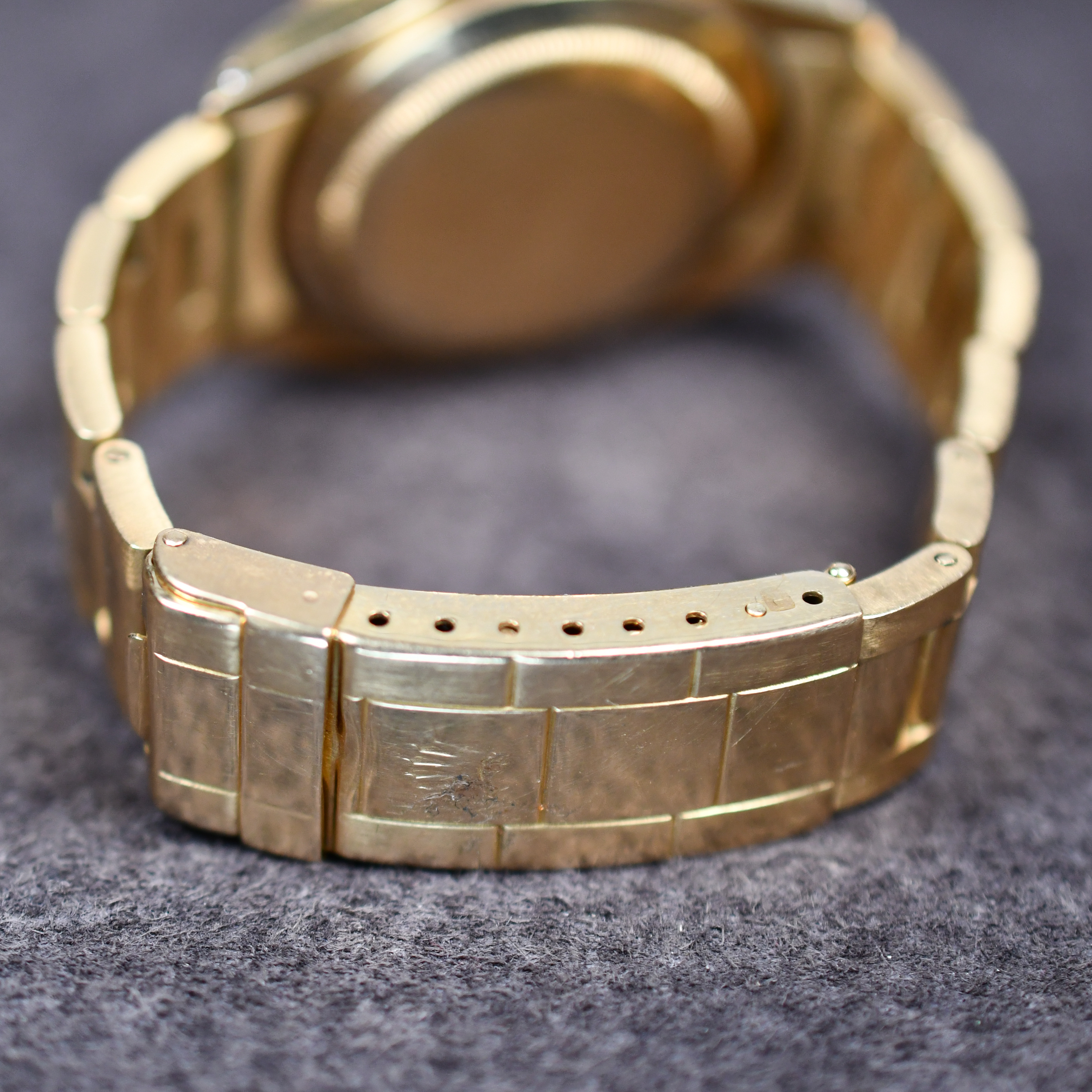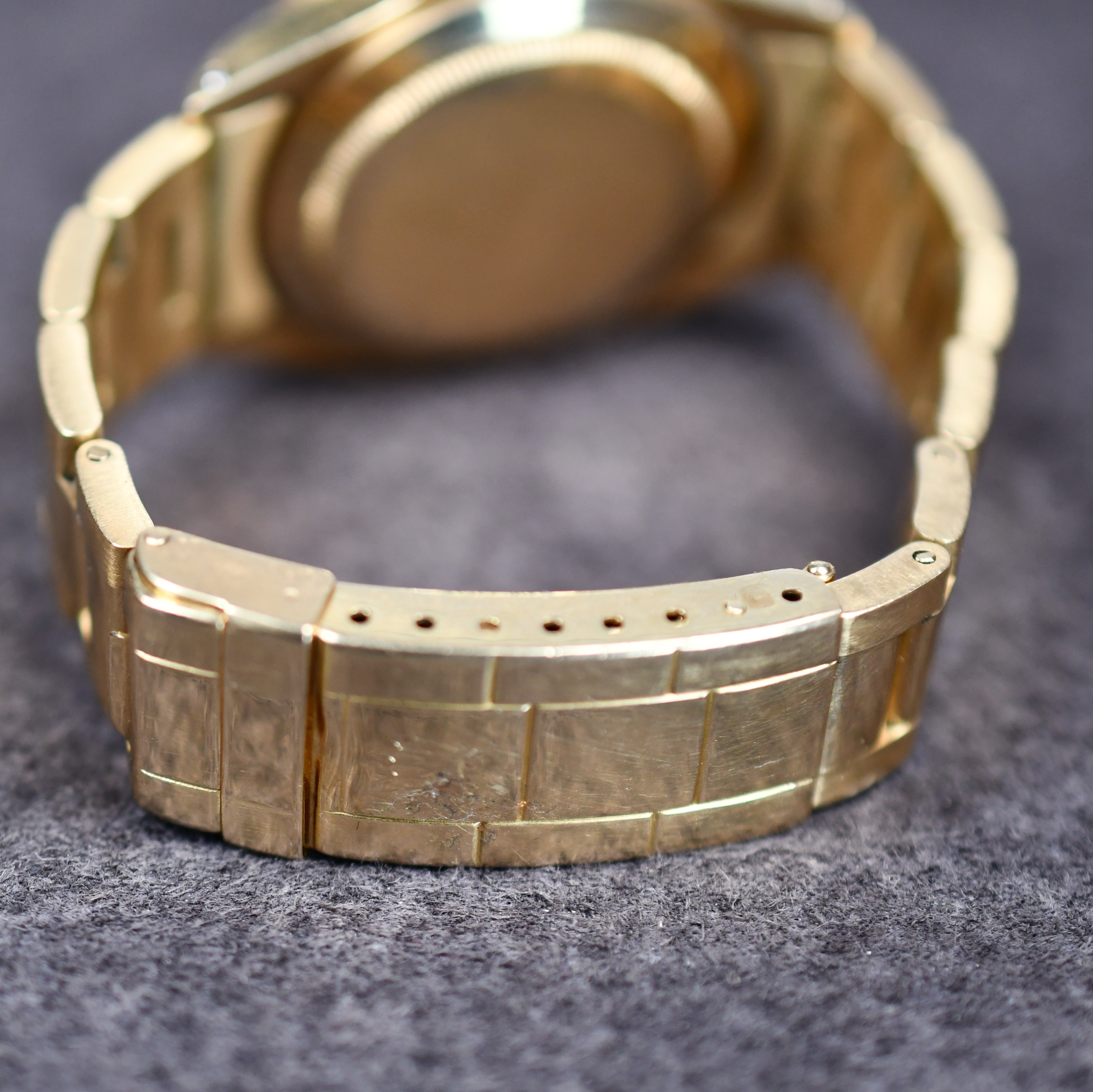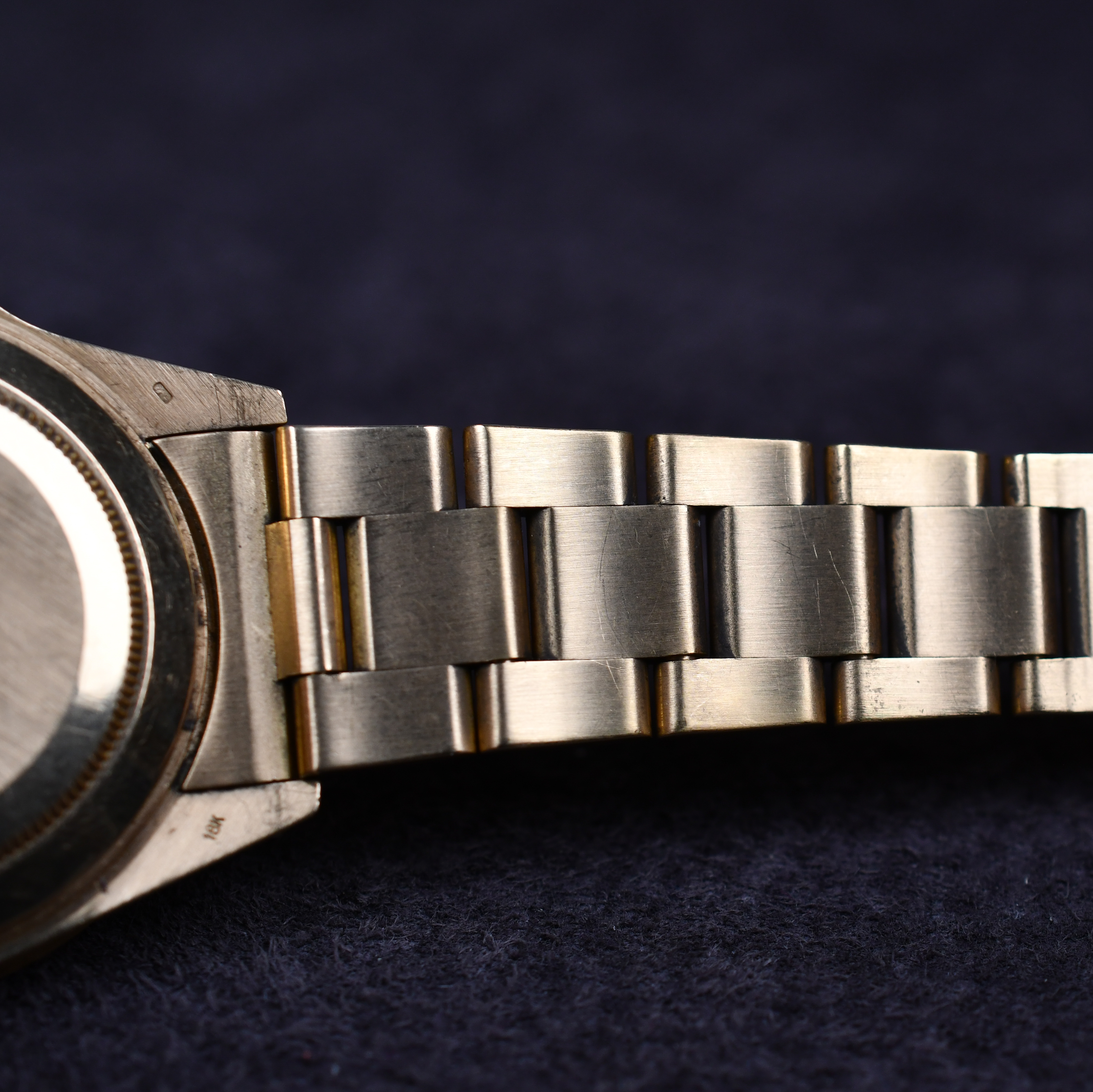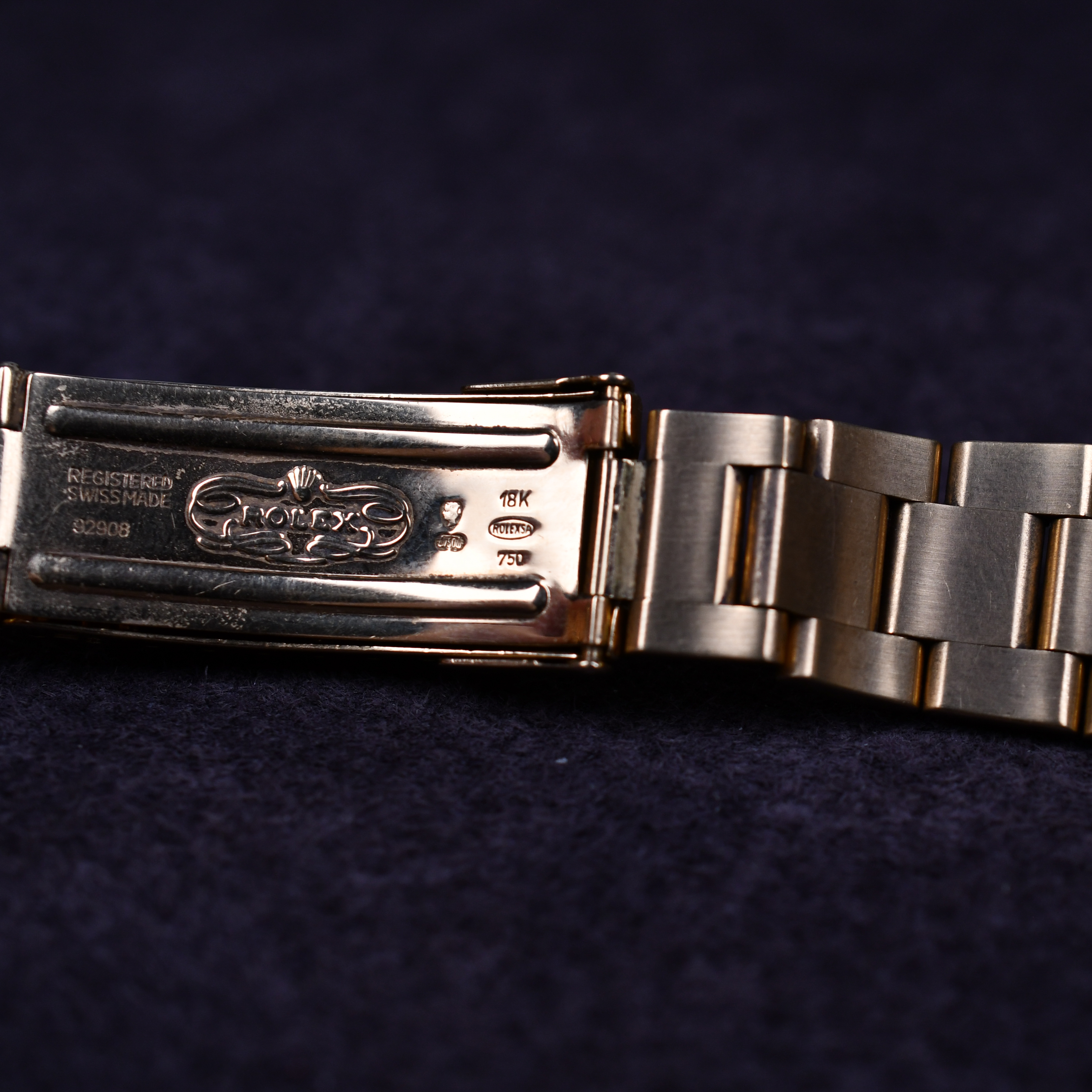 Strap/Bracelet: Rolex Oyster 18k with pin links, will fit up to roughly a 7.33" wrist