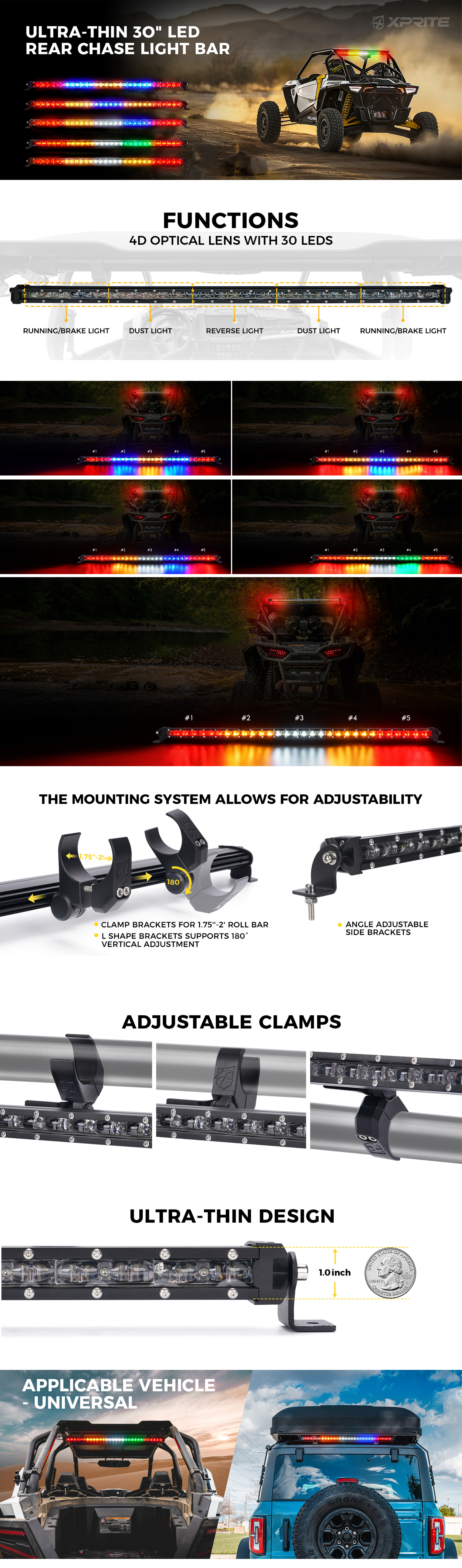 EATURES -LED Strobe Chase Bar for Off-Road UTV ATV SXS has a total of 5 blocks and 6 high power LEDs per block.Flood lens increase visibility & safety. You are sure to be seen in fog, rain, snow, or any other weather condition. Can endure harsh road conditions and extreme weather.