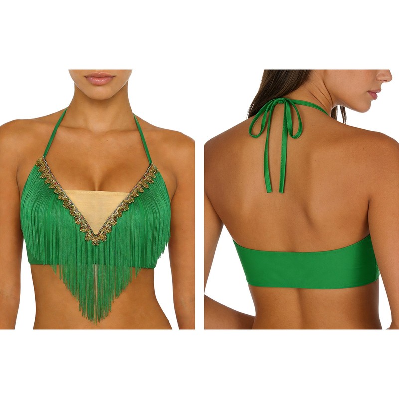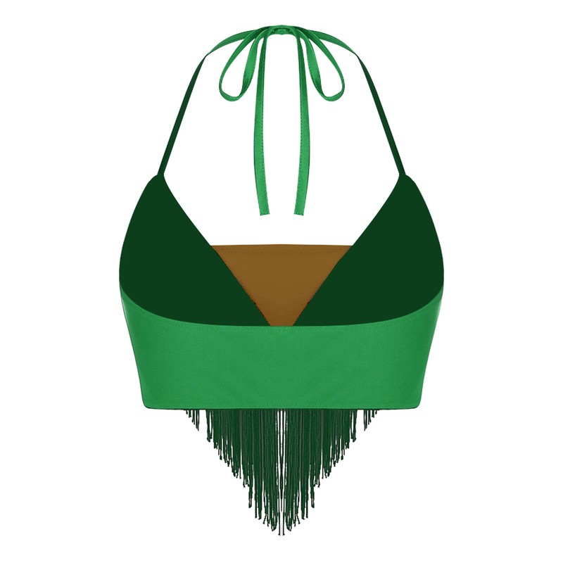 Keyhole cutout in the front, backless and halter neck design, tie closure at back.