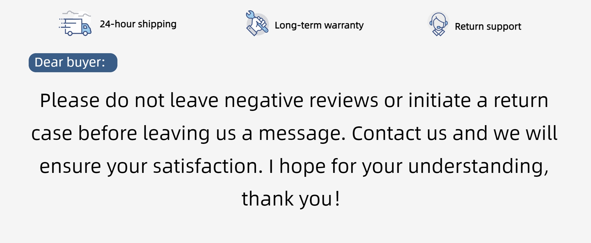 Dear buyer:Please do not leave negativefeedback or open returncase before you sent us amessage and we will makesure to make you satisfied