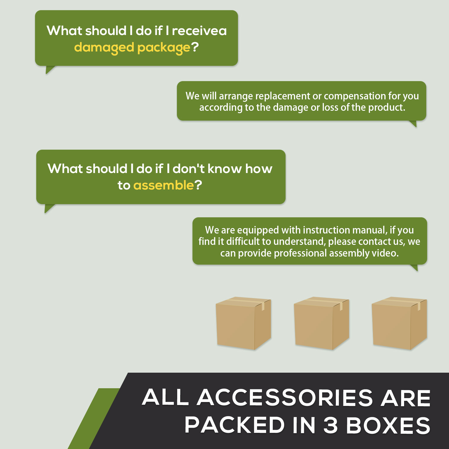 - If an item is damaged or missing parts, please photograph the issue and use the instruction manual to inform us of the part number and quantity. We will either reship the missing parts or issue a refund based on the situation.