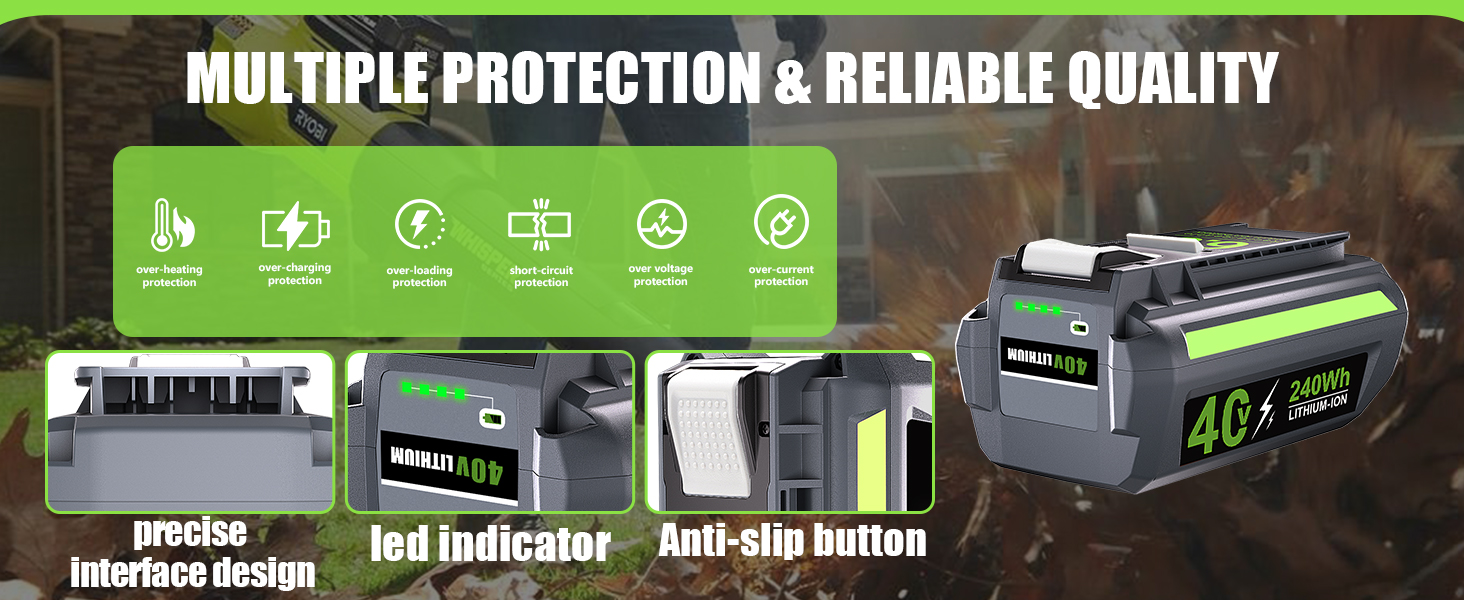 Compatible with Ryobi 40V cordless power tools (Please use the “Ctrl+F”)For RYOBI RY40180, RY40200, RY40201A, RY40202, RY40204, RY40400, RY40402A, RY40403, RY40411, RY40502A, RY40511, RY40601A, RY40LM30, RY40190, RY40430, RY40620, RY40460, RY40250, RY40770, RY40850, RY40610A, RY40210B, RY40240 (Exclude Tools Model: RY40002, RY40503)