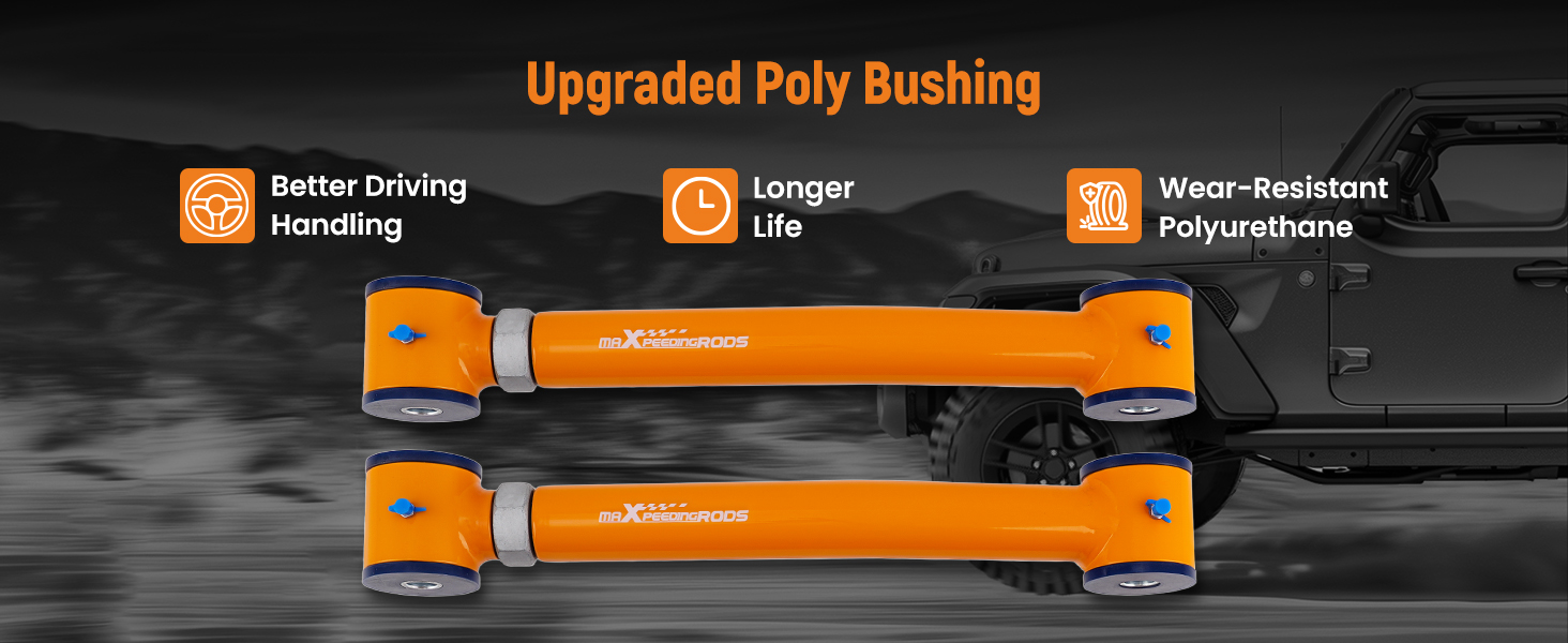 High-quality poly bushings reduce abnormal squeaks and vibrations while driving, eliminate uneven tire wear
